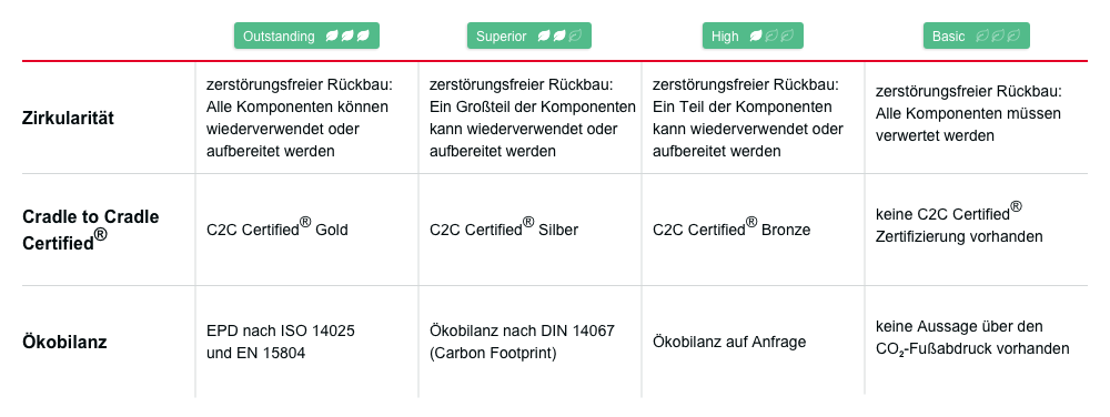 Dabei wurden die drei Kategorien Zirkularität, Cradle to Cradle Certified® und Ökobilanz als Anforderungen gewählt, an denen wir die Nachhaltigkeit unserer Produkte bewerten. Mithilfe von Produkten und Systemen welche zirkulär geplant und gebaut werden können, können wertvolle Ressourcen geschont werden. Cradle to Cradle Certified® zeichnet dabei die Zirkularitätsfähigkeit aus. Nicht zu vernachlässigen sind die entstehenden Treibhausgase, weshalb durch eine Ökobilanzierung hierfür Kennzahlen geschaffen werden.