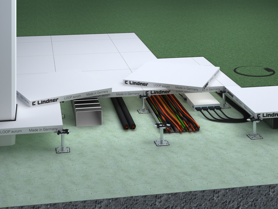 Die auf fünf Seiten aufbereiteten Doppelbodenplatten bestehen aus Calciumsulfat. LOOP aurum kommt dabei ohne Kantenbänder und unterseitiger Applikation aus. Selbstliegende Bodenbeläge werden auf der Baustelle verlegt.