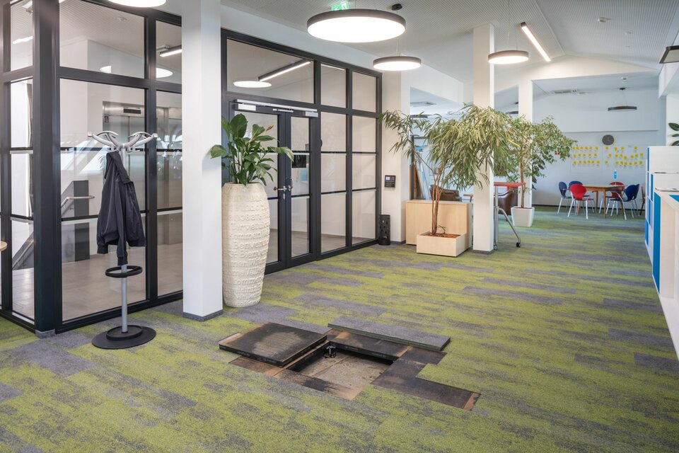 Die aufbereiteten Doppelbodenplatten bestehen aus hochverdichteten Holzwerkstoffplatten, sind unterseitig mit Stahlblech beklebt und umlaufend mit Kantenschutz gegen Stoß und Feuchte versehen.