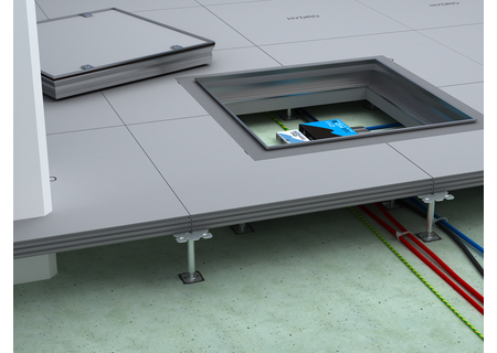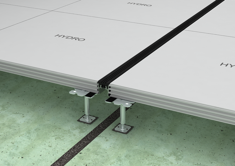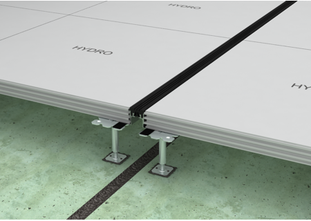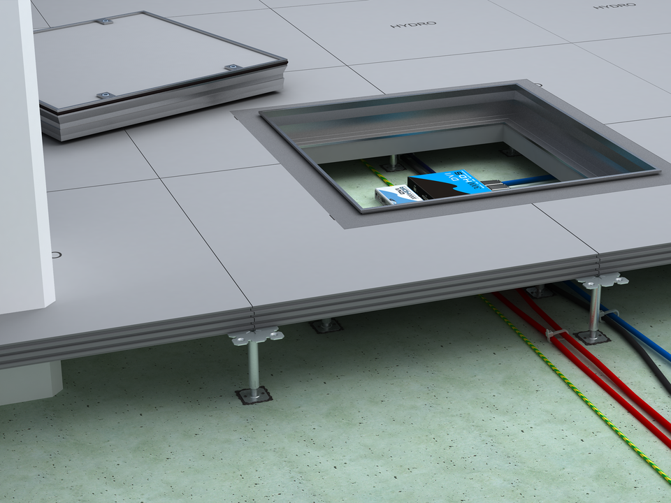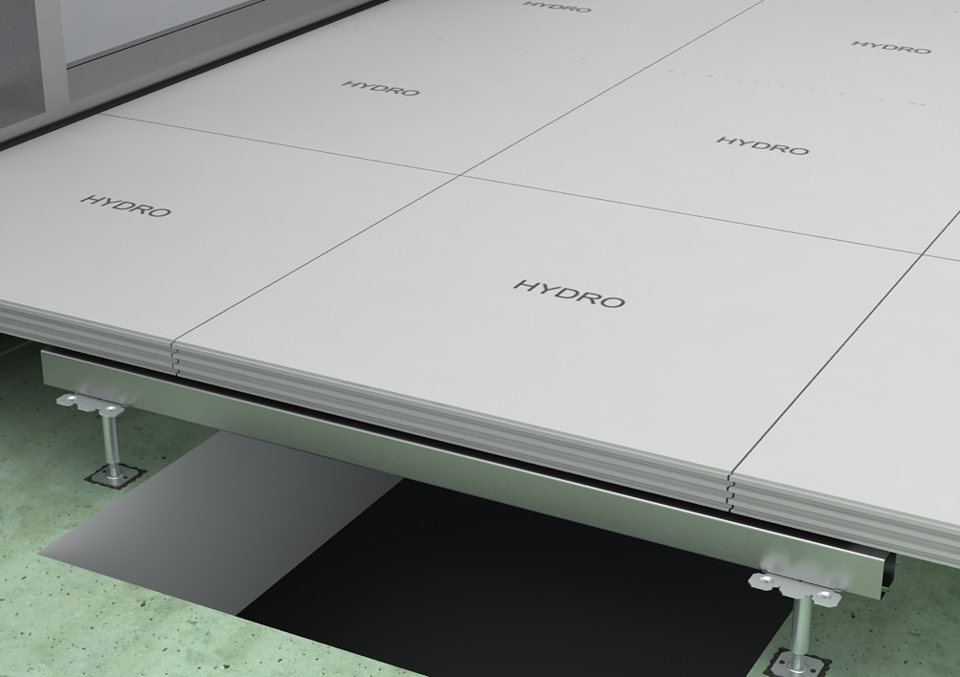 Der Trockenhohlboden HYDRO power wurde speziell für Schwerlastbereiche und für Flächen mit erhöhtem Feuchtigkeitseintrag entwickelt. Das feuchtebeständige Bodensystem besteht aus hochverdichteten Zementfaserplatten mit optimierter Plattenrezeptur, die die Wasseraufnahme effektiv verhindern. Die Verklebung der HYDRO power Platten erfolgt über eine Verzahnfräsung an den Kanten der Platte, wodurch eine geschlossene Tragschicht entsteht.