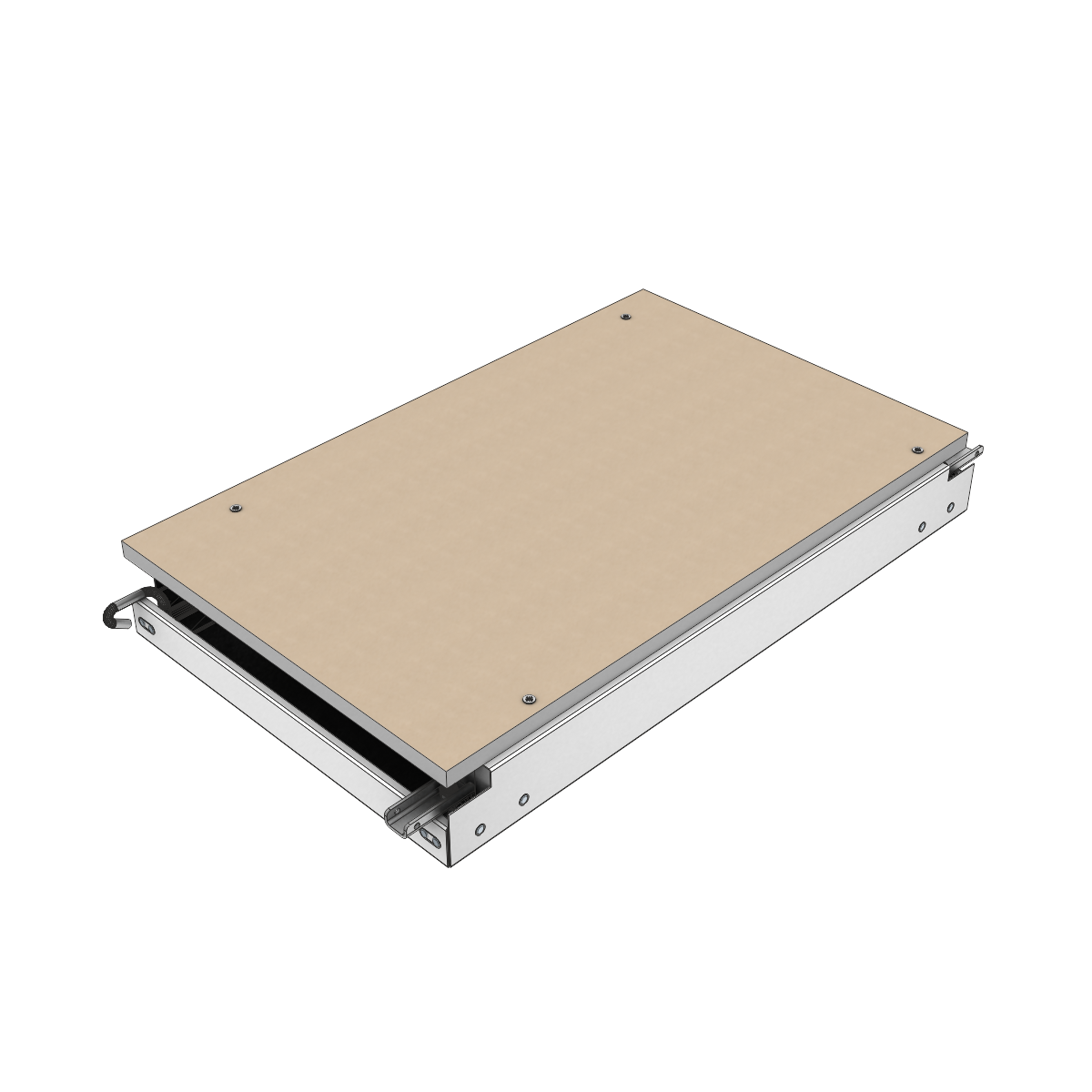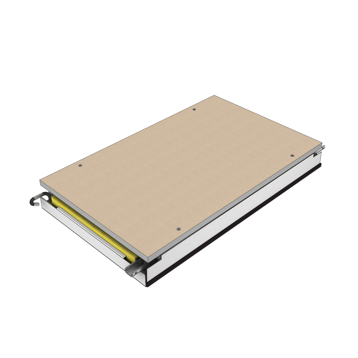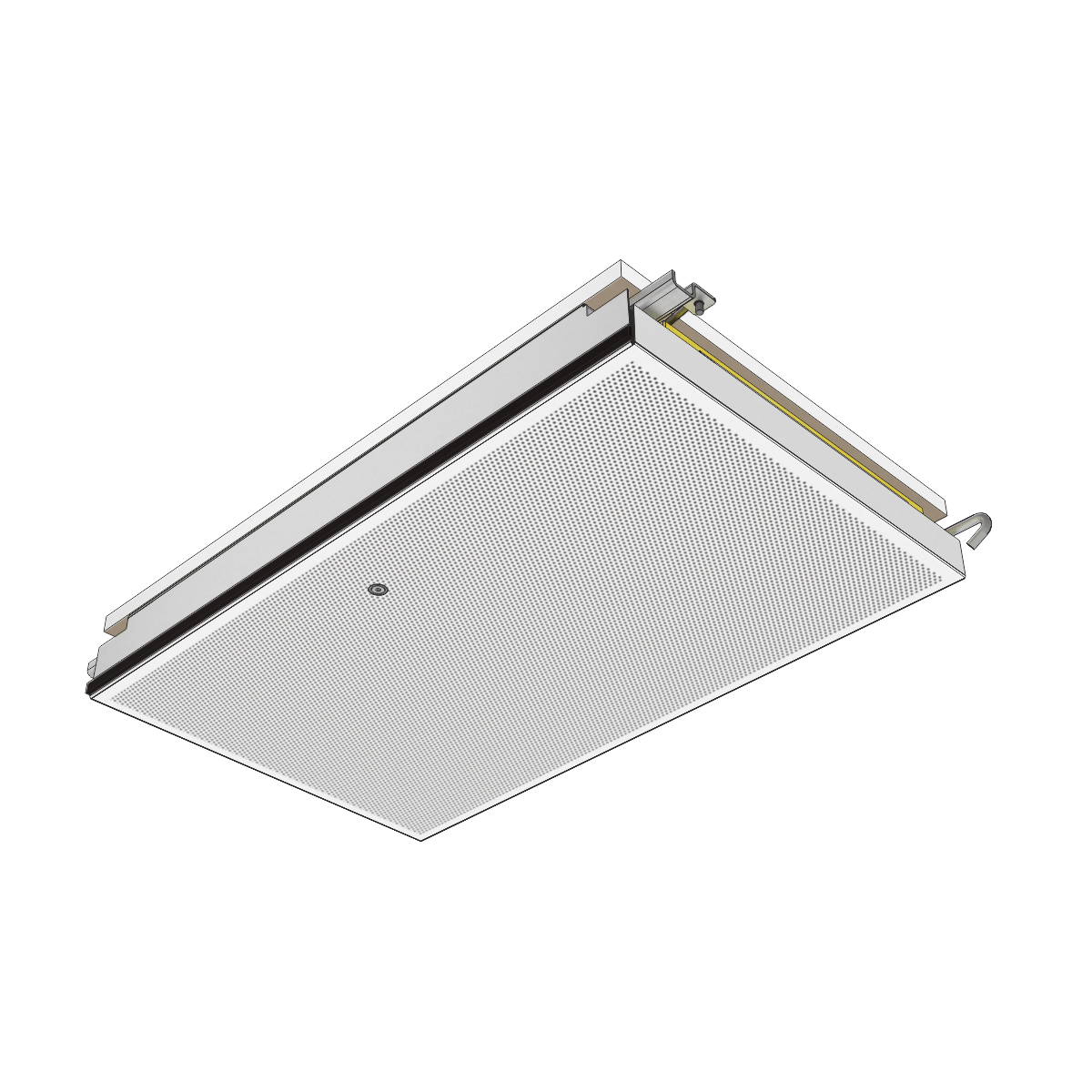 Die Deckenelemente, mit oder ohne Mineralwolle, sind in G-Profile gelagert und können mit einem Demontagewerkzeug einzeln abgeklappt und verschoben werden – ohne zusätzlich notwendigen Deckenhohlraum. Durch Zusammenschieben von bis zu drei Deckenelementen wird eine große Öffnung für Revisionsarbeiten erreicht.