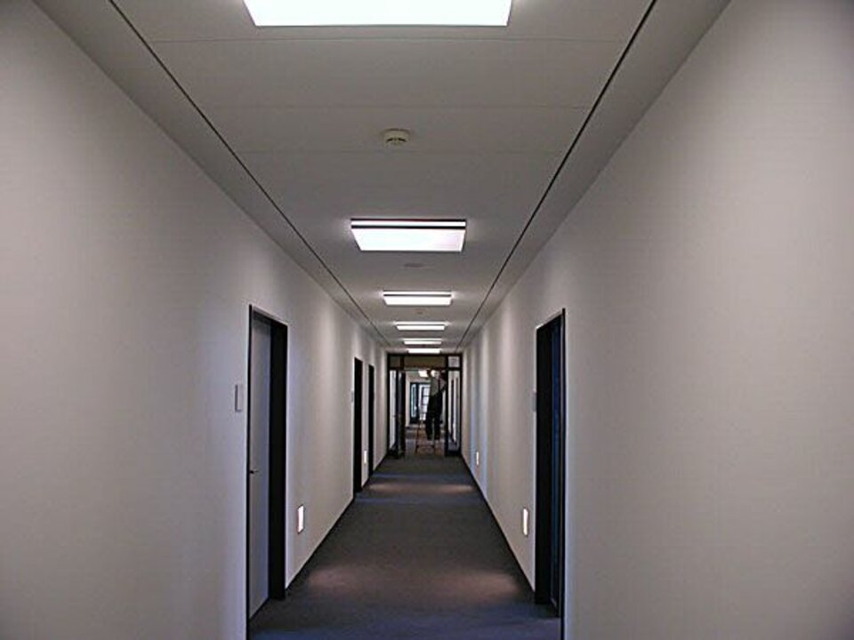 Die Deckenelemente dieser Brandschutzunterdecke sind beidseitig in Tragschienen eingehängt und können werkzeuglos abgeklappt und entlang der Flurlängsrichtung verschoben werden. Hierfür ist kein zusätzlicher Deckenhohlraum erforderlich. Diese Brandschutzunterdecke ermöglicht einen guten Toleranzausgleich an der Wand.
