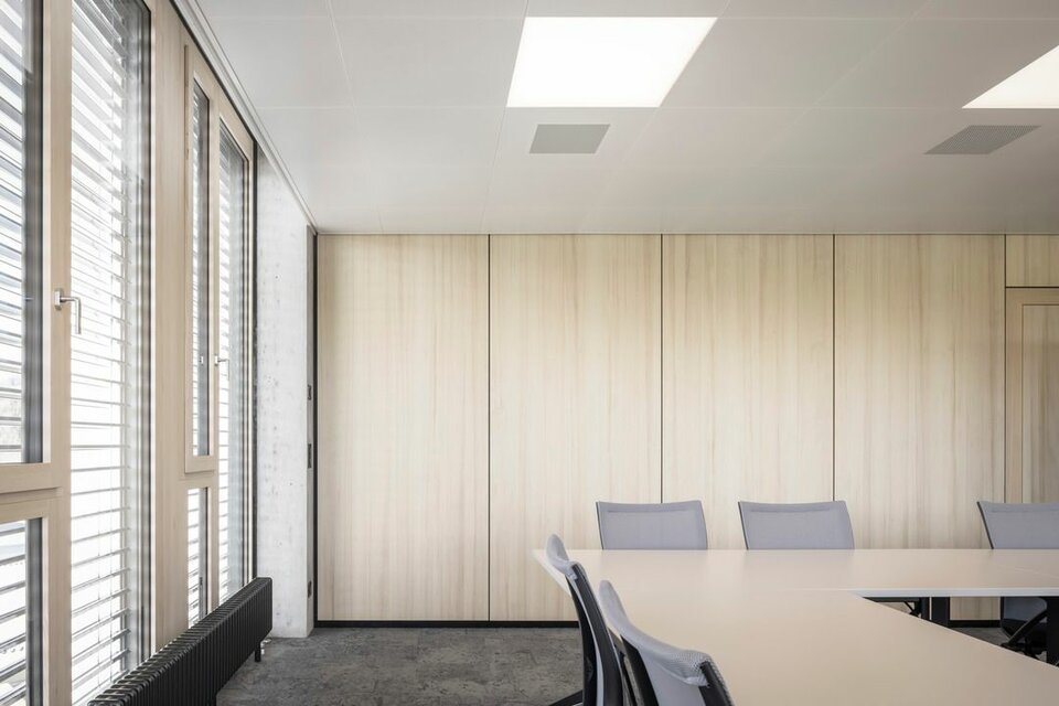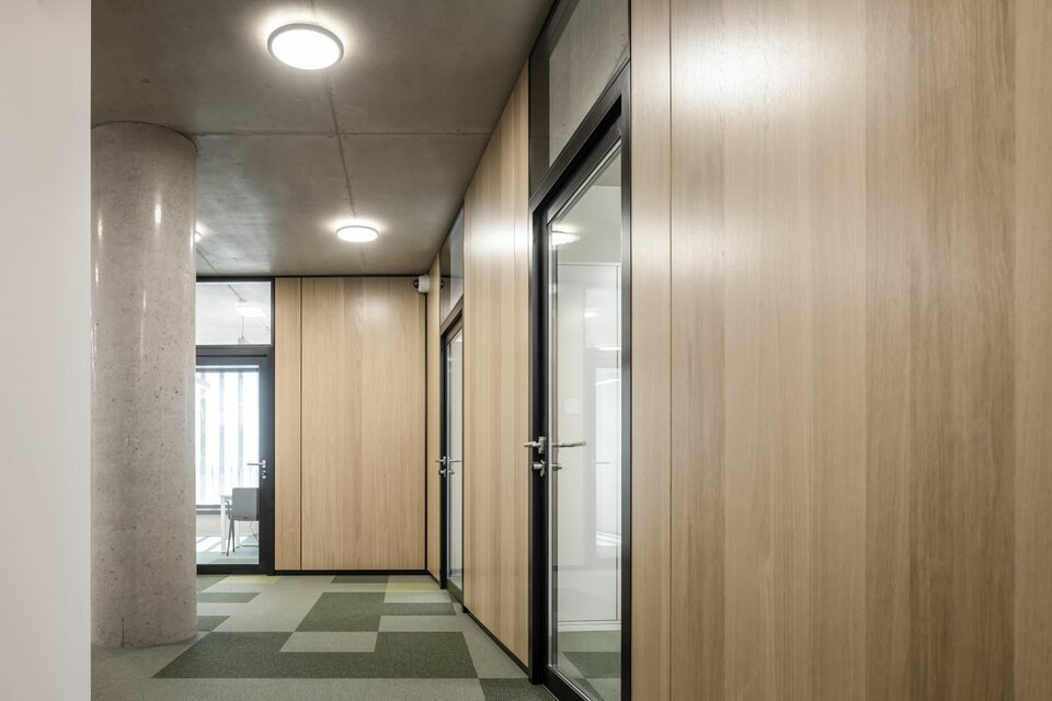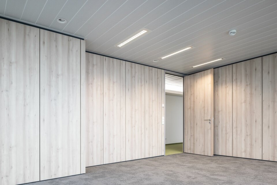Die Systemtrennwand aus Holz lässt sich auch während des laufenden Geschäftsbetriebs jederzeit versetzen.
