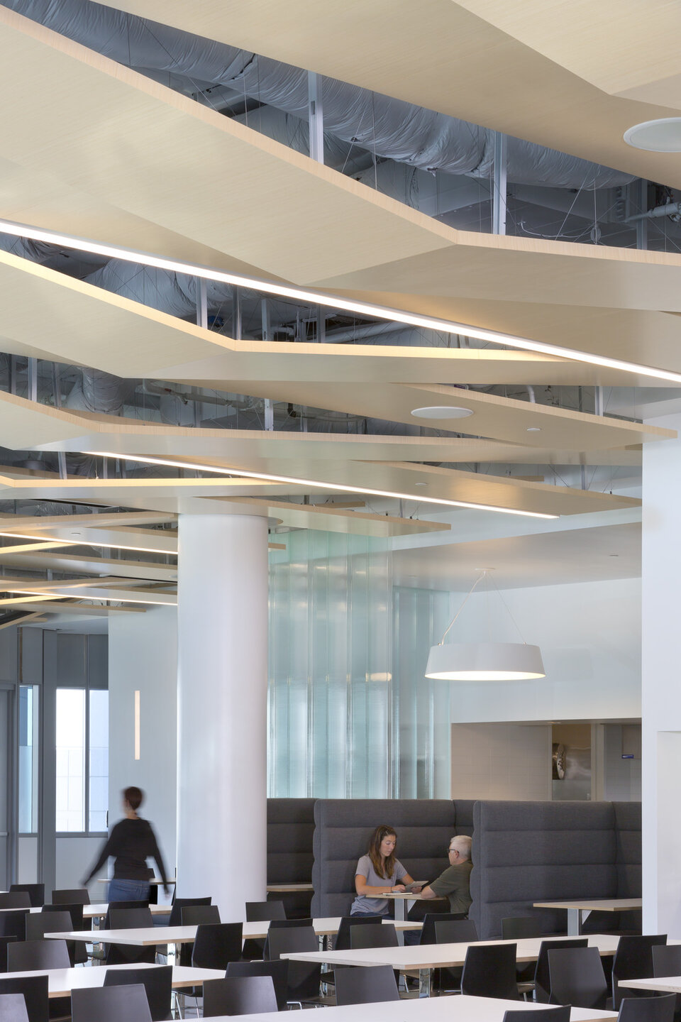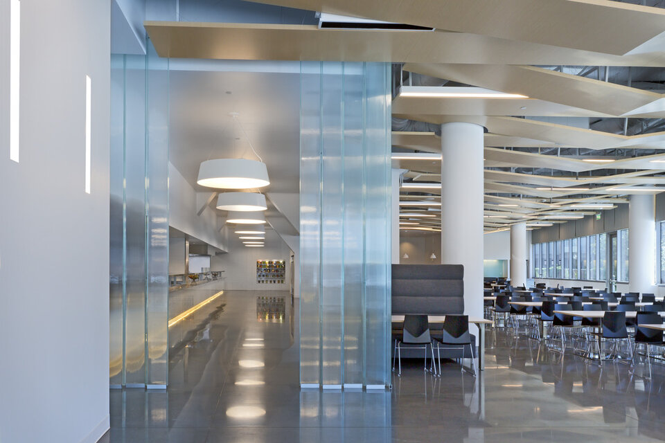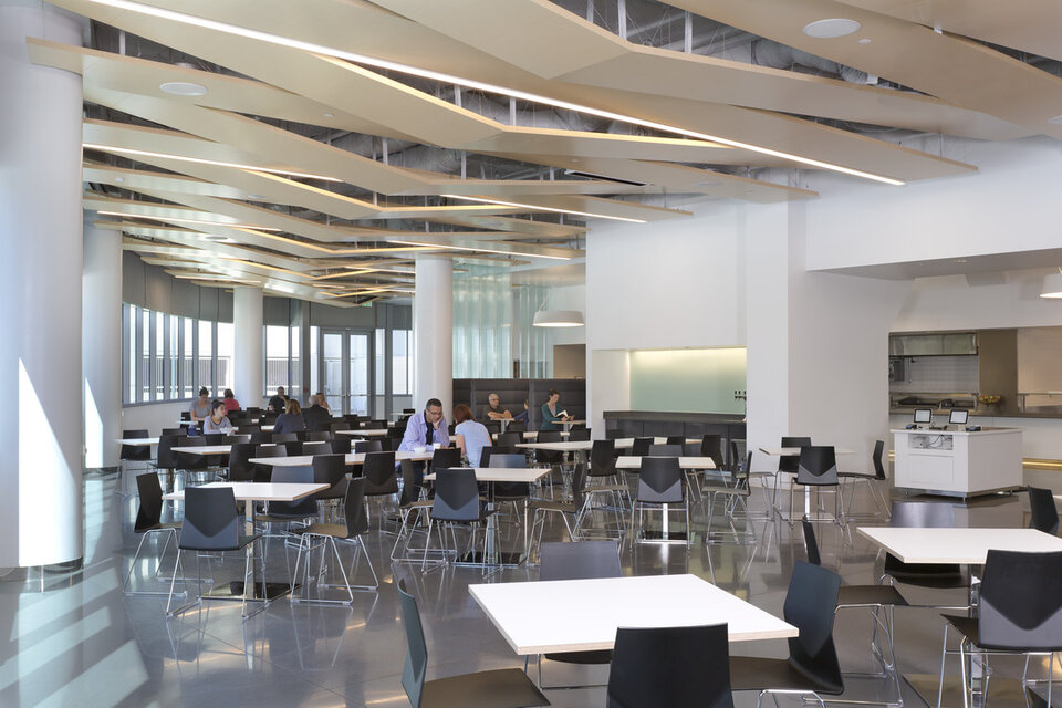 Lindner trug mit leichten Bodenplatten des Typs Comp+ mit Mikroperforierung und Holzoptik zum Innenausbau des Apple Cafés bei. Diese Elemente behalten selbst bei großflächiger Ausführung ihre Statik bei und sind vergleichsweise leicht. Das System wurde speziell entworfen, um unabhängig aufgehängte, segelartige Paneele hinzufügen zu können und dabei seismischen Anforderungen zu entsprechen.