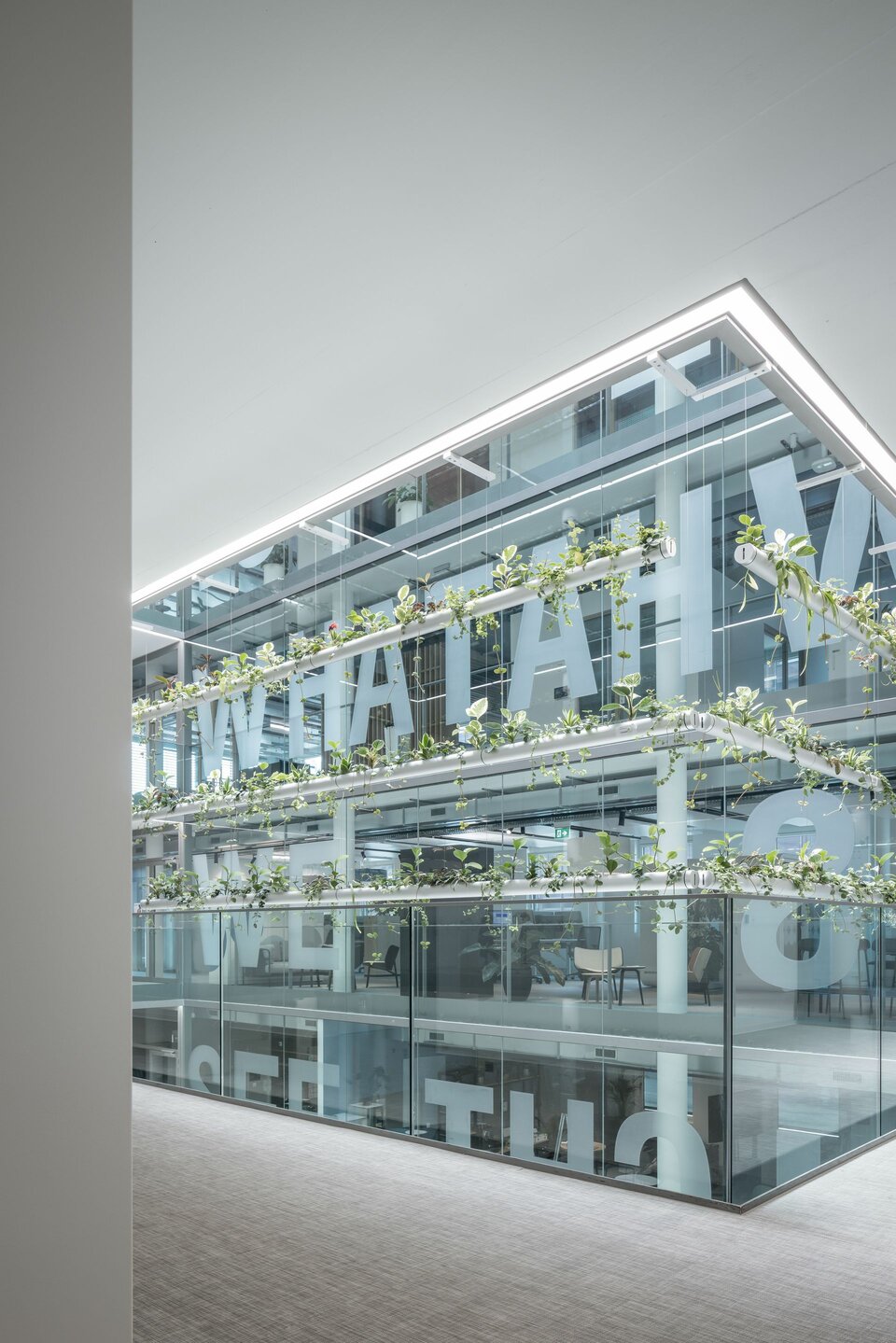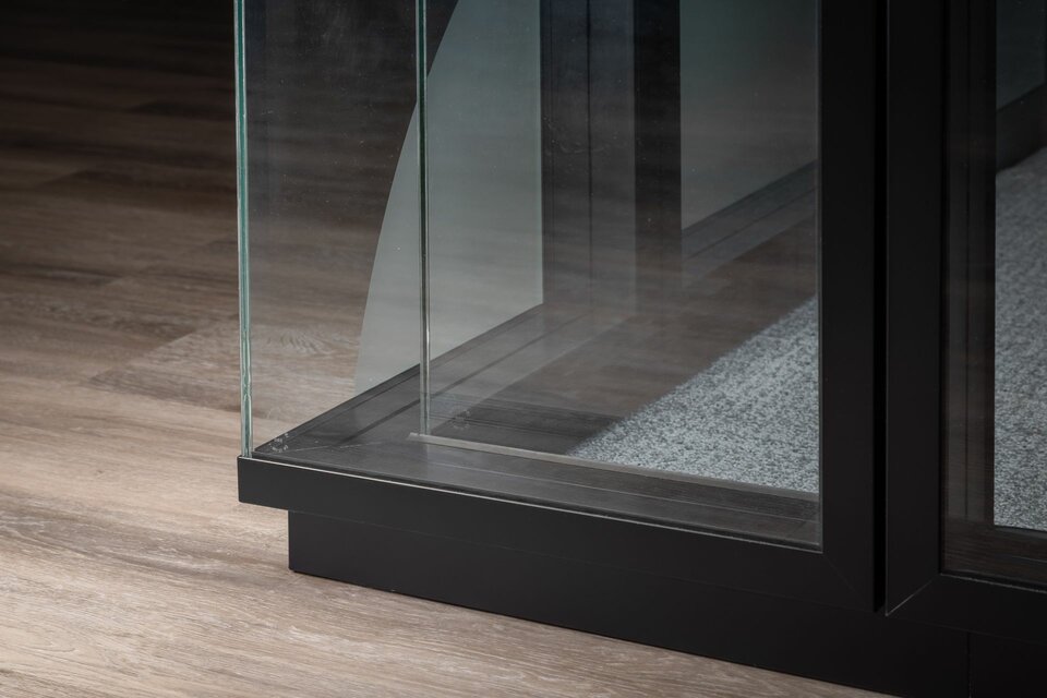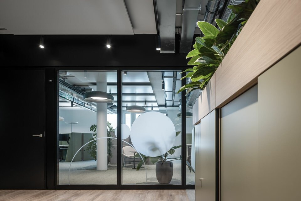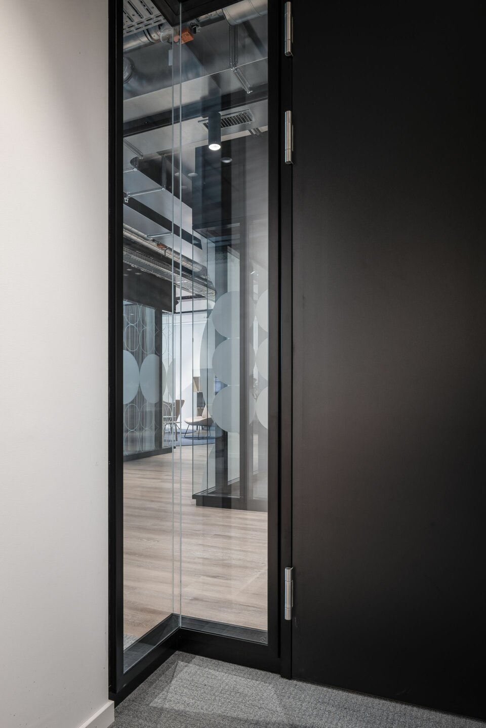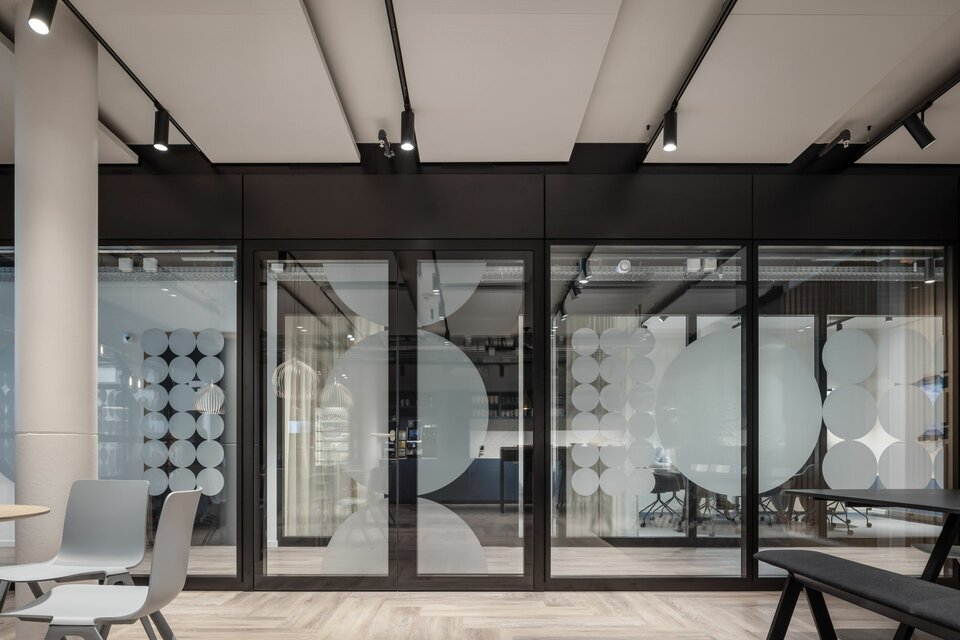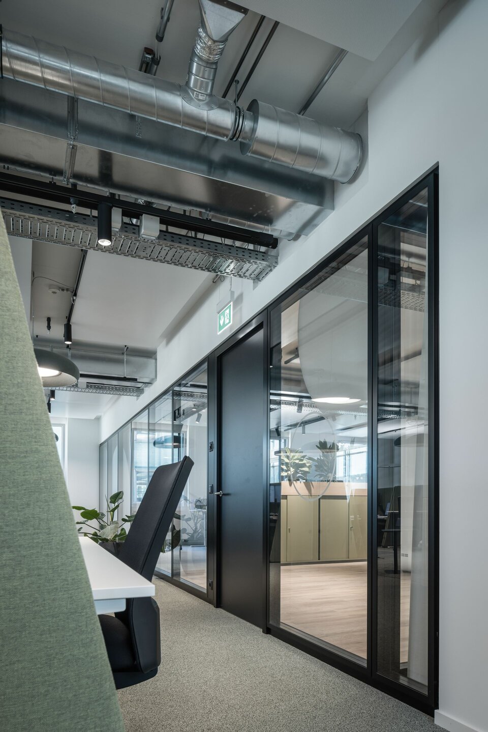 Die Lindner Group war im Ausbau des Projekts tätig und erweiterte die Innenräume um einige architektonische Highlights: Die Systemtrennwand Lindner Life Stereo 125 wurde mit schwarzem Rahmen und Ganzglasecken ausgeführt. Letztere brachten einige Herausforderungen in Bezug auf Transport und Einbringung ins Gebäude mit sich – doch die fachgerechte Montage lohnte sich und führte zu einem modernen, außergewöhnlichen Ergebnis. Die Holztrennwand Lindner Logic 100 Timber fungiert als warmer Kontrast zu den eleganten Glastrennwänden. Ergänzt wurde der Innenausbau durch die zweiflügeligen Ganzglastüren GTB 100 - Typ 3 und durch die einflügeligen Holztüren HTB 68 von Lindner.