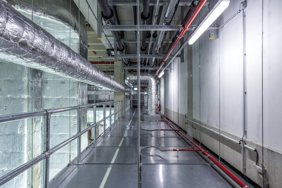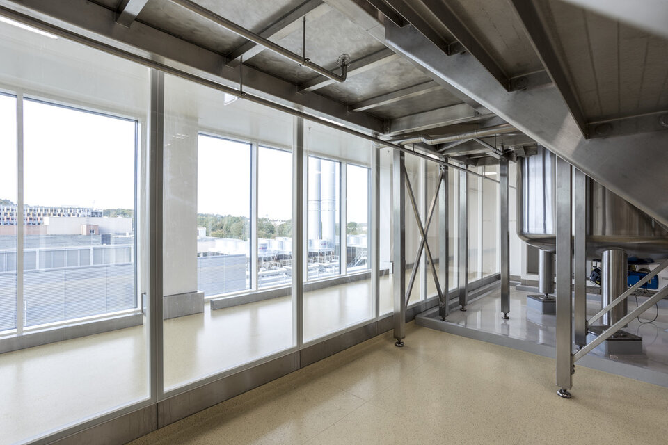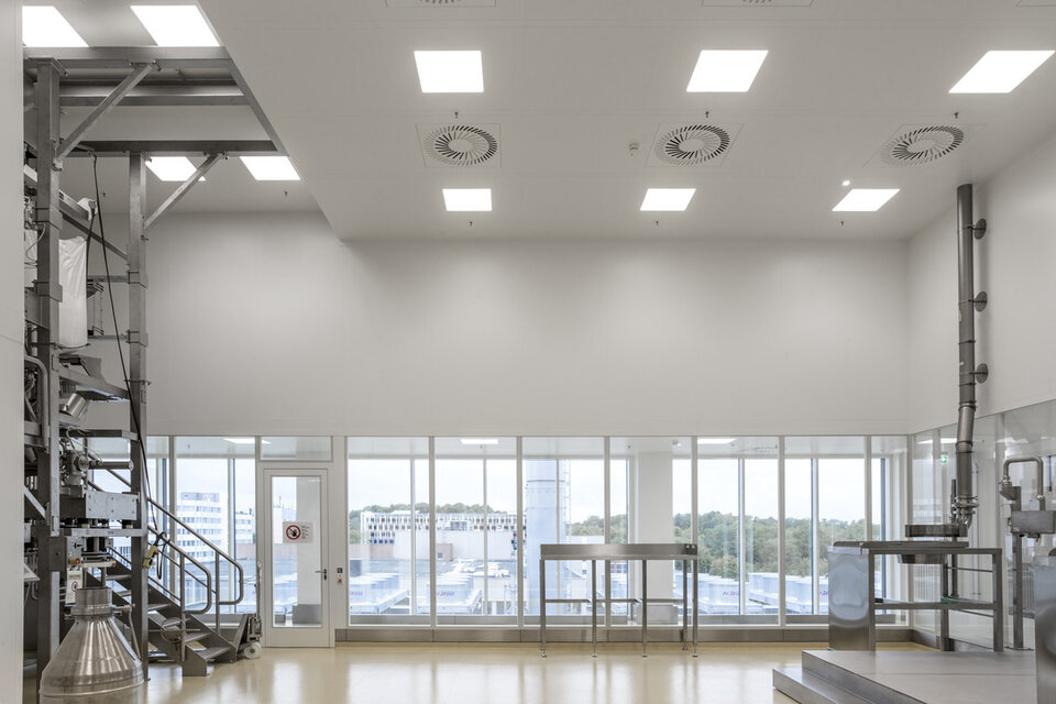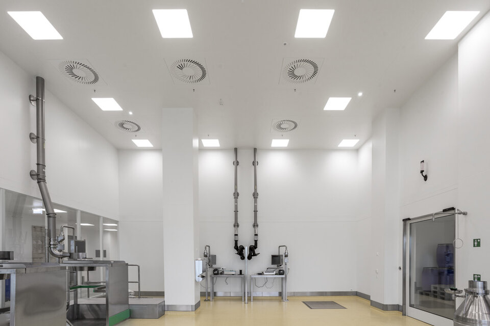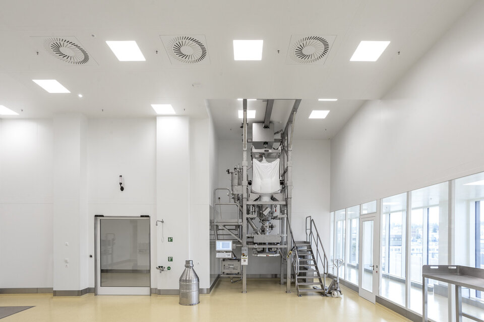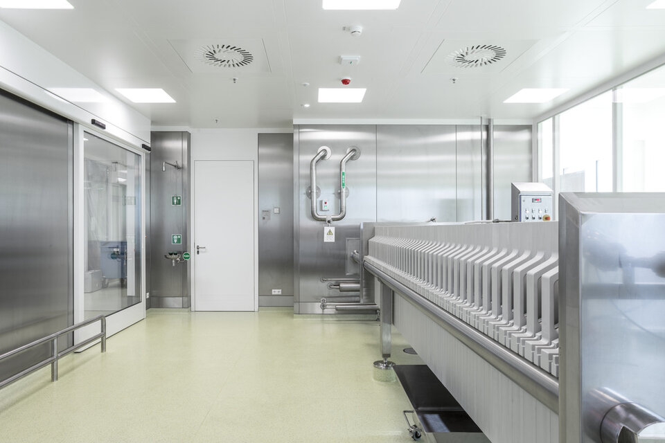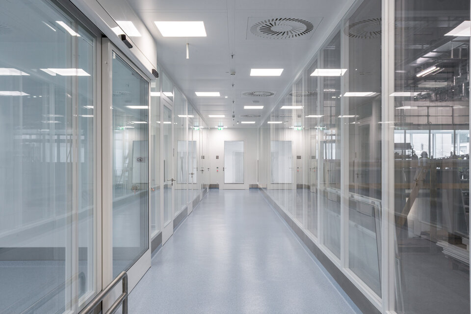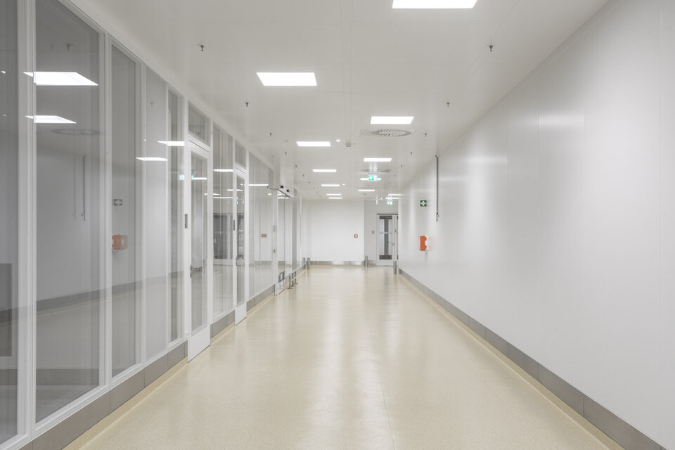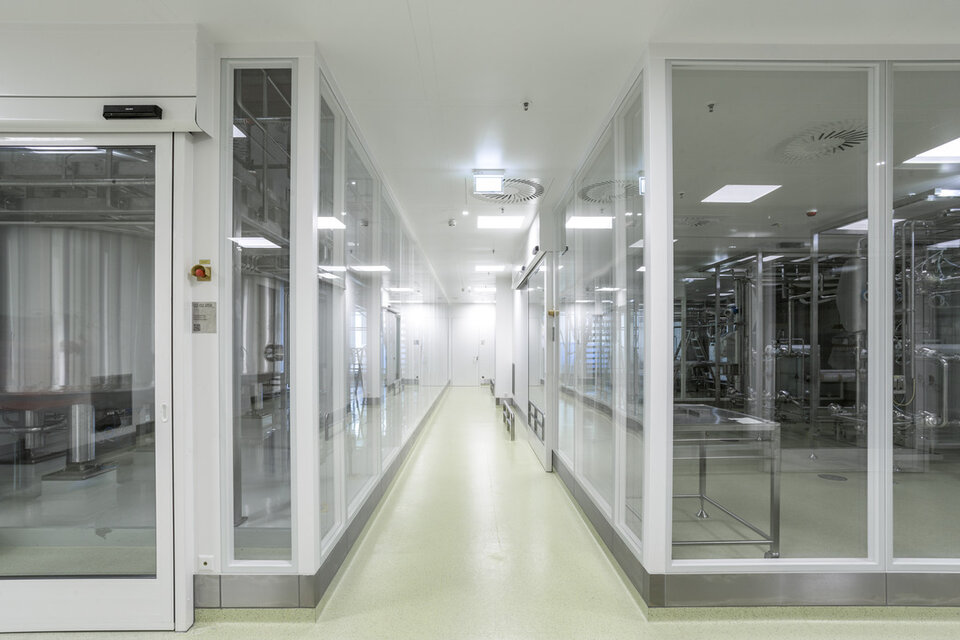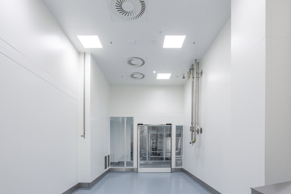 Lindner Reinraumtechnik war im Zuge des Bauvorhabens für den Ausbau von drei Prozess-Ebenen im Gebäude 02 veranwortlich. Jede Ebene verfügt über eine Grundfläche von ca. 3.000 m² bei 7,50 m Höhe. Die Schleusen, internen Flure, sowie die biotechnologischen Prozessräume sind je nach Anforderung in Übereinstimmung mit den GMP-Klassen C oder D gestaltet. Die wesentlichen Leistungsbereiche von Lindner Reinraumtechnik gliedern sich in Decken- und Wandsysteme. Es wurden großflächig Stahlbandrasterdecken des Typs Line 80 S installiert. Diese begünstigen Wartungsarbeiten an den aufwändig gestalteten Lüftungen im Deckenhohlraum. Zudem ermöglicht ein Auf- und Einhängesystem die jederzeitige De- und Remontage der Decken. Auch die Installation von Leuchten oder Lüftungen ist vereinfacht. Zur Absturzsicherung der begehbaren Decke wurde eine Geländerkonstruktion für dieses Projekt entwickelt. Im Hinblick auf Wandsysteme wurde eine projektspezifische Lösung entwickelt. Anstatt der üblichen Wandbreite von 100 mm entstand ein Vollwandsystem mit 80 mm, welches den gehobenen Anforderungen der Reinraumumgebung gerecht wurde. Darüber hinaus wurden Glaswände und Schalungen verbaut. In die Wände wurden Rauchschutztüren sowie T30-Rohrrahmentüren integriert. Lindner erhielt den Auftrag für die abschließende Qualifizierung der Reinräume.