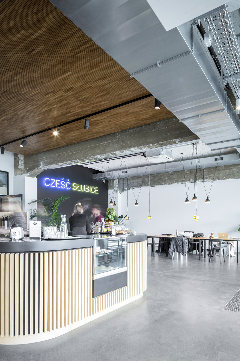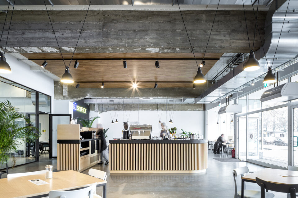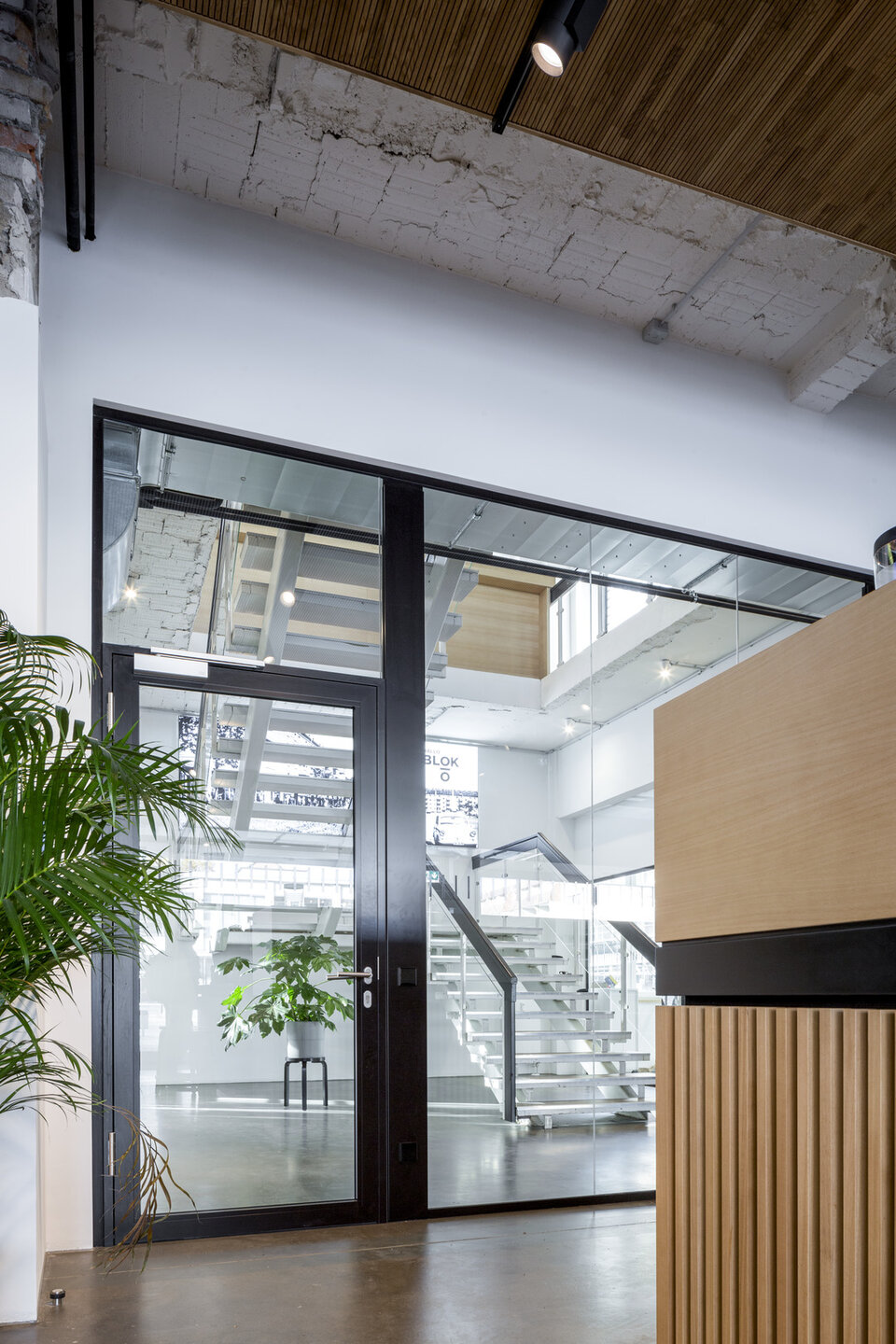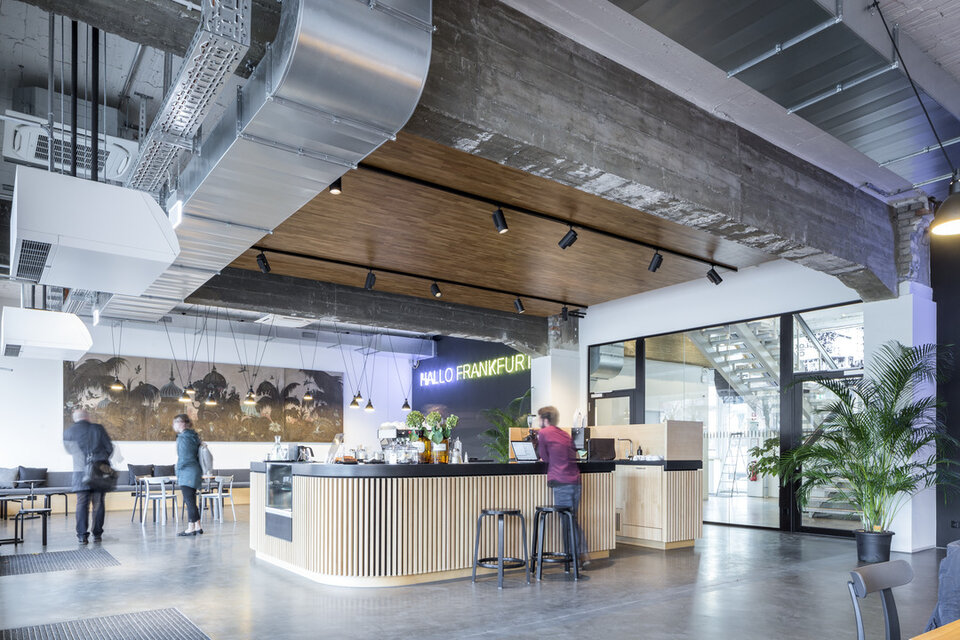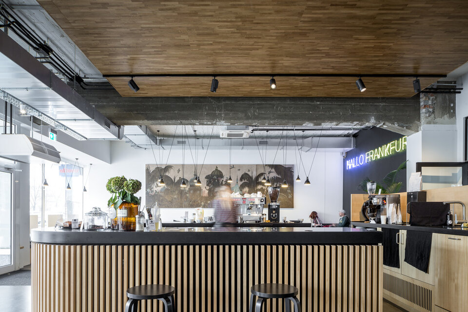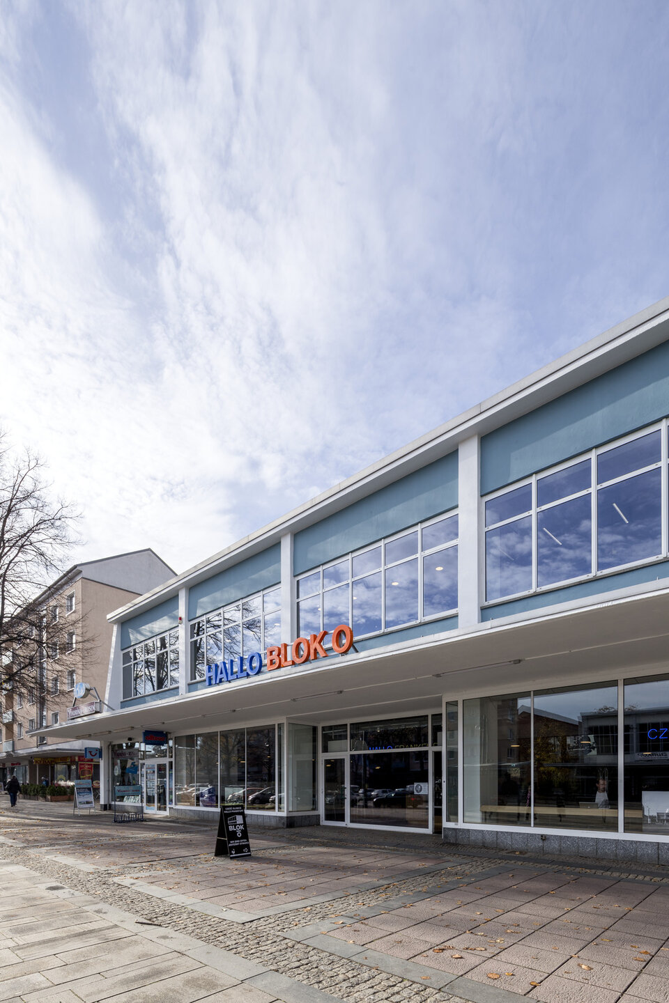 Mit dem Konzept BLOK O vereint die Sparda Bank Berlin eine Bankfiliale mit einem Coworking-Space. Ganz im Sinne des genossenschaftlichen Gedankens können hier Freiberufler, Kreative und kleinere Startups zeitlich flexibel arbeiten und dabei in meist größeren, offenen Räumen voneinander profitieren. Mit St. Oberholz fand man einen Spezialisten für die Konzeptfindung und den Betrieb des integrierten Cafés und der Coworking-Bereiche. Umgesetzt wurde das Konzept in einem traditionsreichen Geschäftshaus, welches Ende der 1950er Jahre in unmittelbarer Nähe zum Grenzübergang ins polnische Słubice erbaut wurde. Die Flächen des ehemaligen Elektronikmarktes standen bereits vier Jahre leer, als man den vollständigen Rückbau und die Umsetzung des Blok O Konzepts beschloss. Im Erdgeschoss des öffentlichen Gebäudes befindet sich das Café mit sogenanntem Hotdesking-Bereich und abgetrennten Besprechungszimmern sowie die SB-Zone der Bank. Über ein zentrales Treppenhaus gelangt man in das Obergeschoss mit Loungebereich, mietbaren Teamräumen, Raum-im-Raum-Systemen, Druckerbereich, Teeküche sowie dem Büro der Sparda-Angestellten.