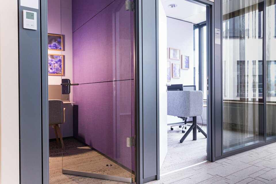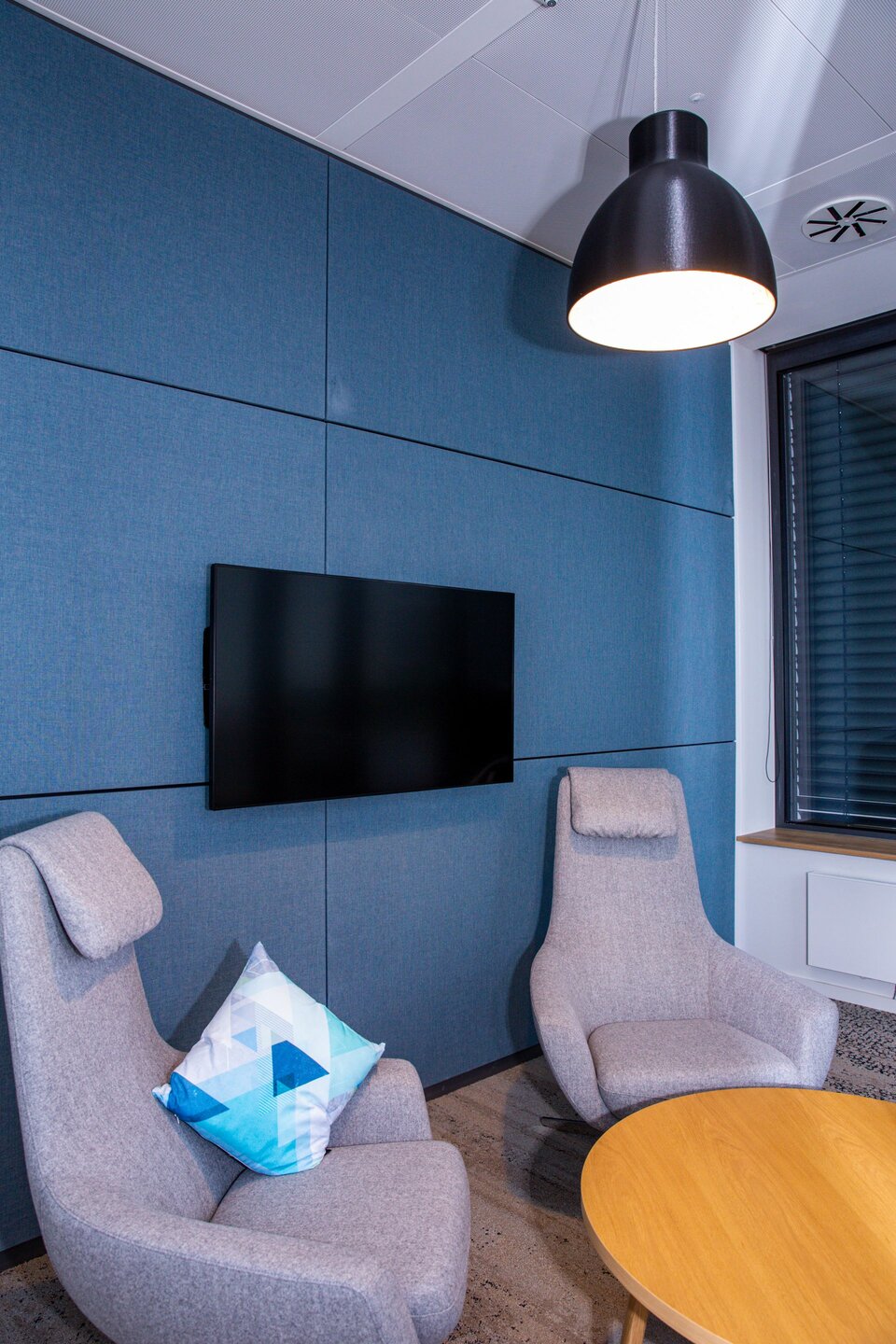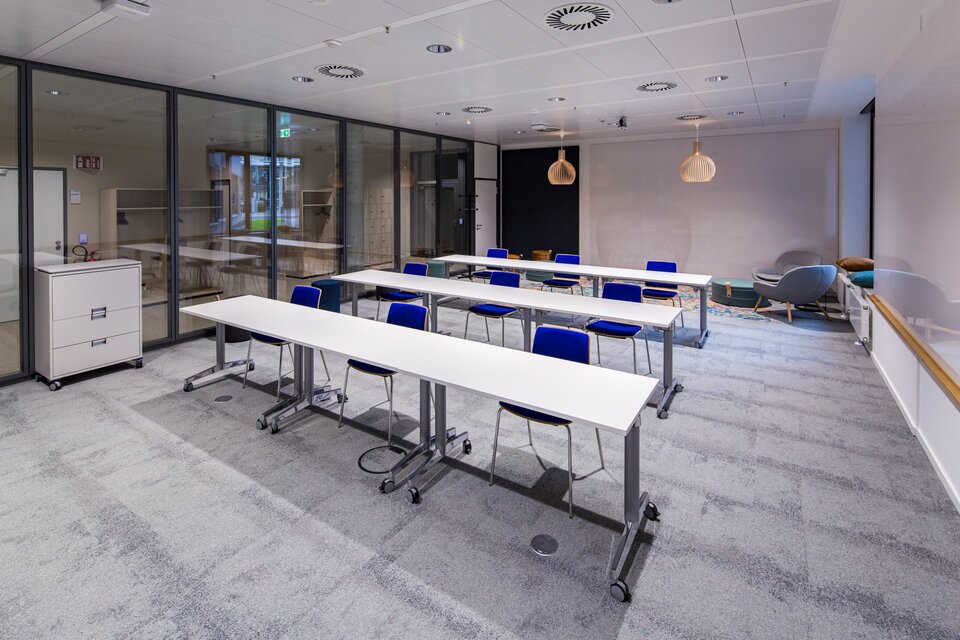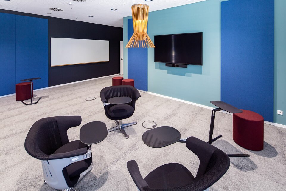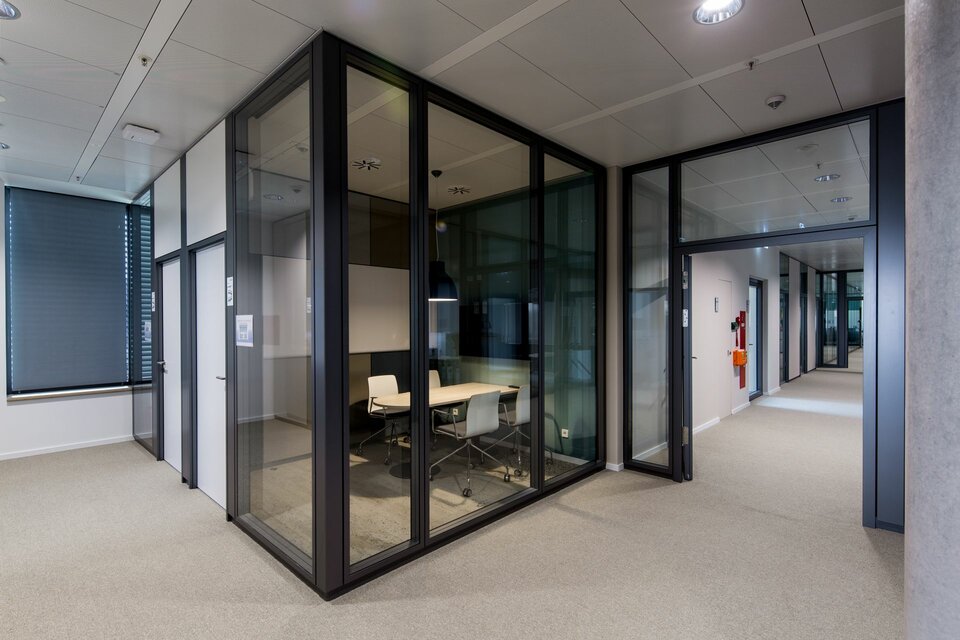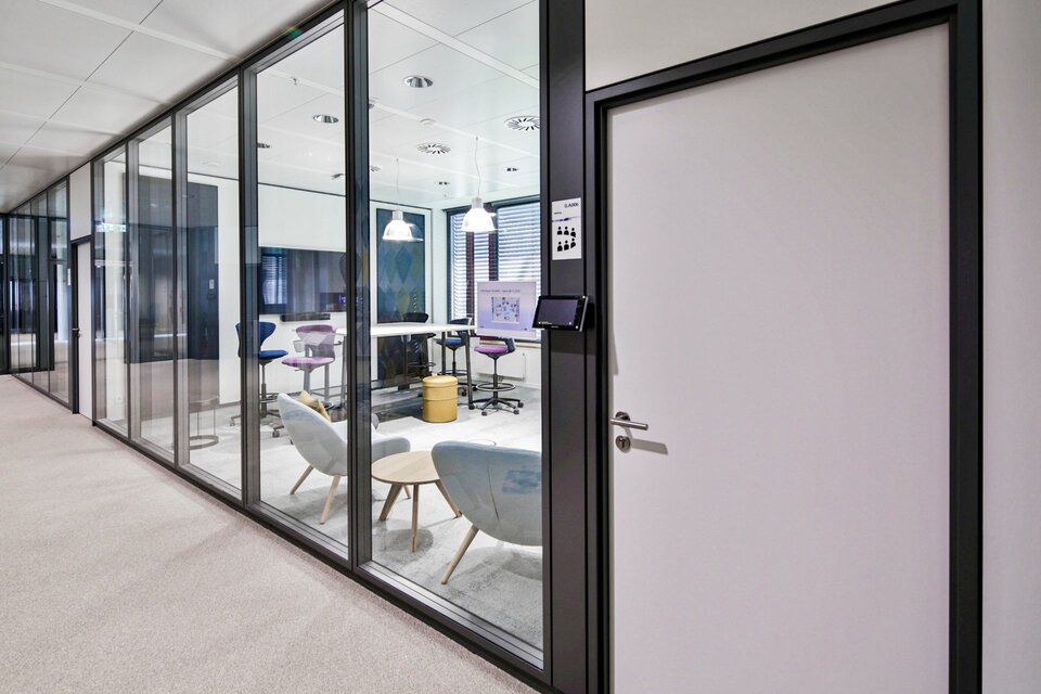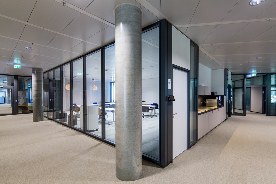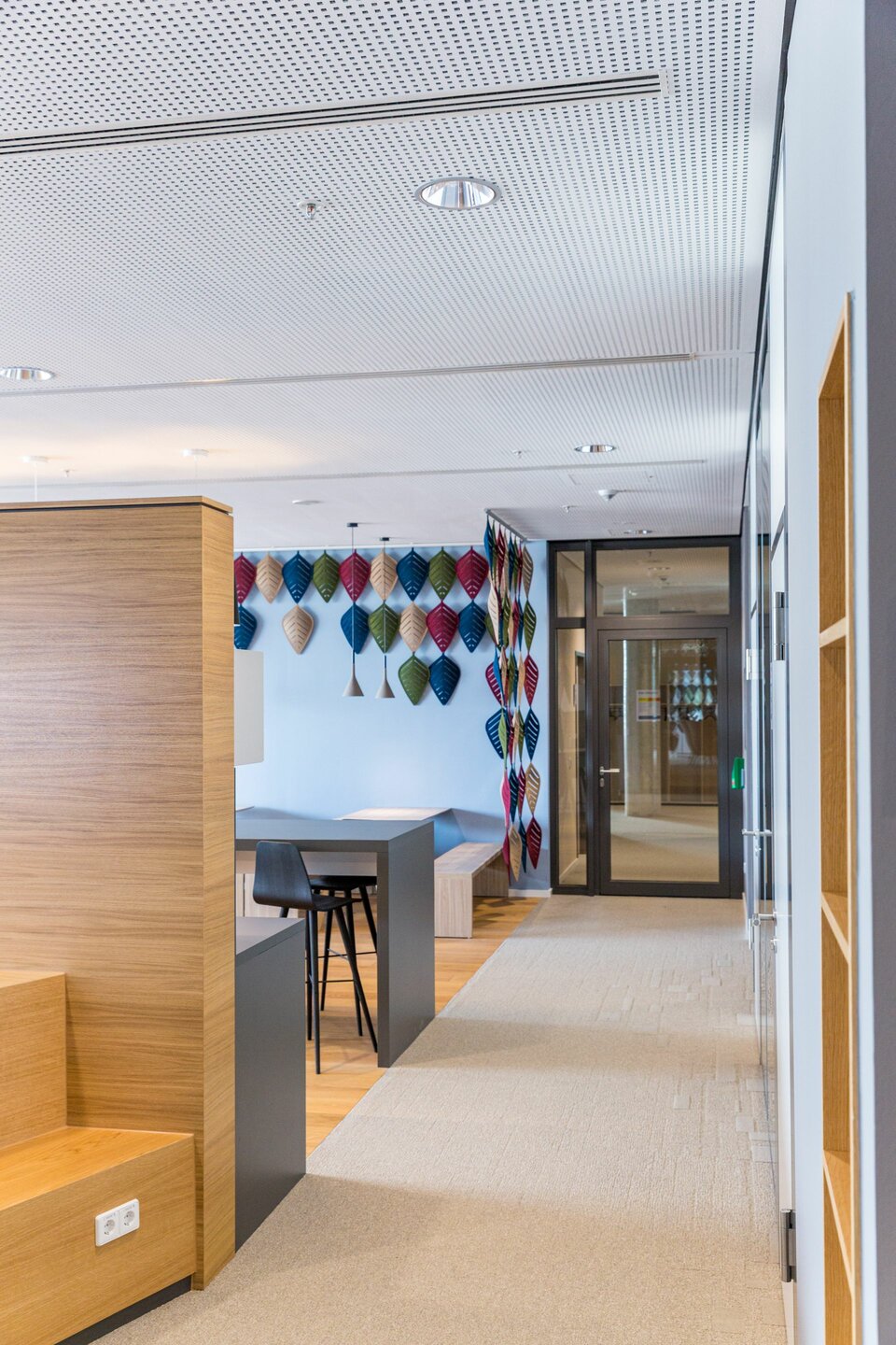 Um in den offenen Büroflächen Separation zu schaffen, wurden verschiedenste Lindner Voll- und Glastrennwandsysteme im Gebäude installiert. Diese sorgen neben Diskretion auch für eine optimale Akustik am Arbeitsplatz. Für zusätzlichen Schutz vor störenden Geräuschen wurden knapp 700 teils stoffbespannte Wandabsorber montiert. Rund 13.000 m2 Heiz- und Kühldecke sorgen darüber hinaus für ein angenehmes Raumklima im Verwaltungsgebäude.