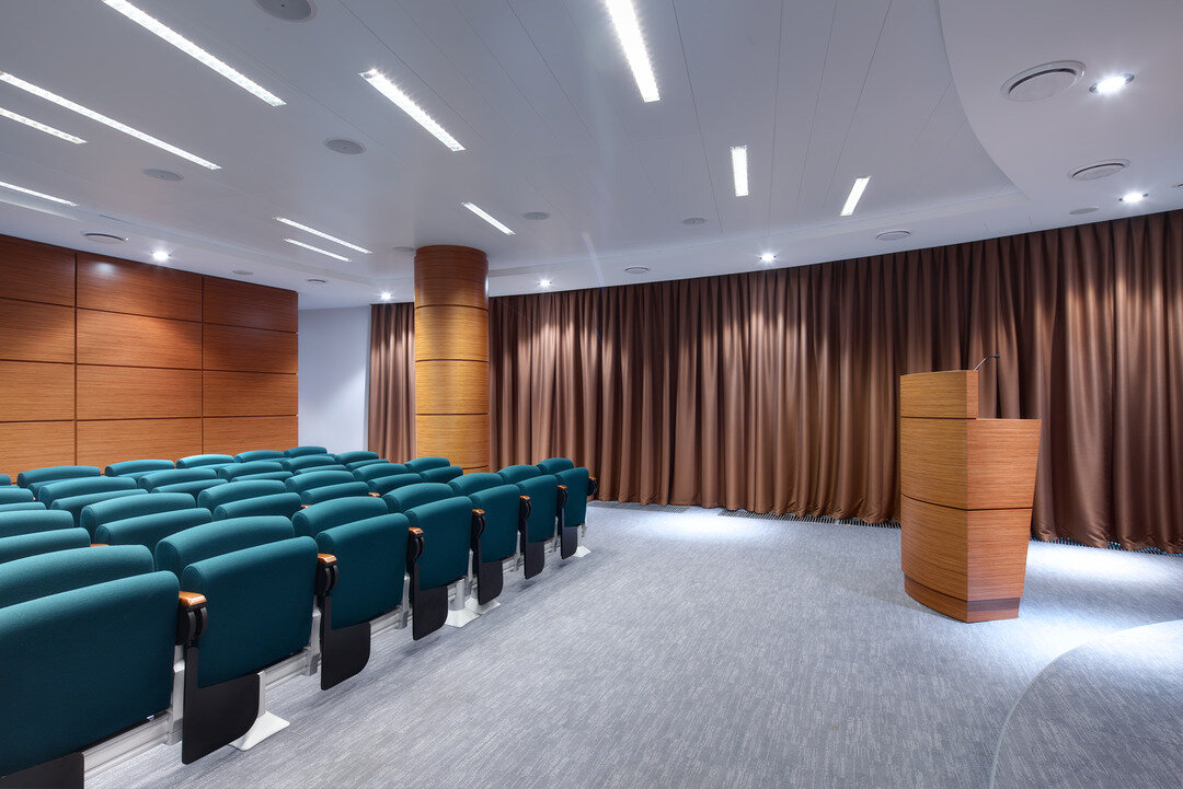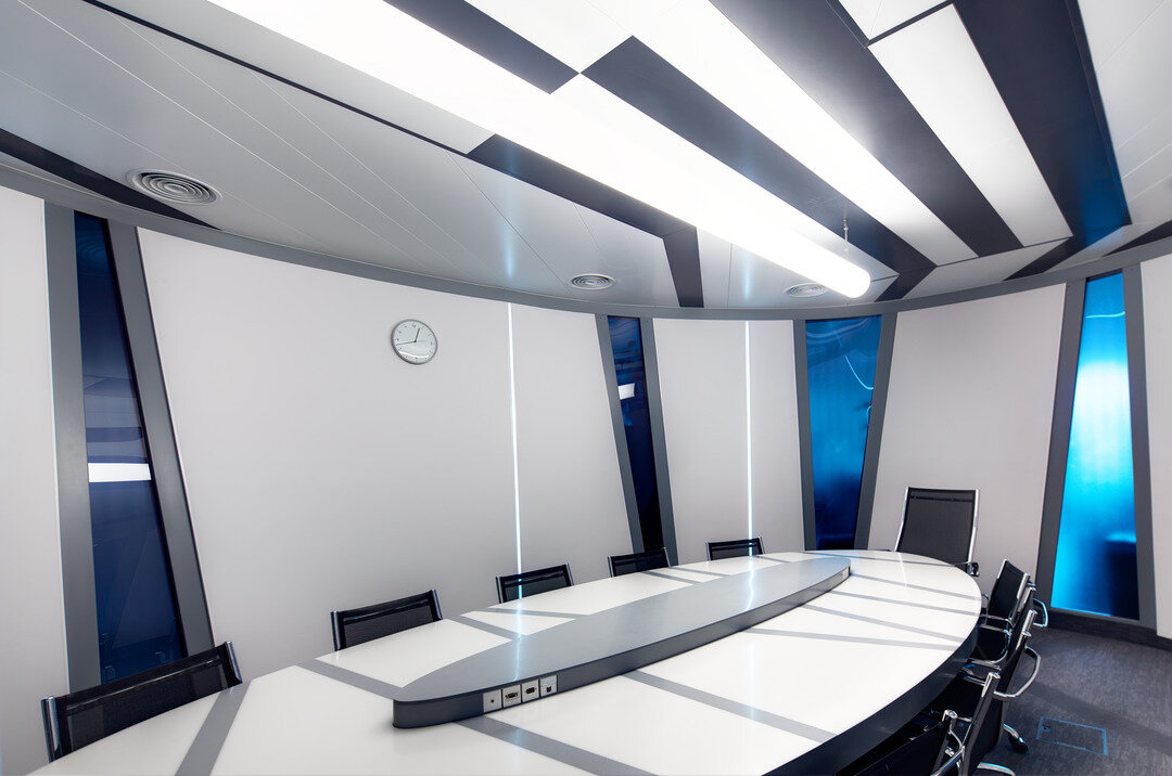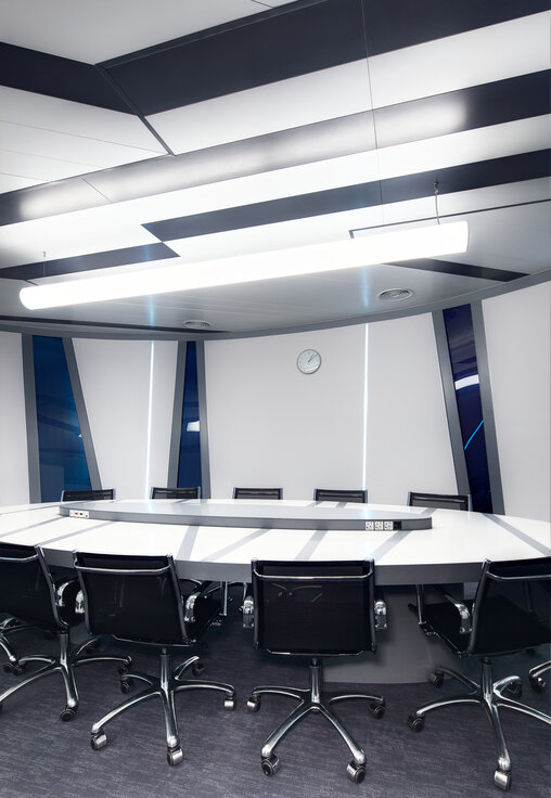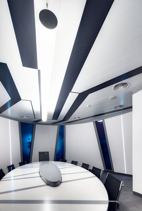 Lindner produzierte, lieferte und montierte Einhängedecken für die öffentlichen Bereiche, Besprechungszimmer und Bürobereiche eines bedeutenden russischen "Health Food" Produzenten. Die Einhängedecke mit den überlappend eingehängten Metalldeckenplatten besticht bei dieser Ausführung durch das attraktive Design von weißen und schwarzen Deckenpaneelen mit integrierten Leuchten.