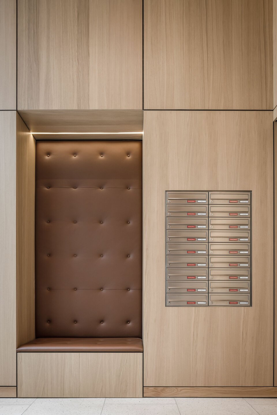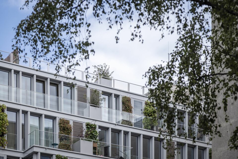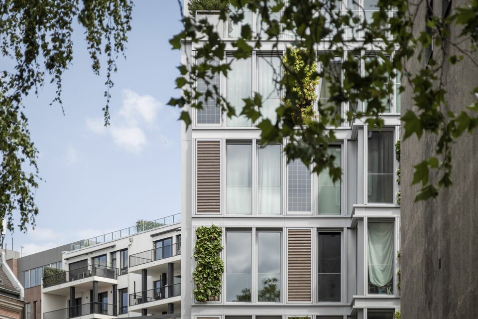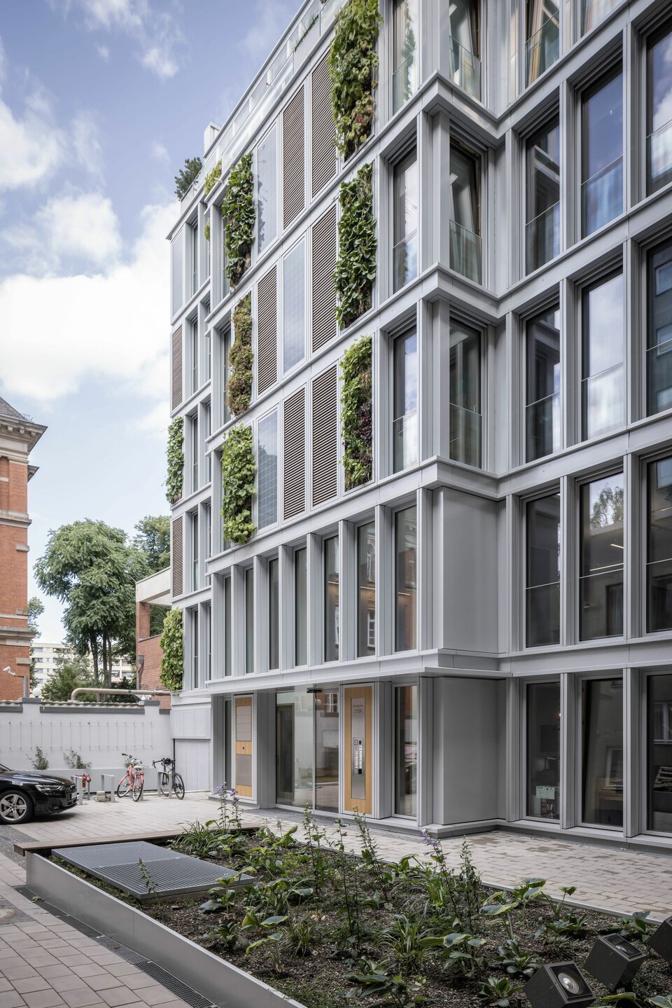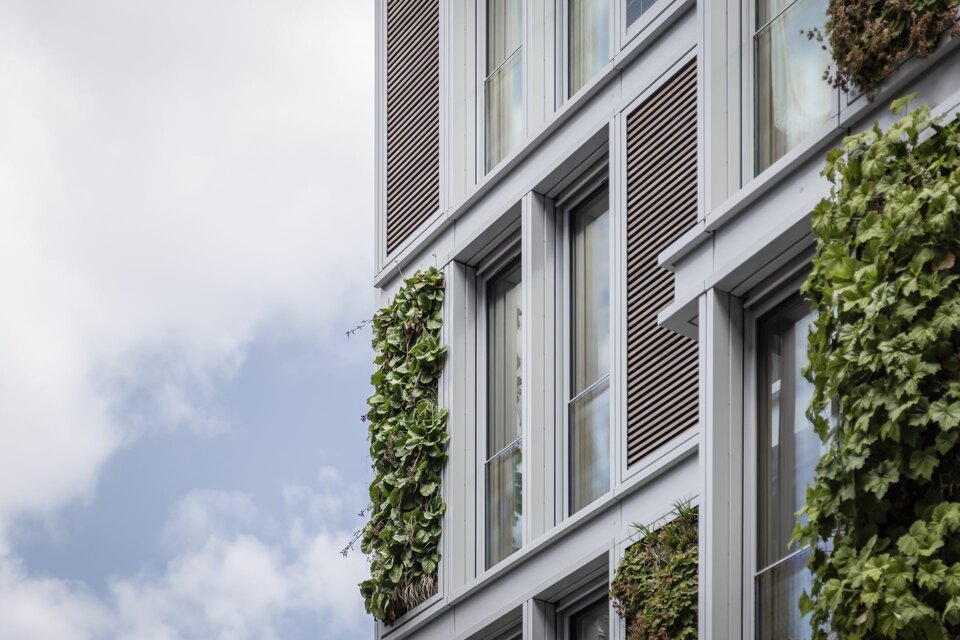 Das Highlight des Gebäudes ist die einzigartige Fassade, bestehend aus raumhohen Fensterkästen in Kombination mit Photovoltaikelementen, individuell angeordneten vertikalen Grünflächen, Terrassen und Balkonen sowie hochwertigen Kebonyholzpaneelen: Das Holz ist eine in Alkohol getränkte norwegische Kiefer und stellt damit eine umweltschonende Alternative zum eleganten Teakholz dar – die Holzart ist komplett recycelbar und damit besonders nachhaltig.