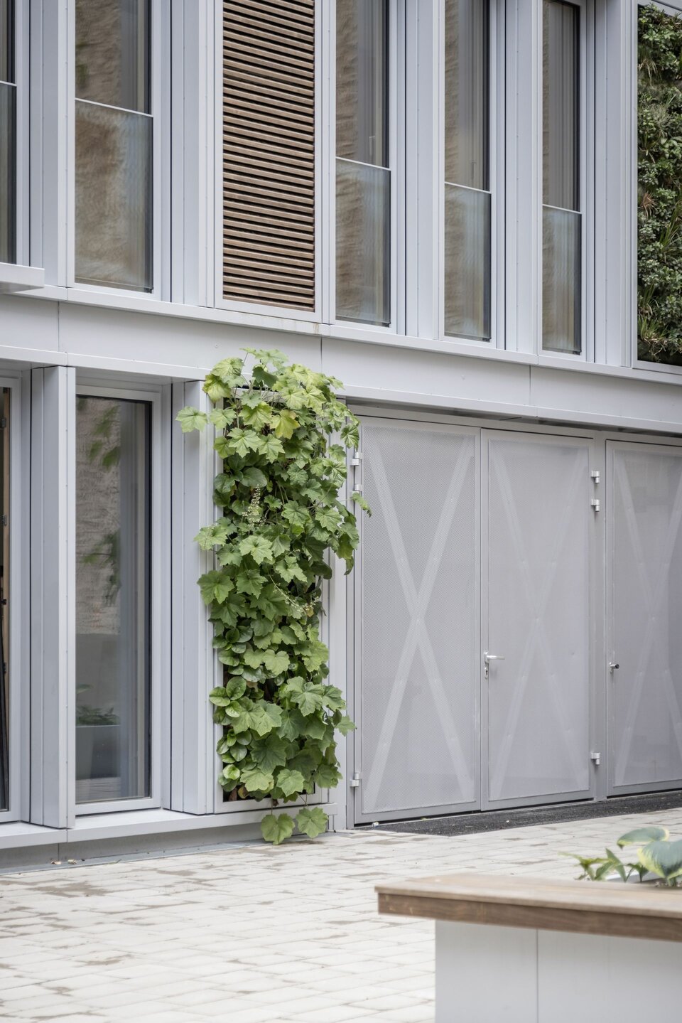 Der Rahmen der Fassade wurde von Lindner gefertigt und anschließend von Partnerunternehmen befüllt. Die nur 127 mm schmalen Lisenen aus Aluminium für den Außenrahmen sind dabei wortwörtlich versteckte Talente: Darin enthalten sind Anschlüsse für die Stromabnahme der Photovoltaik, Bewässerungsleitungen für die vertikal bepflanzten Elemente sowie versteckte Fallrohre für die Regenwasserableitung vom Flachdach. Die Fensterkästen, ebenfalls aus dem Hause Lindner, bestehen aus Holzfenster-Flügelrahmen mit Dreifachisolierung und integrierten Brüstungsscheiben mit außenliegendem Blendschutz. Dabei fertigte Lindner die Einzelelemente in Arnstorf vor und setzte diese auf der Baustelle werkseitig ein. Ebenfalls im Aufbau der Fensterkästen integriert sind Dauergerüstanker als tragfähige Bauteile: So kann bei späteren Sanierungs-, Reinigungs- und Austauscharbeiten der Paneele ein Gerüst direkt an der Fassade befestigt und so ein vereinfachter Zugang zum Gebäude ermöglicht werden.