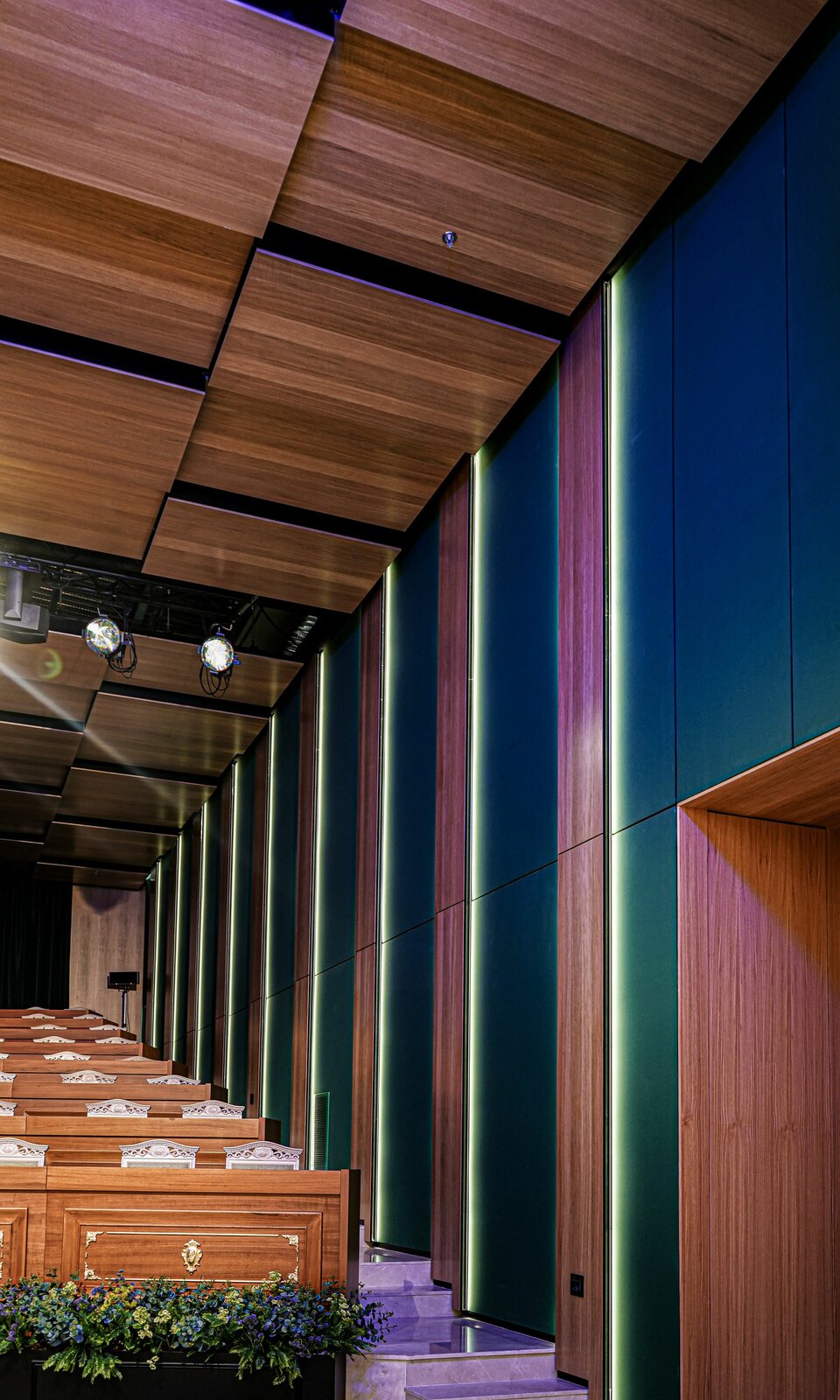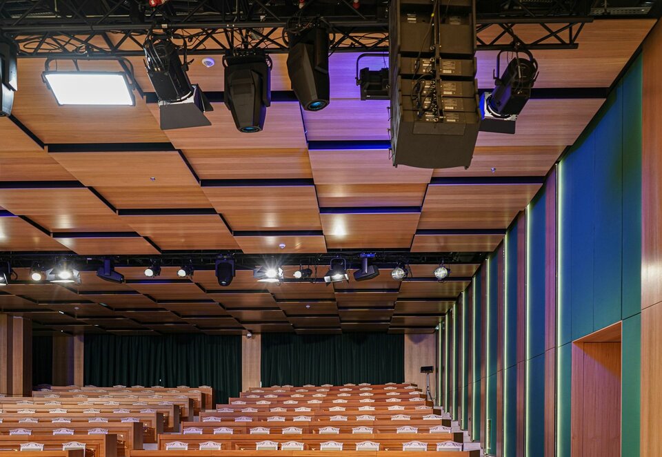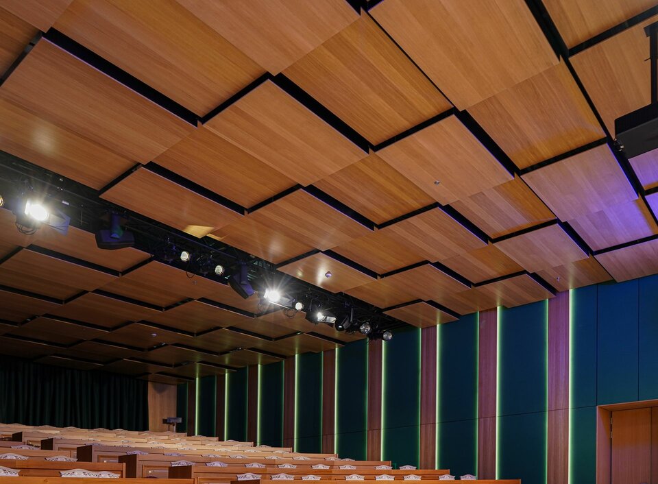 Zudem kamen Lindner COMPwood acoustic Trennwände und das Lindner COMPwood acoustic Deckensystem ebenfalls mit perforierten Echtholzfurnier zum Einsatz.