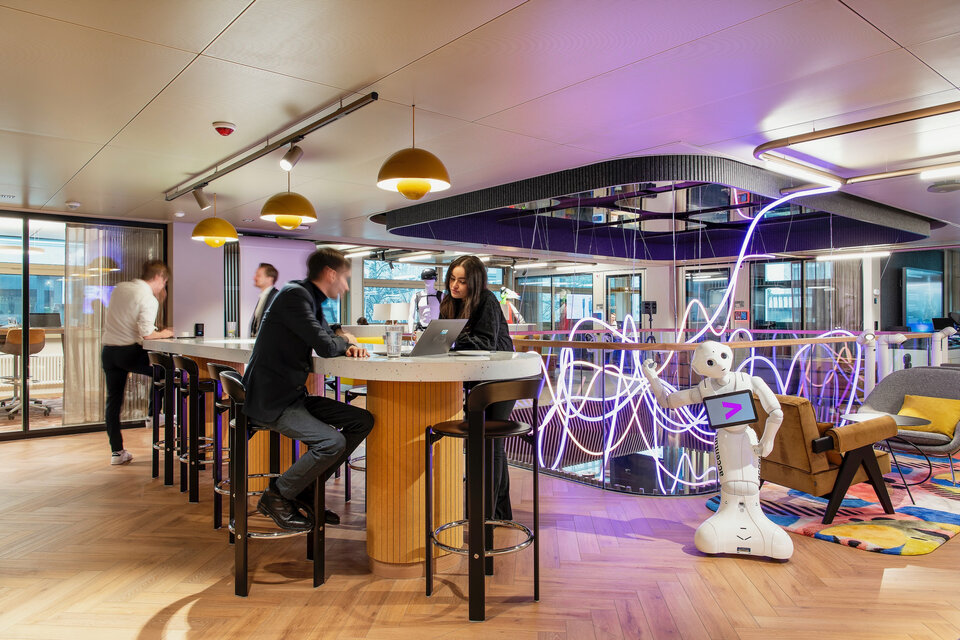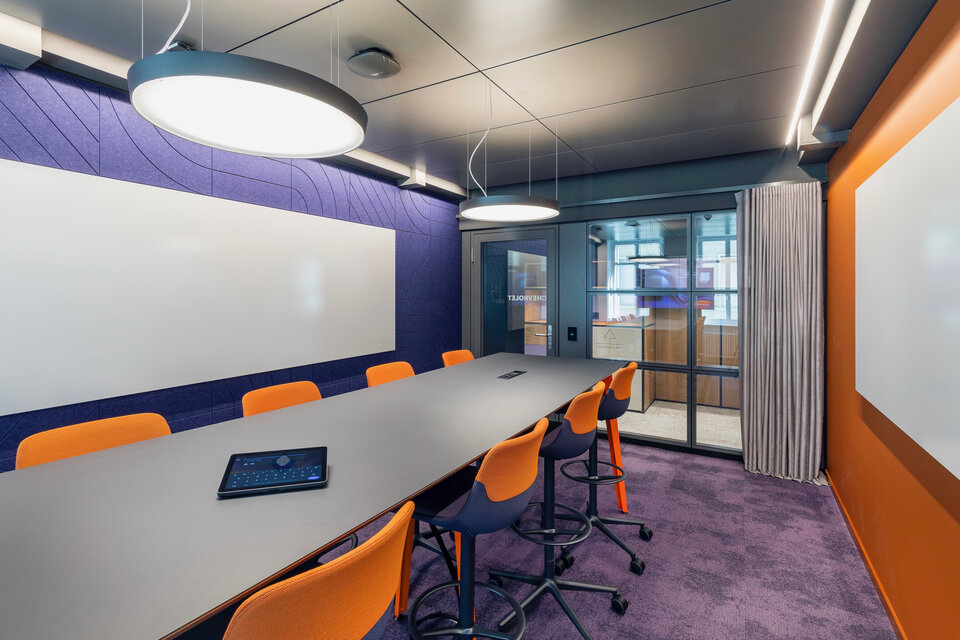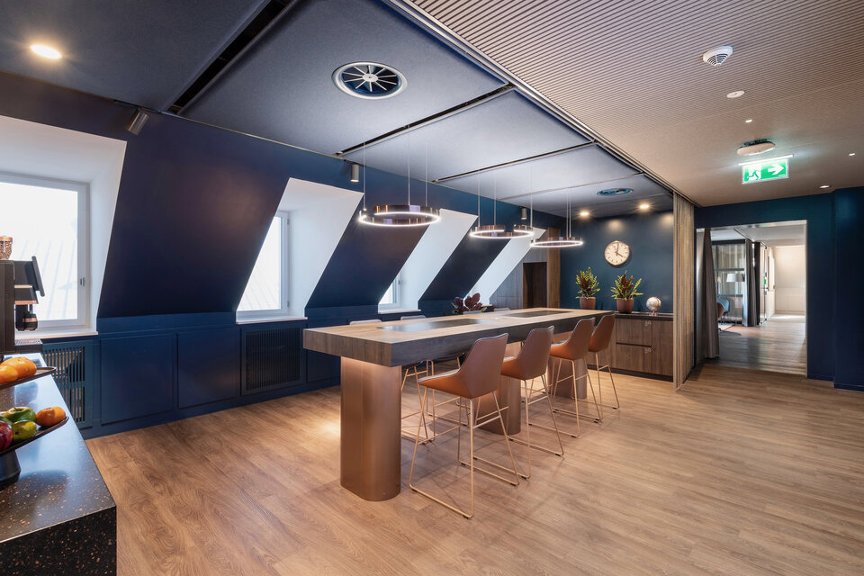 Jedes Stockwerk und auch die einzelnen Arbeitszonen wurden dabei individuell in verschiedenen Farbwelten designt. Es finden sich auffällige Designelemente wie Wandtapeten, Teppiche und Möbel, genauso wie warme Holztöne am Boden und Wände und ruhig gestaltete Wand- und Deckenelemente. Genauso wichtig war es den Architekten und Designern von Evolution Design für gutes Raumklima und optimierte Akustik zu sorgen und auch den hohen Nachhaltigkeitsanforderungen nach LEED gerecht zu werden. Wie z. B. mit unterschiedlichen Schallabsorbern, hergestellt aus regionaler Schafwolle oder auch recycelten PET-Flaschen, genauso wie smarter Gebäudetechnik und viele Grünpflanzen in den Büroflächen.