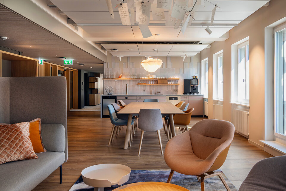Im neuen City Campus stehen nun auf sechs Geschossen eine Vielzahl an verschiedenen, den unterschiedlichen Bedürfnissen zugeschnittene Arbeitsbereiche zur Verfügung: von offenen Arbeitsinseln zu Rückzugszonen und Besprechungs-Cubes in verschiedenen Größen bis hin zu wohnlichen Meeting- und Pausenbereichen.