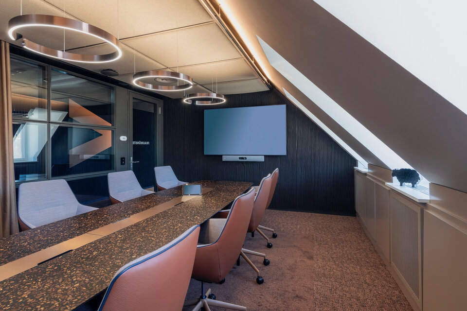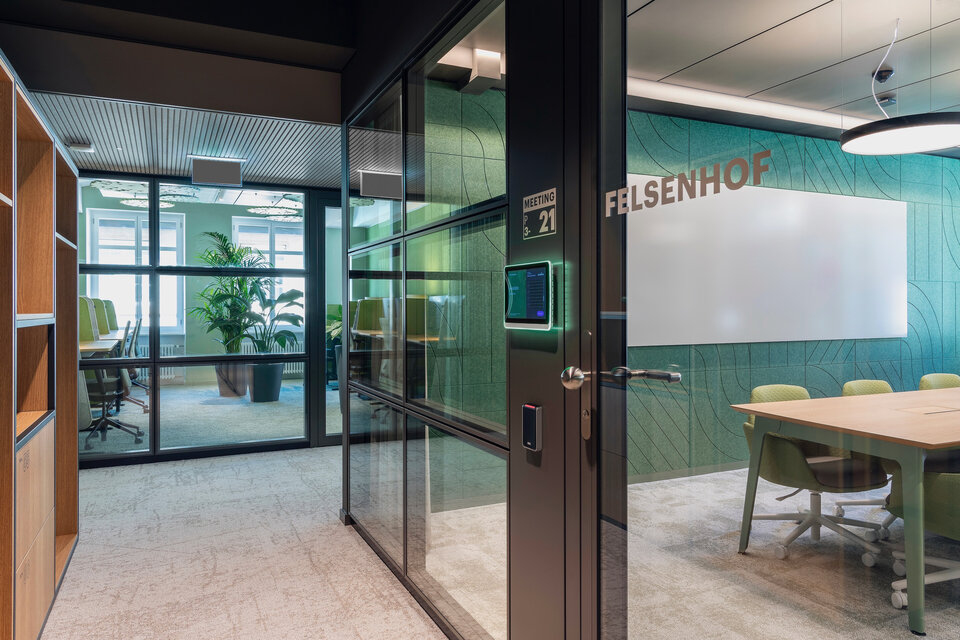 Auch die Glastrennwände für den Yoga-Raum führte Lindner mit dem Lindner Life Freeze 137 System gerundet aus. Für weitere Besprechungsräume und separierte Arbeitsbereiche wählte man Lindner Life Contour 126, kombiniert mit passenden Glastüren mit Aluminiumrahmen. In den gesamten Büroflächen fiel die Wahl auf Lindner Bodensystemen in verschiedenen Ausführungen: von Hohlboden HYDRO (für Feuchtbereiche) und FLOOR and more® über LIGNA (Doppelboden aus Holzwerkstoff) zu besonders nachhaltigen NORTEC Doppelbodensystem aus Calciumsulfatplatten.