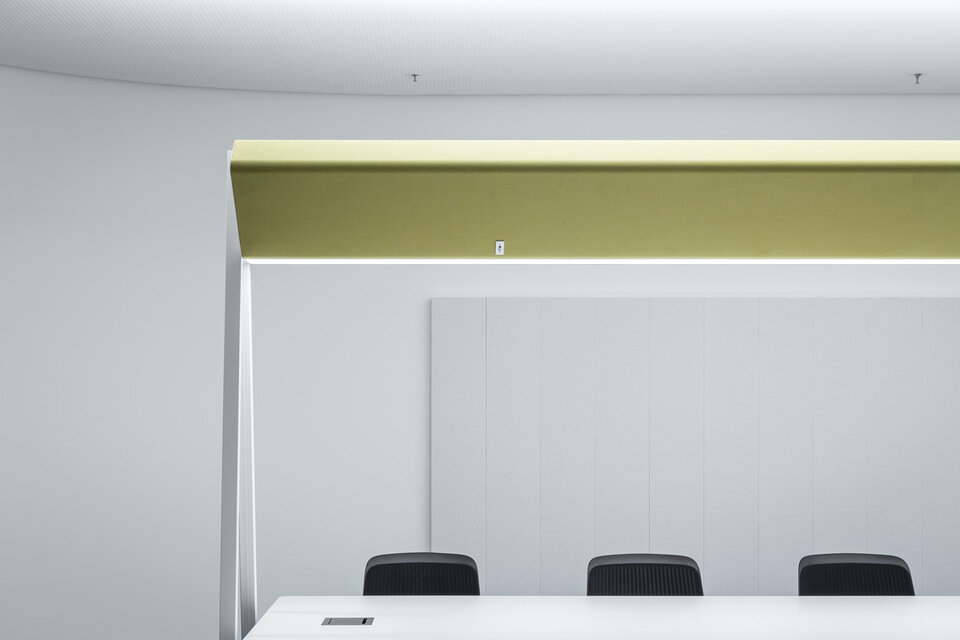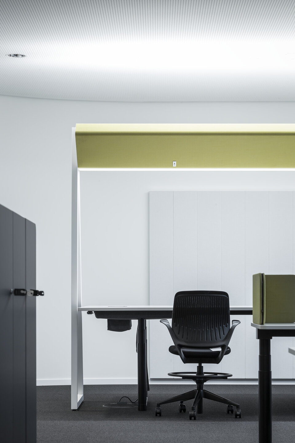 Die Lichtregelung (Tageslicht, Anwesenheit) erfolgt mittels im Textilfeld integrierten wireless Bewegungssensoren, was aber genauso manuell mittels Lichtregelung am jeweiligen Einzelarbeitsplatz bedient werden kann. Zusätzlich besteht die Möglichkeit, die ebenfalls durch Fa. Signify gelieferten Stehleuchten in eine Zonen- und Gruppensteuerung zu integrieren. Die Anschlusskabel haben an der Steherseite eine Kaltgeräte Buchse und am anderen Leitungsende einen Schuko-Stecker.