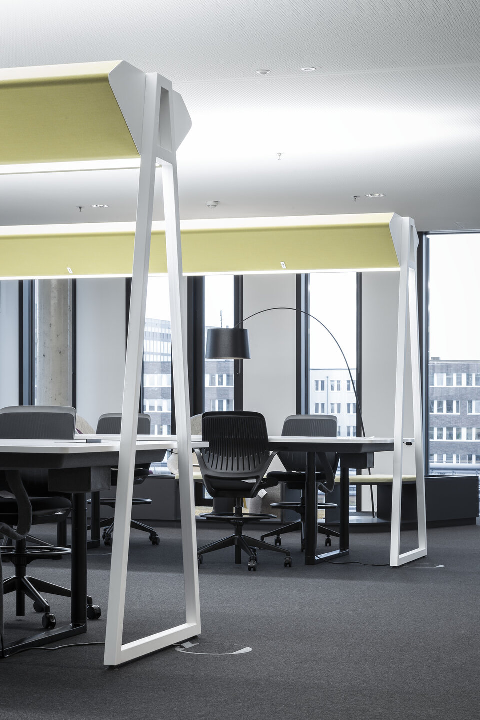 Designvorgabe war eine akustisch aktivierte Stoffbespannung in Form einer Brückenleuchte, die über drei Doppelarbeitsplätze reicht. Seitliche Stahlrohsteher mit einer Breite von 1.000 mm am Boden und einer Höhe von 2.345 mm dienen als Aufhängung und wurden mit nivellierbaren Füßen ausgestattet. Der Leuchtenkörper ist dabei trapezförmig, mit den Abmessungen: Länge 4.850mm, Breite 960 mm, Höhe 345 mm. Entsprechend den unterschiedlichen Farbgestaltungen der einzelnen Etagen gibt es fünf verschiedenfarbige, aufkaschierte Textilbespannungen Typ Kvadrat Rime, das Stahlrohrgestell wurde in RAL 9016 pulverbeschichtet. Zur Gewichtsreduzierung versah man den Grundkörper mit Lochmuster, trotzdem beläuft sich das Gesamtgewicht auf 125 kg pro Leuchte.