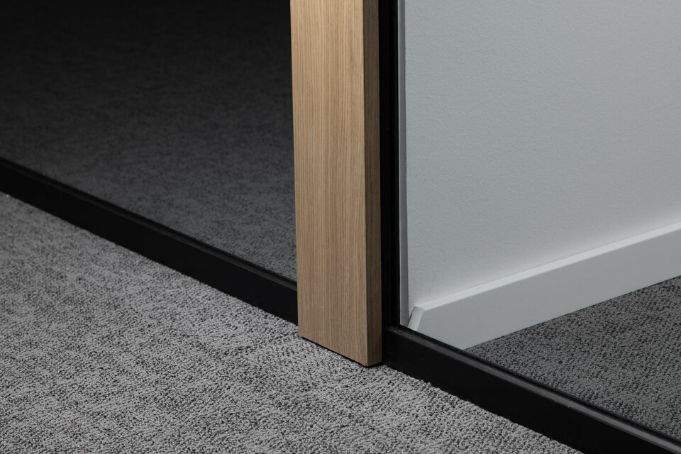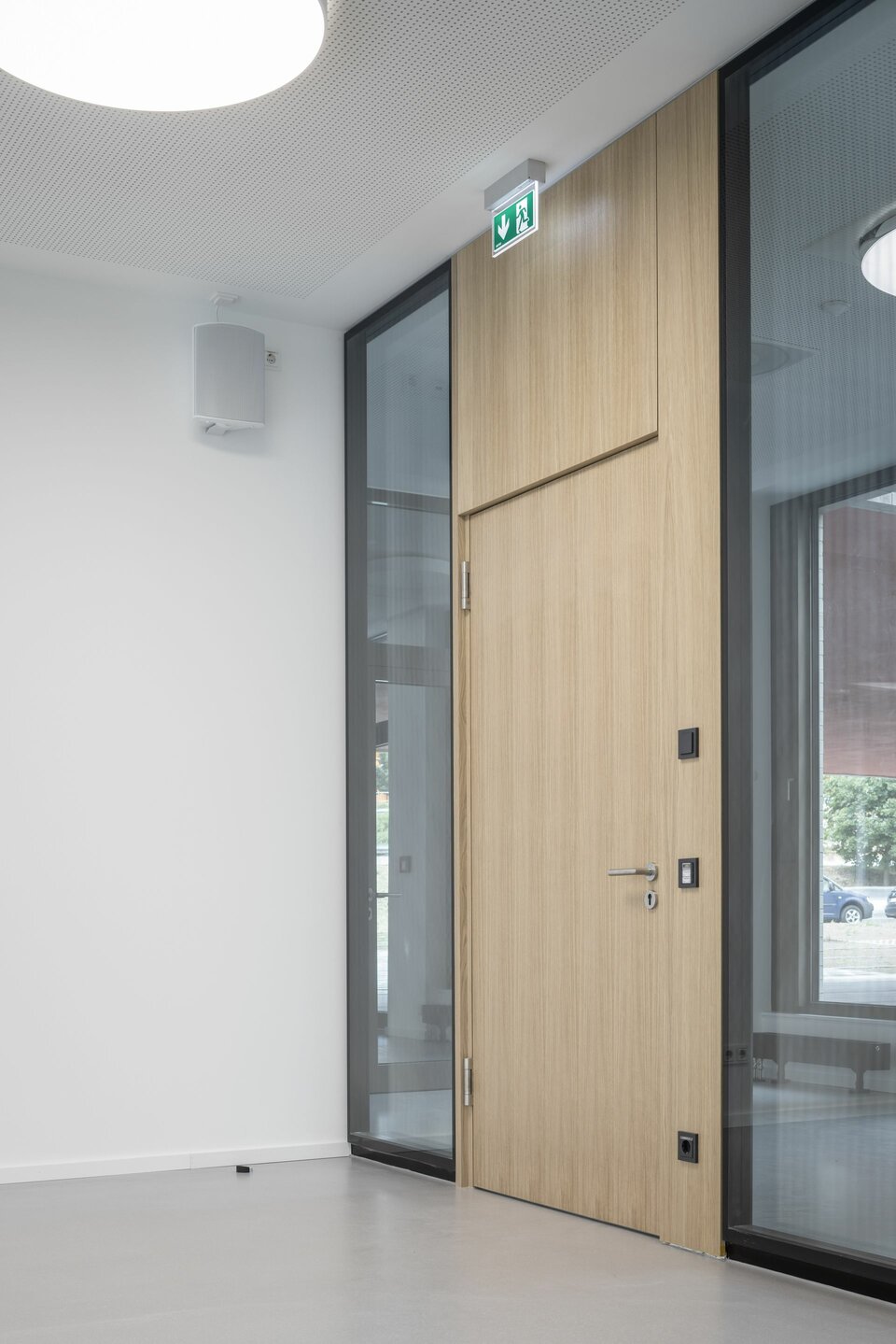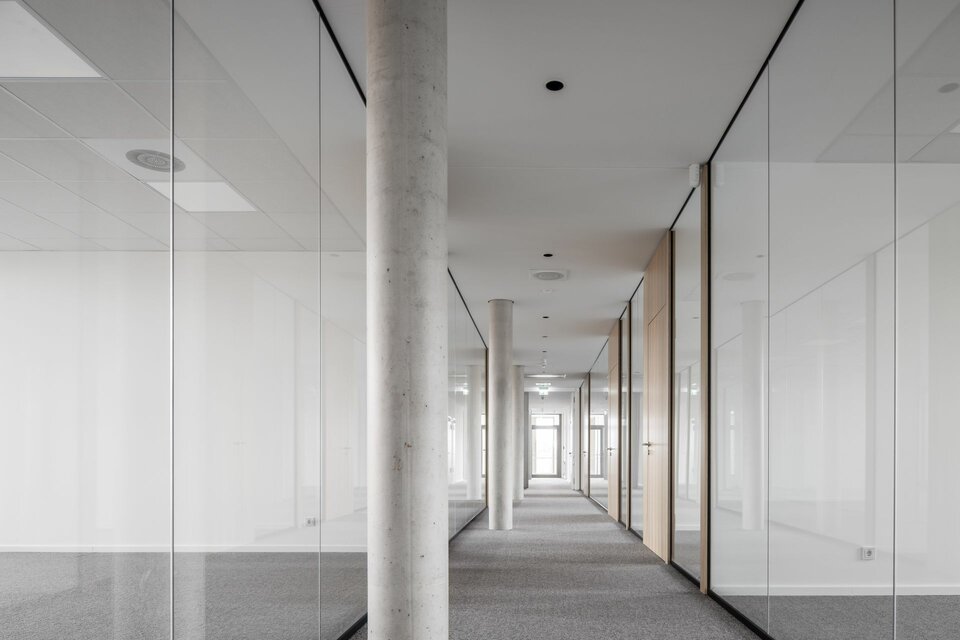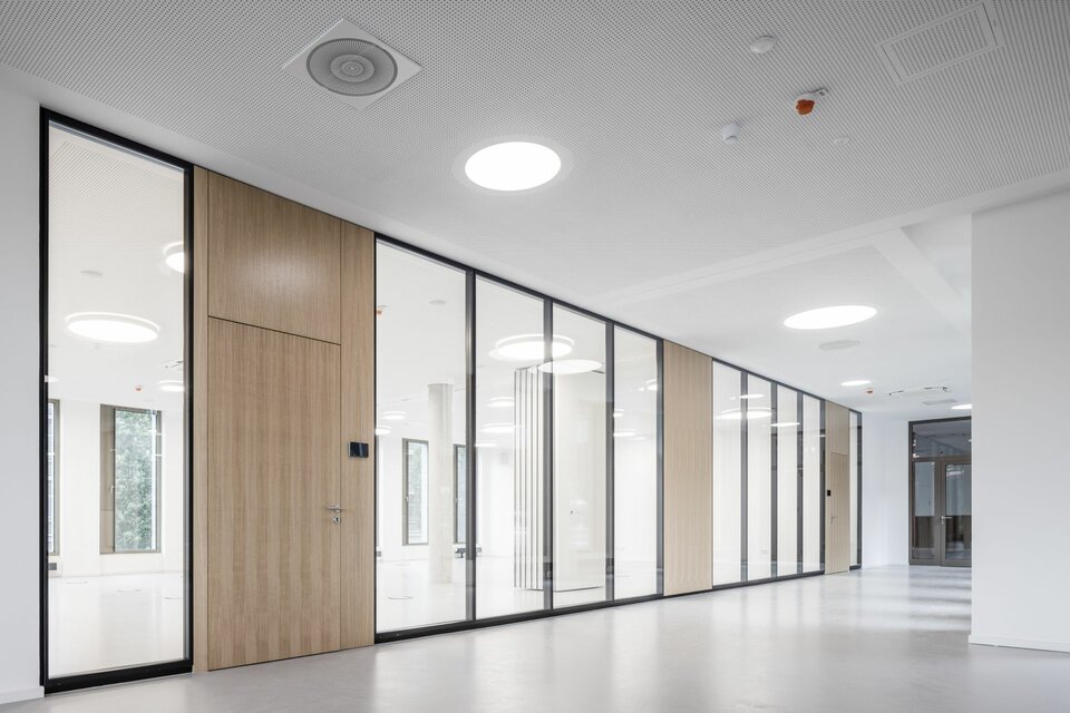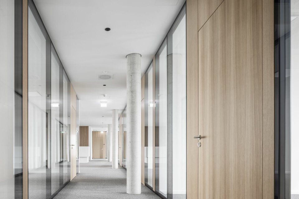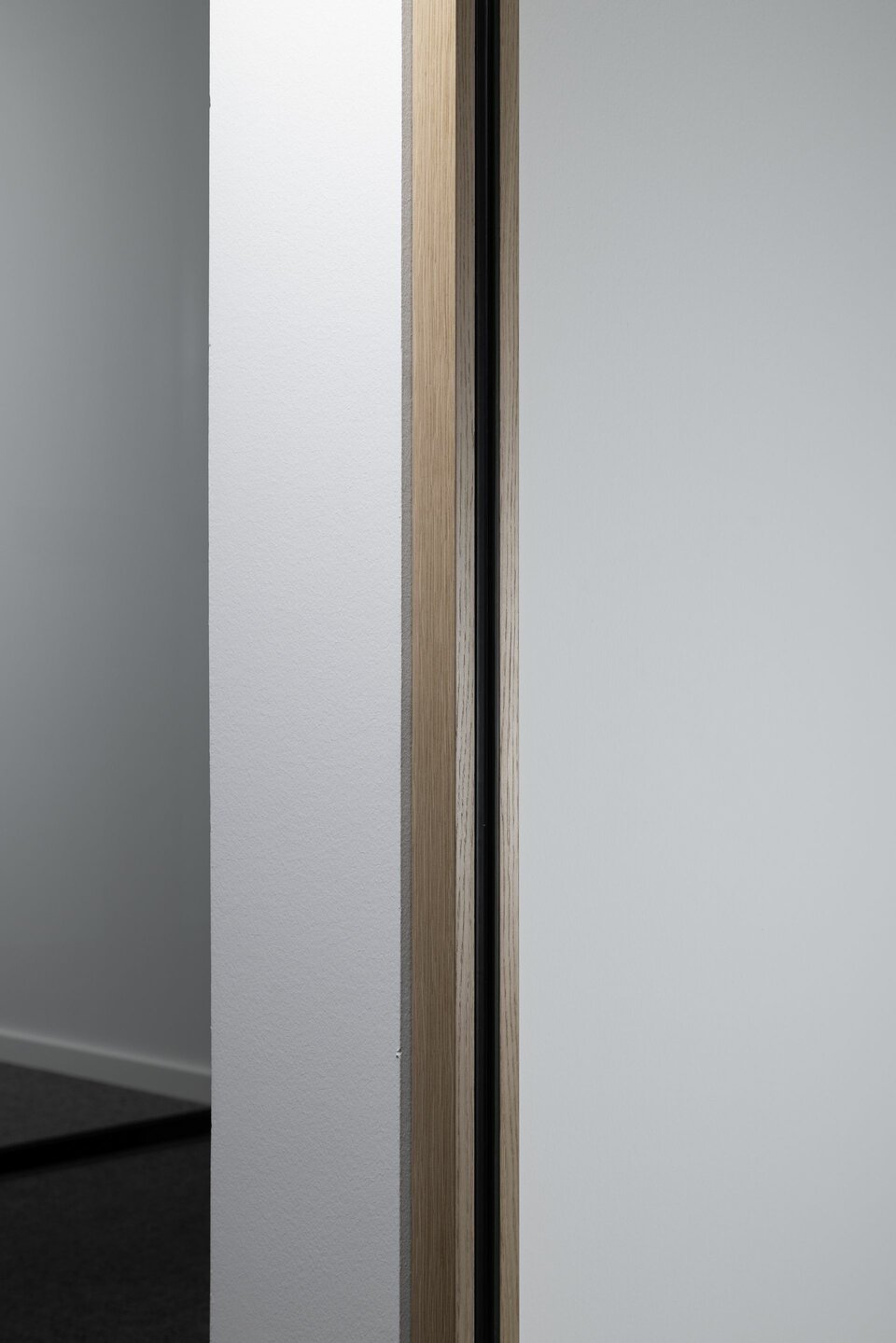 Die Lindner Group lieferte diverse Wand- und Türsysteme für das Projekt. Die Glastrennwände Lindner Life Freeze 137 und Lindner Life Pure 620 fungieren als transparente Raumtrennungen und lassen dabei die Helligkeit in den Räumen erhalten. Bei der Lindner Life Pure 620 wurde der Stoß der Verglasung mit Holzpaneelen belegt – damit schafft die Glastrennwand eine optimale Verbindung zu den angrenzenden Holztürblättern, die genauso wie die dazugehörige Portaltür und Zarge sowie die Trennwandprofile in Eiche furniert wurden. Die Flexibilität der Glastrennwände zeigte sich, als sich der Kunde im Laufe der Zeit dazu entschied, die Bürowelten noch offener zu gestalten: Gemeinsam mit Lindner wurden einige der Wandelemente daraufhin schnell und unkompliziert wieder abgebaut.