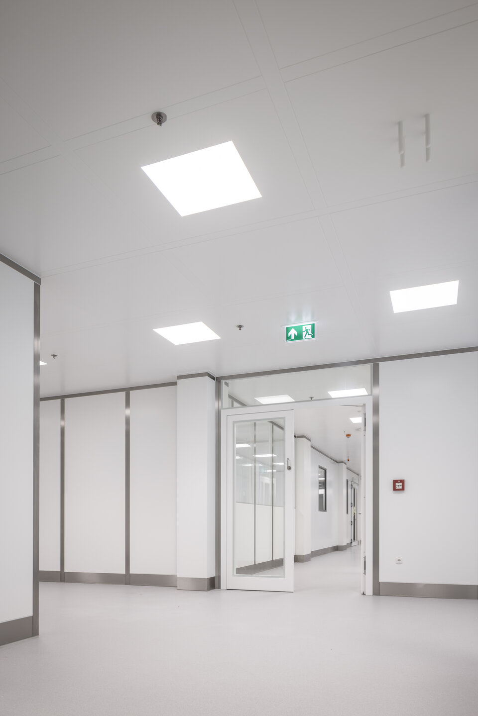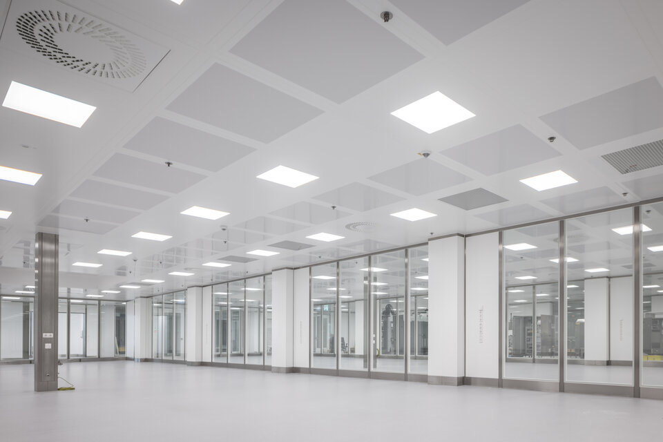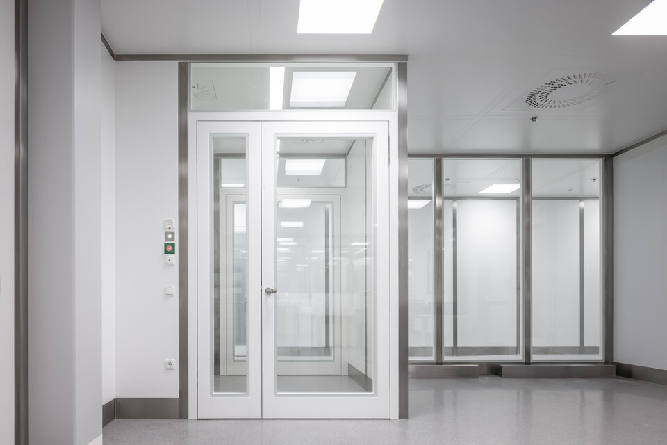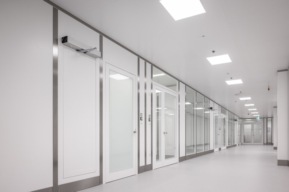 Die Lindner Group übernahm den Innenausbau dieses hochmodernen Reinraums mit spezialisierten Lösungen für maximale Hygiene und Funktionalität. Zum Leistungsumfang gehörten Stahlblechtüren, Ganzglastüren sowie verschiedene Wandkonstruktionen, darunter Gipskartonwände und die zweischaligen Pharmawände Multiclean PPH. Großflächige Verglasungen sorgen für Transparenz und eine offene Raumwirkung, während die Drehflügeltüren Swing MPH einen komfortablen Zugang ermöglichen. Ein zentrales Element ist die begehbare Reinraumdecke Line 80S Typ 2, die durch ihre modulare Bauweise eine schnelle Montage sowie einen flexiblen Austausch einzelner Deckenelemente ermöglicht. Gleichzeitig gewährleistet sie mit ihrem robusten Design einen sicheren Wartungszugang zu den darüber liegenden Installationen, was die Instandhaltung erleichtert und einen reibungslosen Reinraumbetrieb unterstützt.