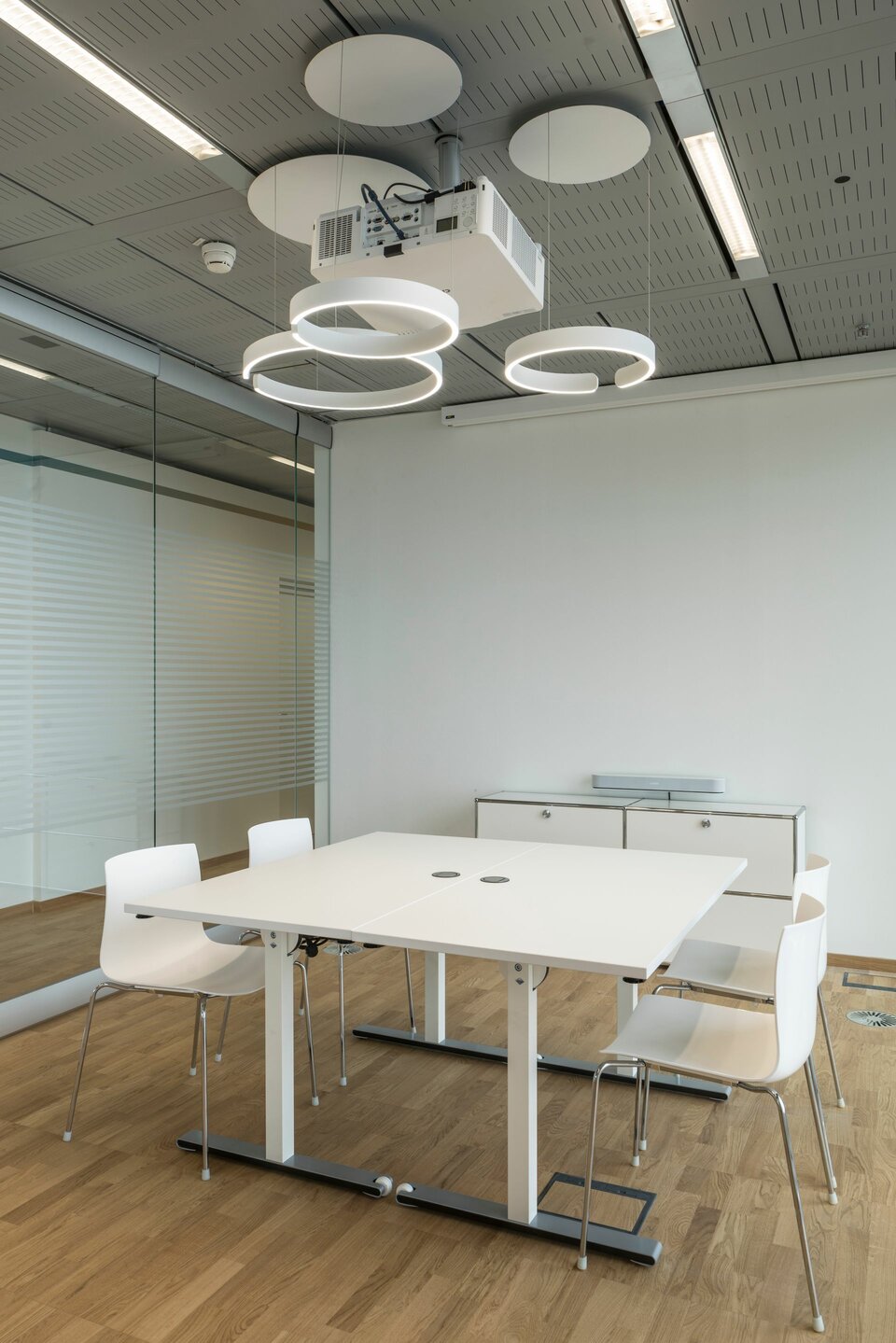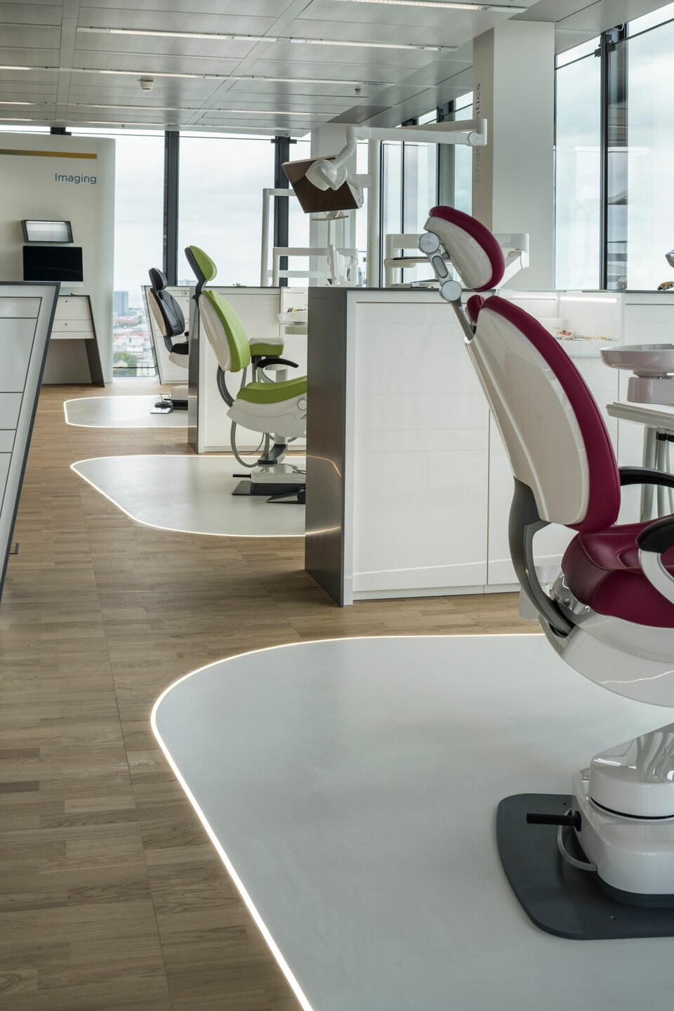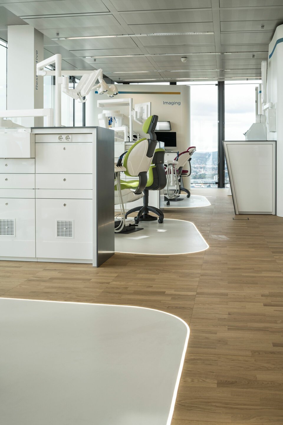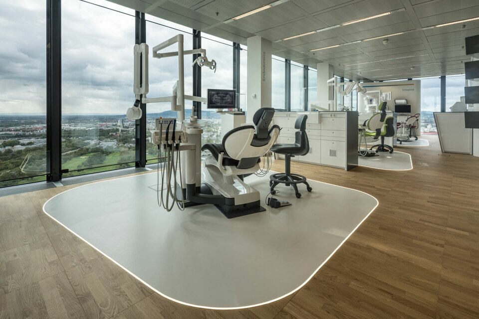 Im Zuge der Einrichtung konnte Lindner mit dem Doppelboden NORTEC und dem Hohlboden FLOOR and more® hochwertige Bodensysteme beitragen. Diese überzeugen insbesondere durch hohe Funktionalität, da die vorhandenen Hohlräume ausreichend Platz für Leitungen und Installationstechnik bieten. Die Doppelböden wurden mit Parkett vorappliziert und großflächig im Showroom verlegt. Damit konnte Design mit der Funktionalität des jederzeit zugängigen Bodenhohlraums vereint werden. Hohlböden bilden die räumliche Basis für die einzelnen Exponate, z. B. Behandlungseinheiten. Lindner führte auch die Beschichtung dieser "Inseln" aus und schuf Übergänge zwischen den Bodentypen mit LED-Lichtstreifen.