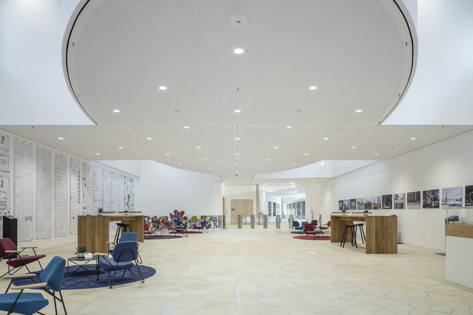 Den aufwendigen, Schallschutz optimierenden Trockenbau führte ebenfalls Lindner aus, so z. B. die wellenförmige Randblanken in den Büroflächen. In den Besprechungszonen versah man die Wände mit maßgefertigten, akustisch wirksamen GK-Vorsatzschalen. Auch die spiralförmigen Treppenhäuser ummantelten die Lindner Trockenbauteams mit einer Akustikverkleidung. Der Ausbau des ovalen Konferenzraums, oberhalb des Eingangsbereichs, stammt ebenfalls von Lindner.