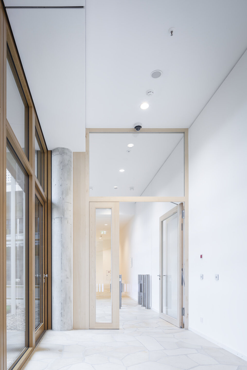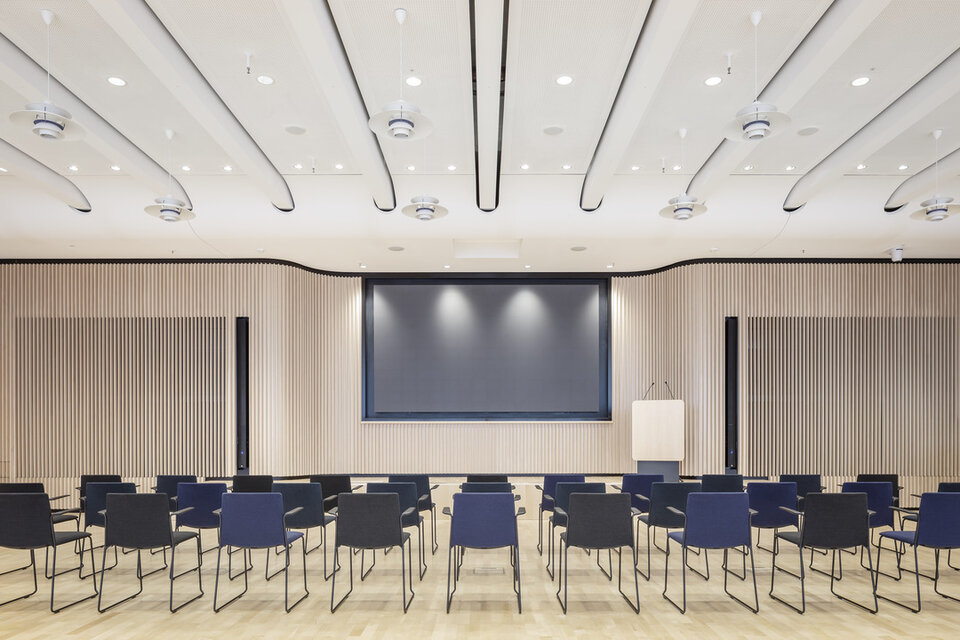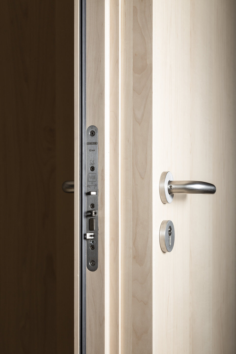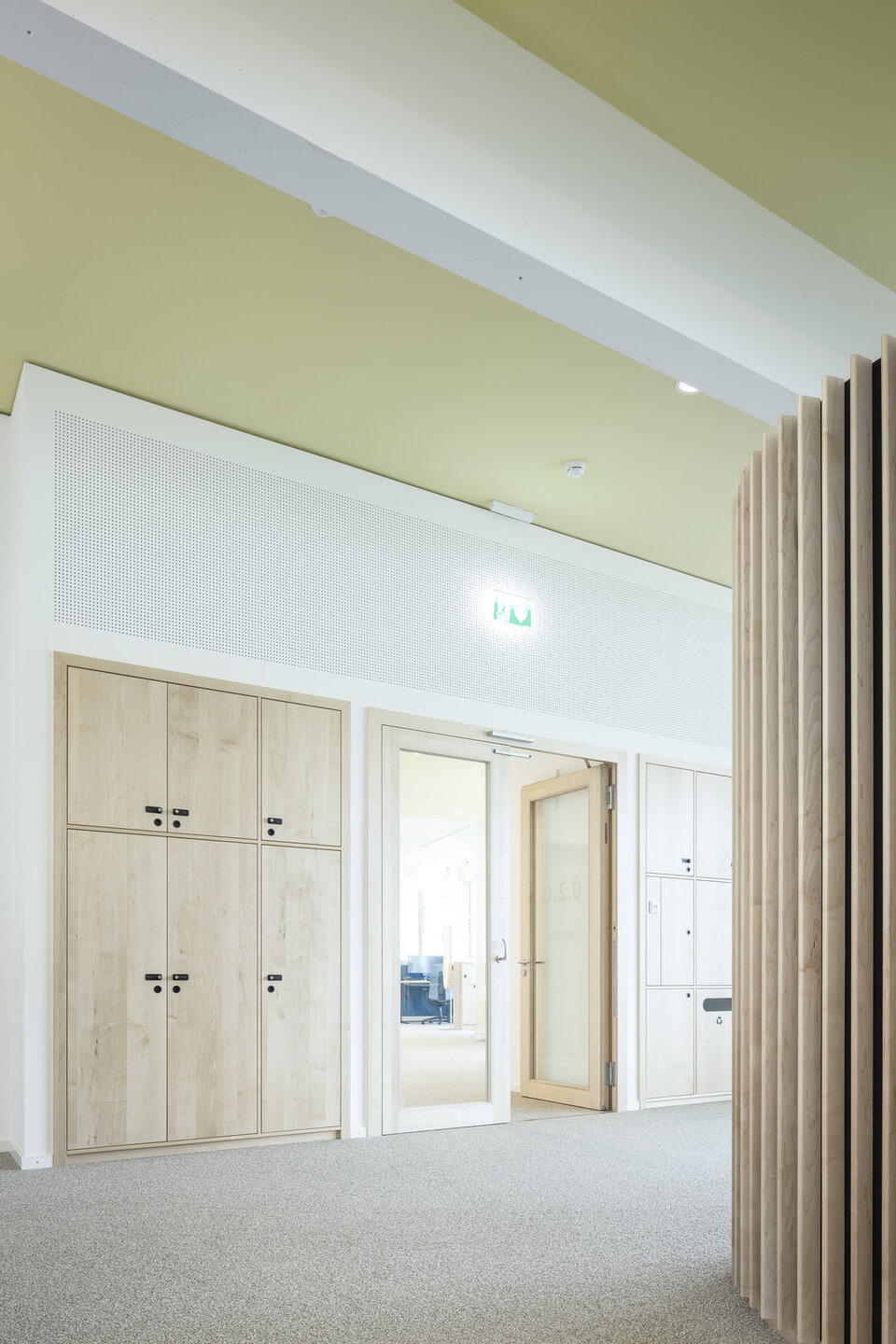 Die Lindner Objektdesign produzierte, lieferte und montierte die Holzinnentüren mit Ahornfurnier bzw. weißem HPL-Dekor, fast alle mit Lichtausschnitten bzw. Seiten- und/oder Oberlichtern. Zum Saal hin sorgt eine 100 mm starke Doppelflügeltür für einen Schallschutzwert von 42 dB. Auch die raumhohe Holzverkleidung des Zugangs wurde akustisch wirksam ausgebaut, genauso wie die Lamellenwände im Inneren des Veranstaltungsraums.
