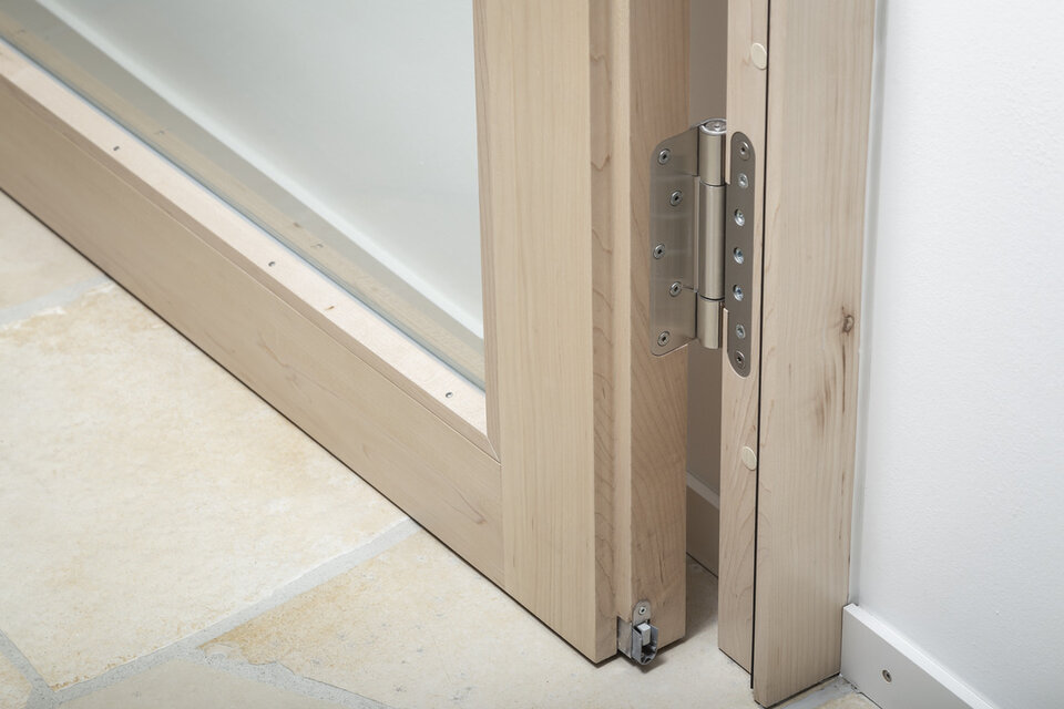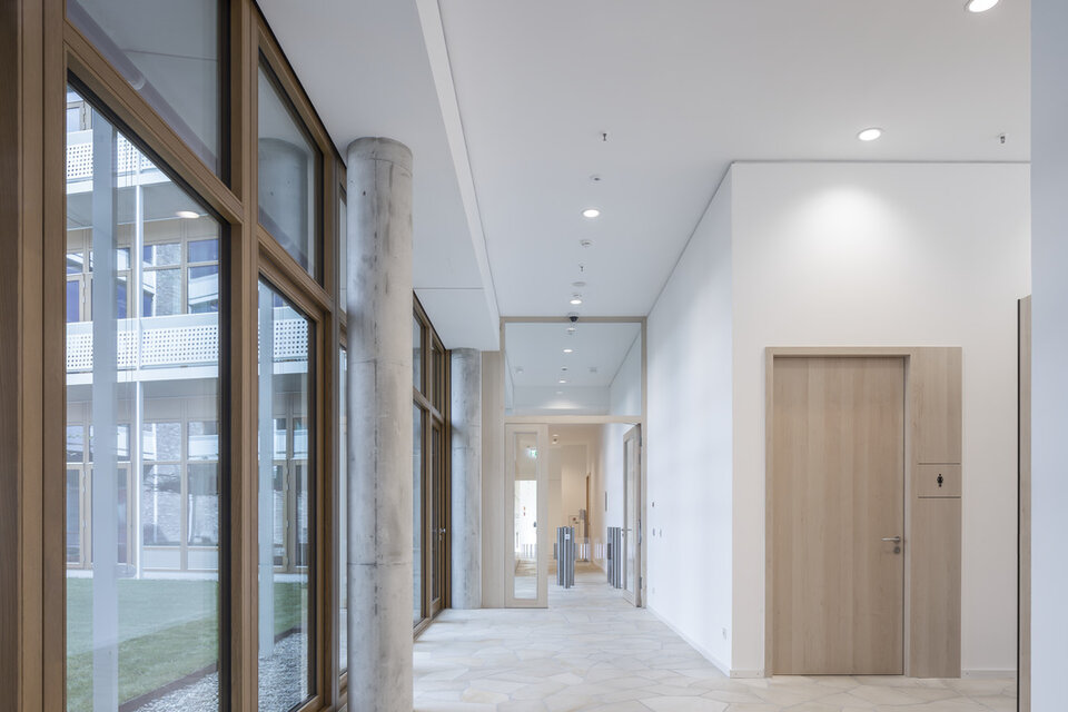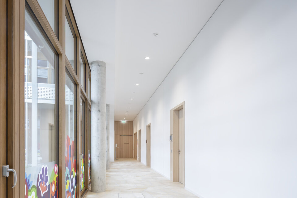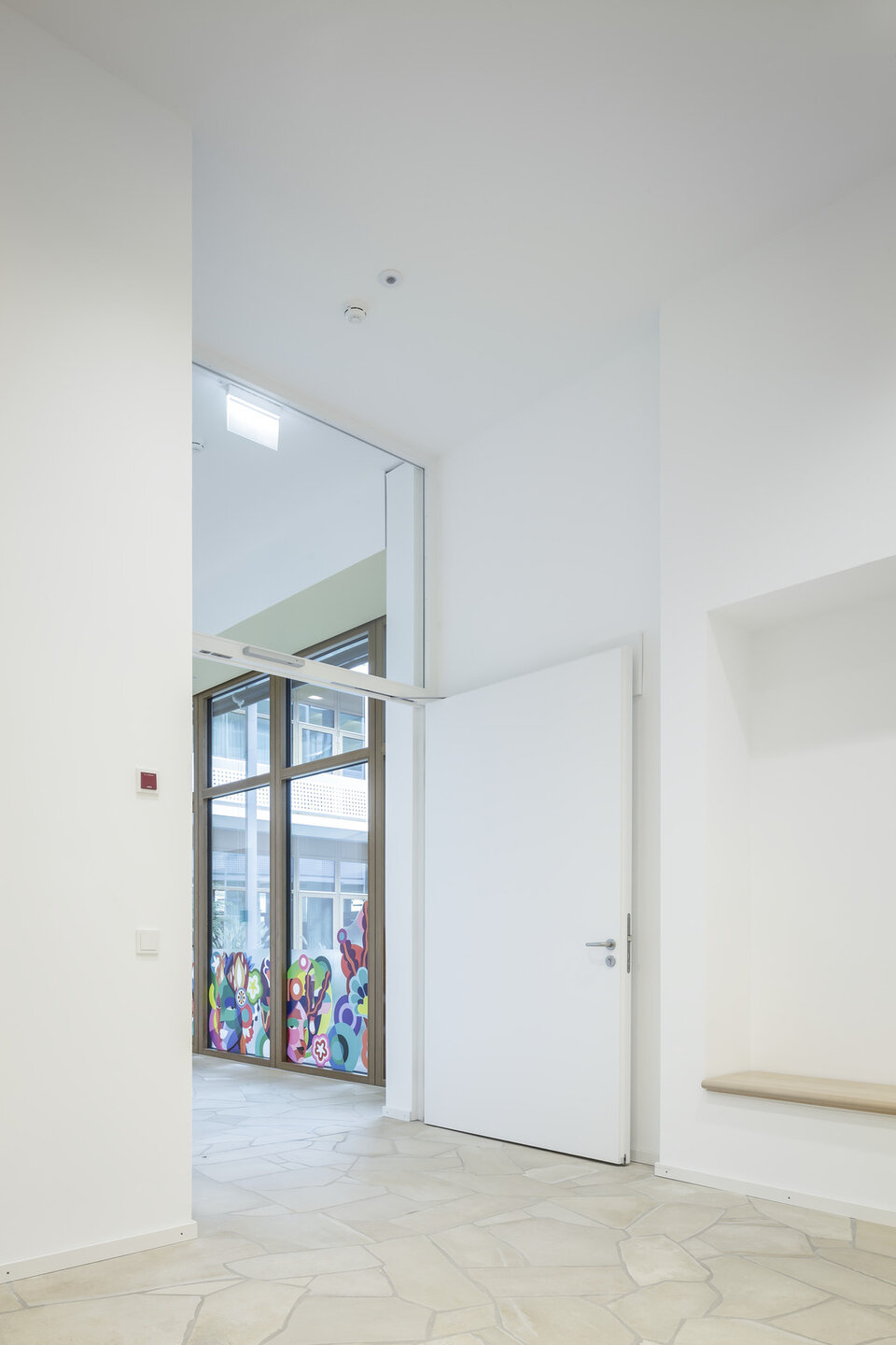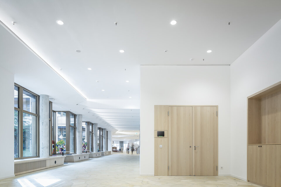 Die Lindner Objektdesign produzierte, lieferte und montierte die Holzinnentüren mit Ahornfurnier bzw. weißem HPL-Dekor, fast alle mit Lichtausschnitten bzw. Seiten- und/oder Oberlichtern. Zum Saal hin sorgt eine 100 mm starke Doppelflügeltür für einen Schallschutzwert von 42 dB. Auch die raumhohe Holzverkleidung des Zugangs wurde akustisch wirksam ausgebaut, genauso wie die Lamellenwände im Inneren des Veranstaltungsraums.