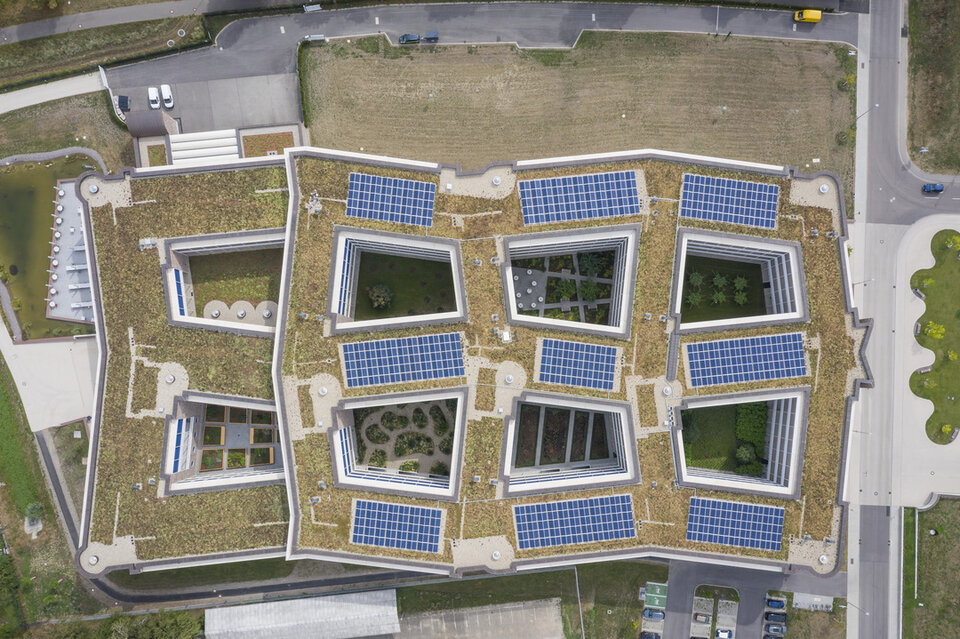 „Hier bin ich Mensch, hier darf ich sein“ – Der Satz aus Goethes Faust findet sich in der gesamten Unternehmenskultur des Drogeriemarkthändlers dm wieder. So auch in der Architektur des neuen dm Unternehmenssitzes, dem „dialogicum“ im Karlsruher Stadtteil Durlach. Auf 41.000 m² entstand ein wabenförmiges Gebäude mit max. vier Geschossen, das mit begrünten Innenhöfen viel Platz, Freiraum und Licht für bis zu 1.800 Mitarbeiter bietet. Eine Magistrale durchzieht das gesamte Gebäude und endet in ein Mitarbeiterrestaurant und einen Veranstaltungssaal für ca. 260 Personen. Ein weiteres Gebäude dient als Ausweichfläche und Parkhaus. Dessen steil zulaufendes Dach mit intensiver Begrünung grenzt optisch und akustisch von der nahen Autobahn ab.