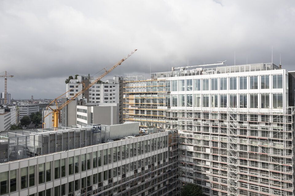 Über 100 Jahre Deutsches Institut für Normung e. V. (DIN), davon rund 50 Jahre der Hauptsitz an der Burggrafenstraße in Berlin – Gründe genug, um sowohl eine (energetische) Komplettsanierung des Ensembles (mit Gebäudeteilen aus den 1960er – 1990er Jahren) anzugehen, als auch ein völlig neue Arbeitswelt für die rund 700 Mitarbeiter zu konzipieren. Ziel war es mit dem passenden, baulichen Rahmen den Wandel der internen Organisation der DIN und somit „neue Normen“ für das 21. Jahrhundert voranzutreiben. Hierfür wurden die kleinteiligen Grundrisse entfernt und das Gebäude auf die statische Grundstruktur zurückgebaut. Auch die Außenfassade wurde neu „eingekleidet“ und mit einem Risalit über 10 Geschosse erweitert. Nun erscheint das neue DIN-Gebäude, nach Plänen von Kim Nalleweg Architekten & klm-Architekten Berlin, als ein ruhiger, monolithischer Block mit hervortretendem Haupteingang mit offenem Foyer, Mitarbeiterrestaurant und Dachterrasse.