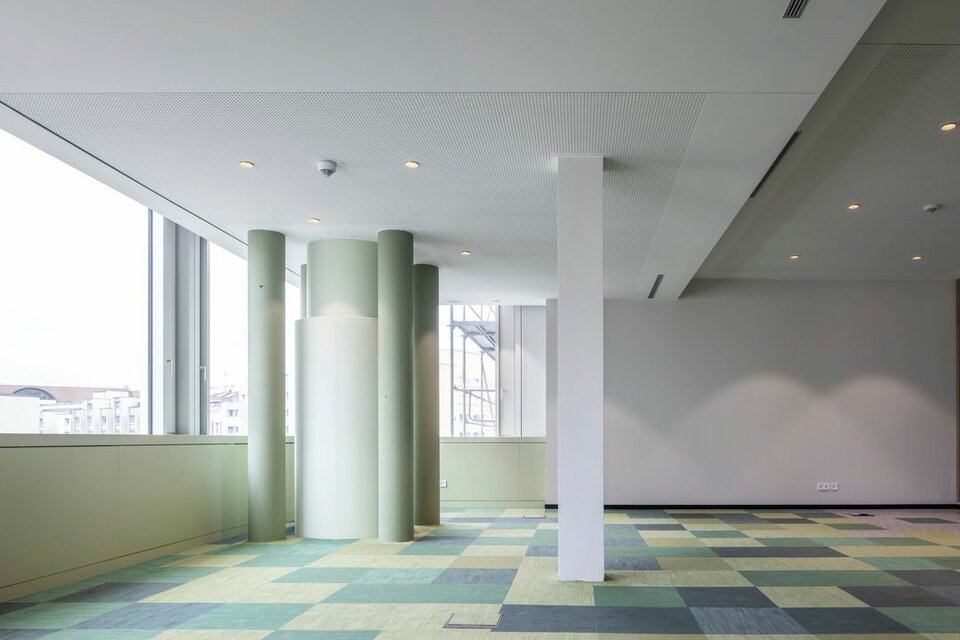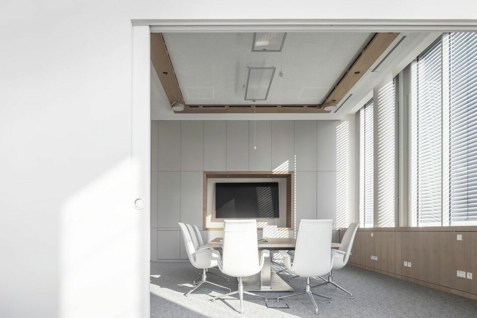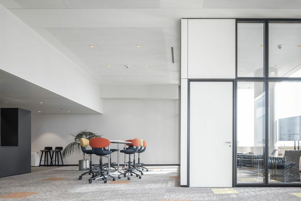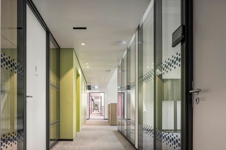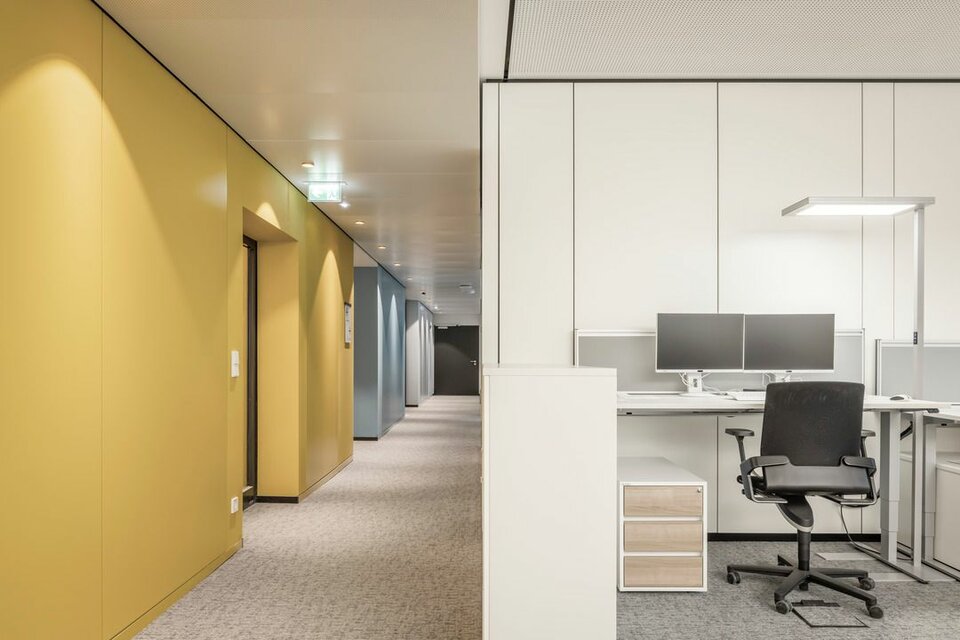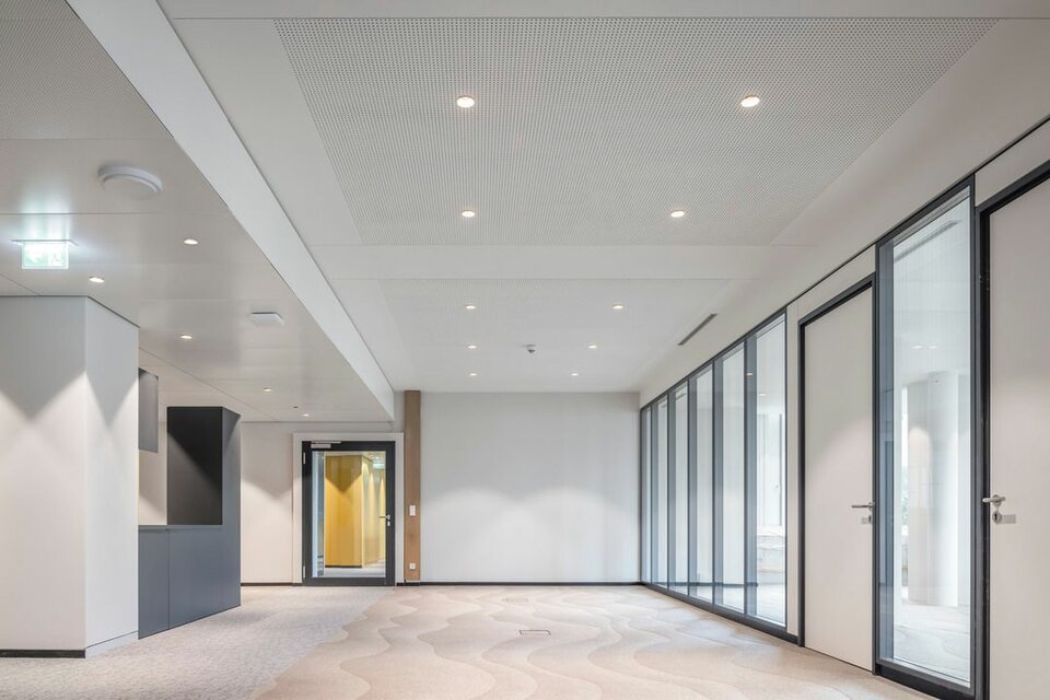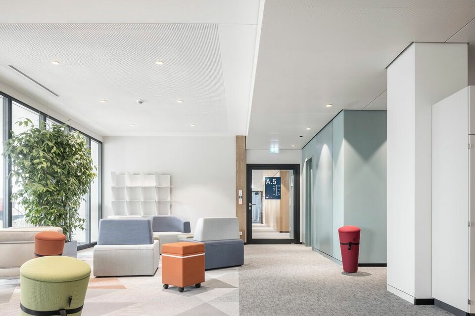 2019 erhielt die Lindner Group den Auftrag für den Ausbau der Bürowelten, inklusive Ertüchtigung der TGA und sämtlicher Elektrogewerke. In nur 19 Monaten wurden rund 20.000 m² in moderne, farblich abgestimmte Arbeitswelten mit verschiedenen Arbeitsplatzsituationen geschaffen. Neben hohem Designanspruch setzte man auf hohen Raumkomfort und eine effiziente Funktion. Hier war Lindner nicht nur für den Ausbau zuständig, sondern lieferte auch einen Großteil der verbauten Systeme, wie zum Beispiel Metalldecken, zum Teil als Heiz-/Kühlelemente verbaut, oder akustisch optimierte Wandpaneele. Die Arbeits- und Besprechungsbereiche wurden mit GK-Trennwänden separiert, ergänzt mit Lindner Glastrennwänden bzw. Wandelementen mit Holzoberflächen. Auch die Holztüren und Türenelemente aus Eiche geräuchert stammen von Lindner, genauso wie Sondermöbel für die neu gestalteten Begegnungs- und Pausenzonen. Für einen reibungslosen, termingerechten Ablauf sorgte die Projektabwicklung nach Lean Construction Methoden. Durch die kollaborative und transparente Planung und Steuerung wurde das Projekt, trotz aller Herausforderungen, die eine Sanierung mit sich bringt, gemeinschaftlich erfolgreich abgewickelt.
