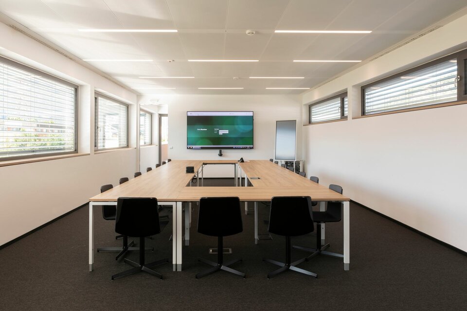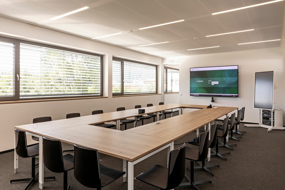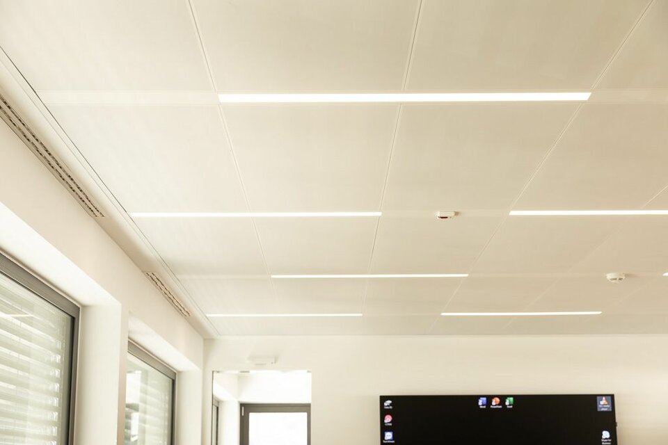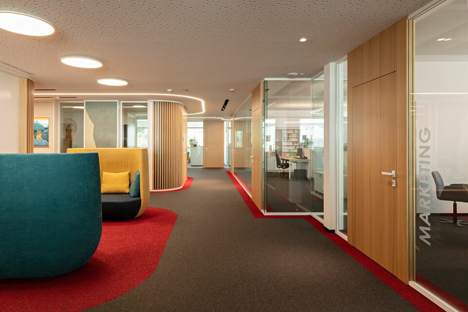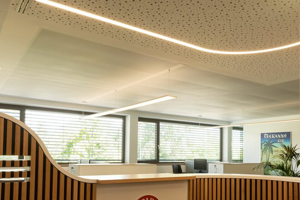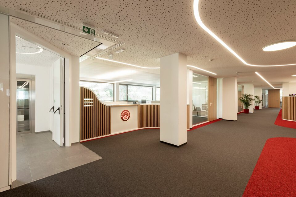 Für die Erweiterung des Bürotraktes am bestehenden Firmensitz realisierte Lindner Deckensysteme mit integrierten Leuchten: In Kombination mit dem Farbkonzept zonieren die LED-Schienen die Bereichsgrenzen – ganz ohne den Einsatz von Trennwänden. Die akustisch wirksamen Lindner Heiz- und Kühldecken, teils mit tiefmatter Pulverbeschichtung, sorgen für angenehmes Klima und eine ruhige Arbeitsumgebung. Das Hohlbodensystem von Lindner nimmt Installationen auf und ist frei von schädlichen Emissionen.