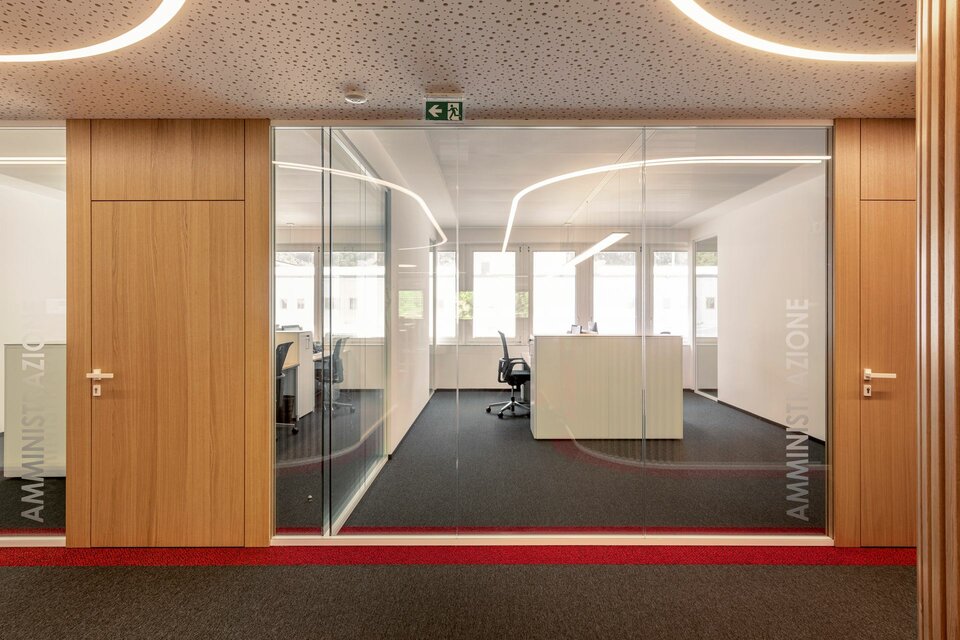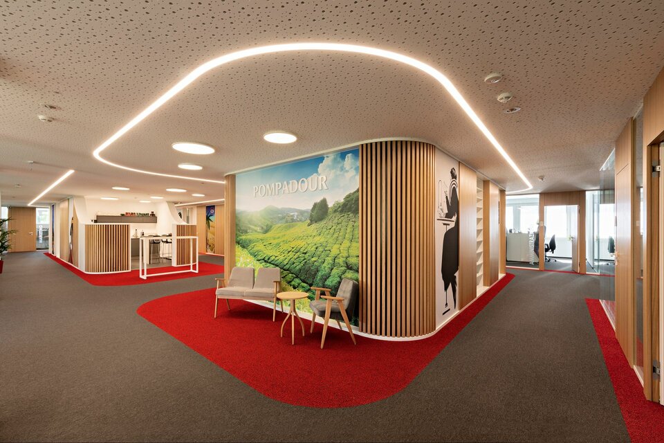 Das italienische Standbein der deutschen Teekanne-Gruppe erweiterte seine Zentrale in Bozen um zusätzliche Büroflächen. Besonderer Wert wurde dabei auf ein qualitativ hochwertiges Arbeitsumfeld gelegt, in dem sich Mitarbeiterinnen und Mitarbeiter sowie Kunden wohlfühlen: Eine weiche Linienführung strukturiert die Bürozonen, akustisch wirksame Elemente und markante Farben runden den Gesamteindruck ab.