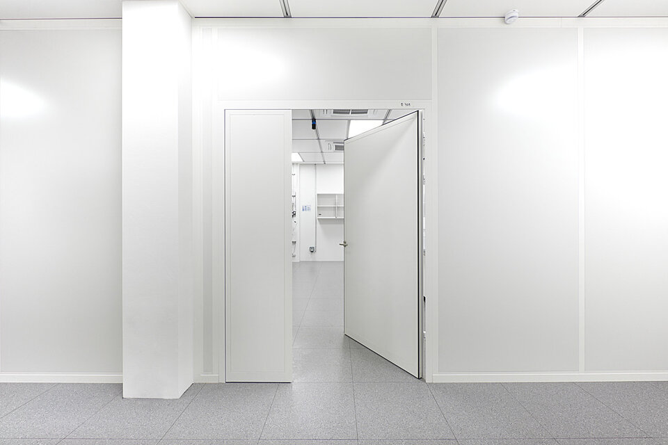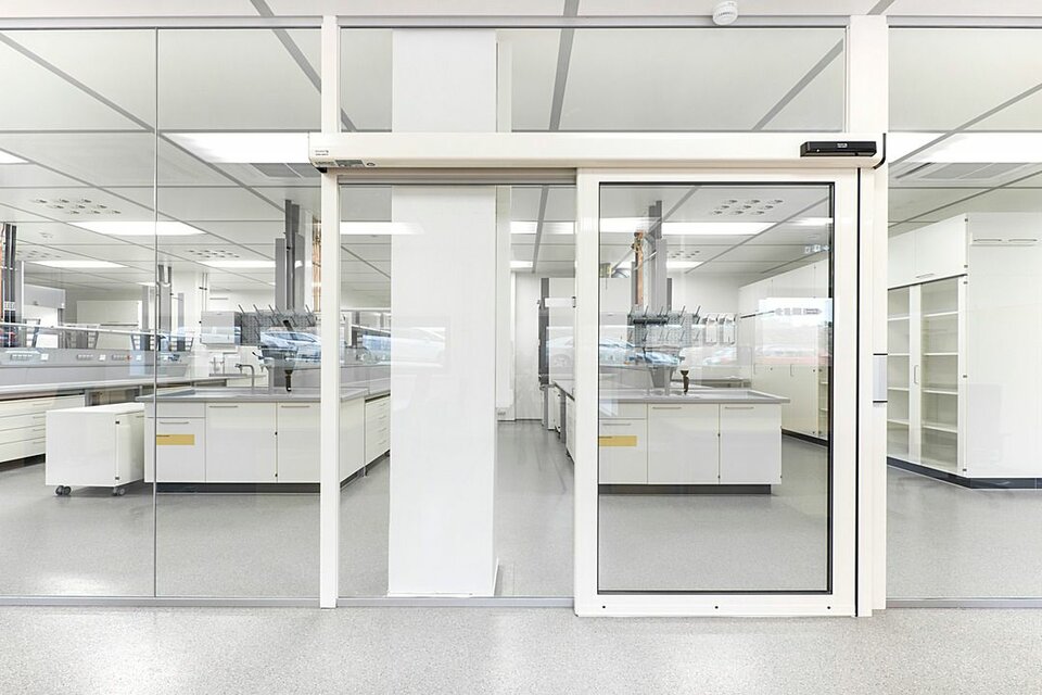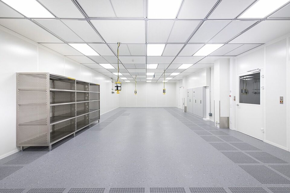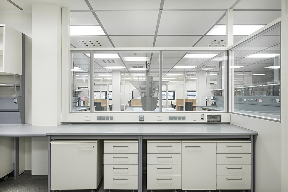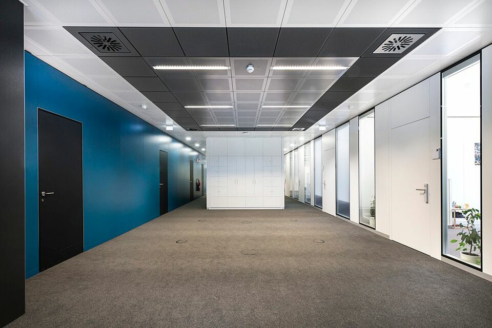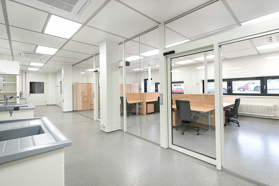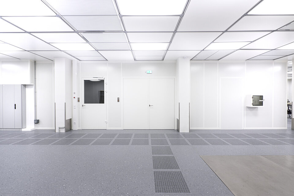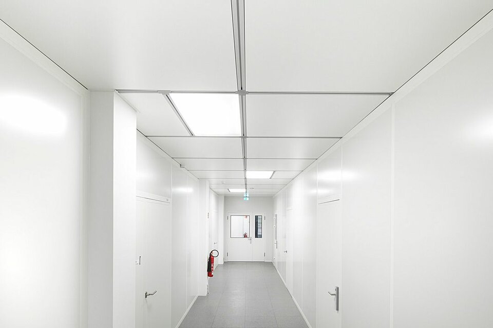 Lindner Reinraumtechnik wurde mit dem Ausbau der Labor- u. Reinraumbereiche beauftragt. Diese Bereiche wurden mit zahlreichen Produkten aus dem Lindner-Angebotsspektrum ausgestattet, darunter Decken, Wände, Böden und Schleusensysteme; zahlreiche Sonderlösungen bedienten die Ansprüche des Projekts. So wurde an einer Stelle ein ganzer Reinraum freistehend errichet, um ein spezielles Belüftungskonzept umzusetzen. In den Bürobereichen des Gebäudes schuf die Lindner AG räumliche Trennung zwischen den zentralen Fluren und den Büros, indem sie Lindner Trennwandsysteme montierte. Die Besprechungszimmer in den Fluren wurden auf die gleiche Art separiert. Schallabsorber mit Stoffbezug schaffen verbesserte Akustik. Neben Trennwänden wurden auch Deckensysteme aus dem Hause Lindner verbaut. LMD-E Einhängedecken finden sich in allen Büros und Flurwegen, wo ihre Optik mit sog. Streckmetallkränzen aufgewertet wurde. Mit Perforation und integrierter Lüftungstechnik bieten die Systeme zudem auch Vorteile im Bezug auf Funktionalität.