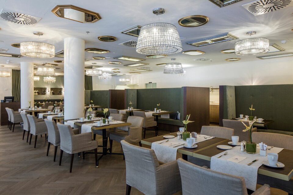 Im Zuge der Innenausbauarbeiten erhielt die Lindner Mobilier s.r.o. den Auftrag für die Herstellung und Montage von Einbaumöbeln in den öffentlichen Bereichen, darunter Wandverkleidungen, Schränke, Trennwände, Spiegel, Theken und Fensterbänke.