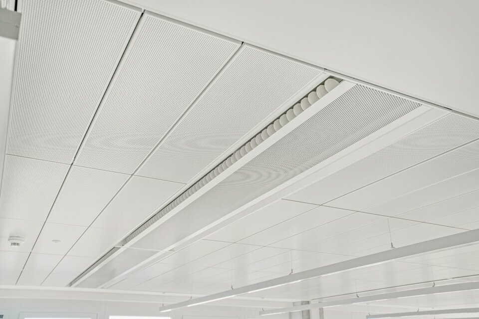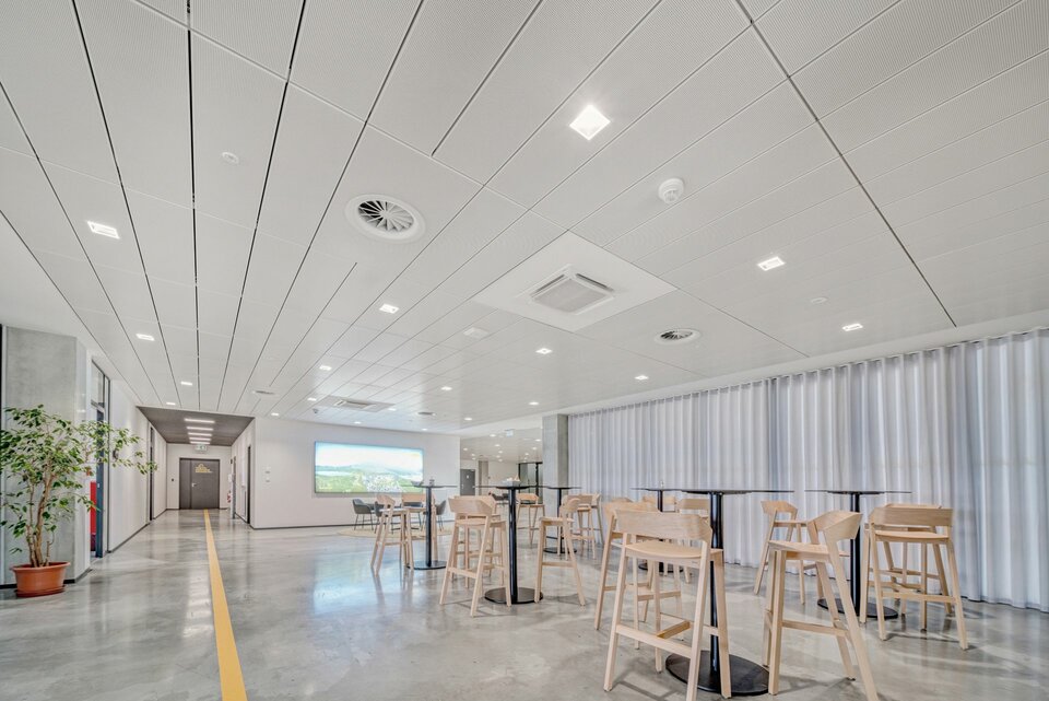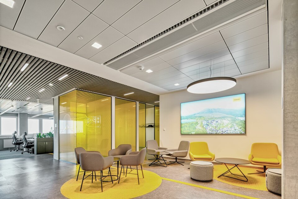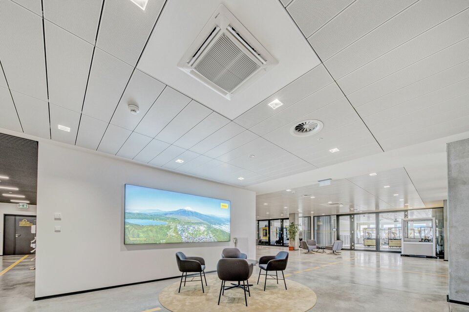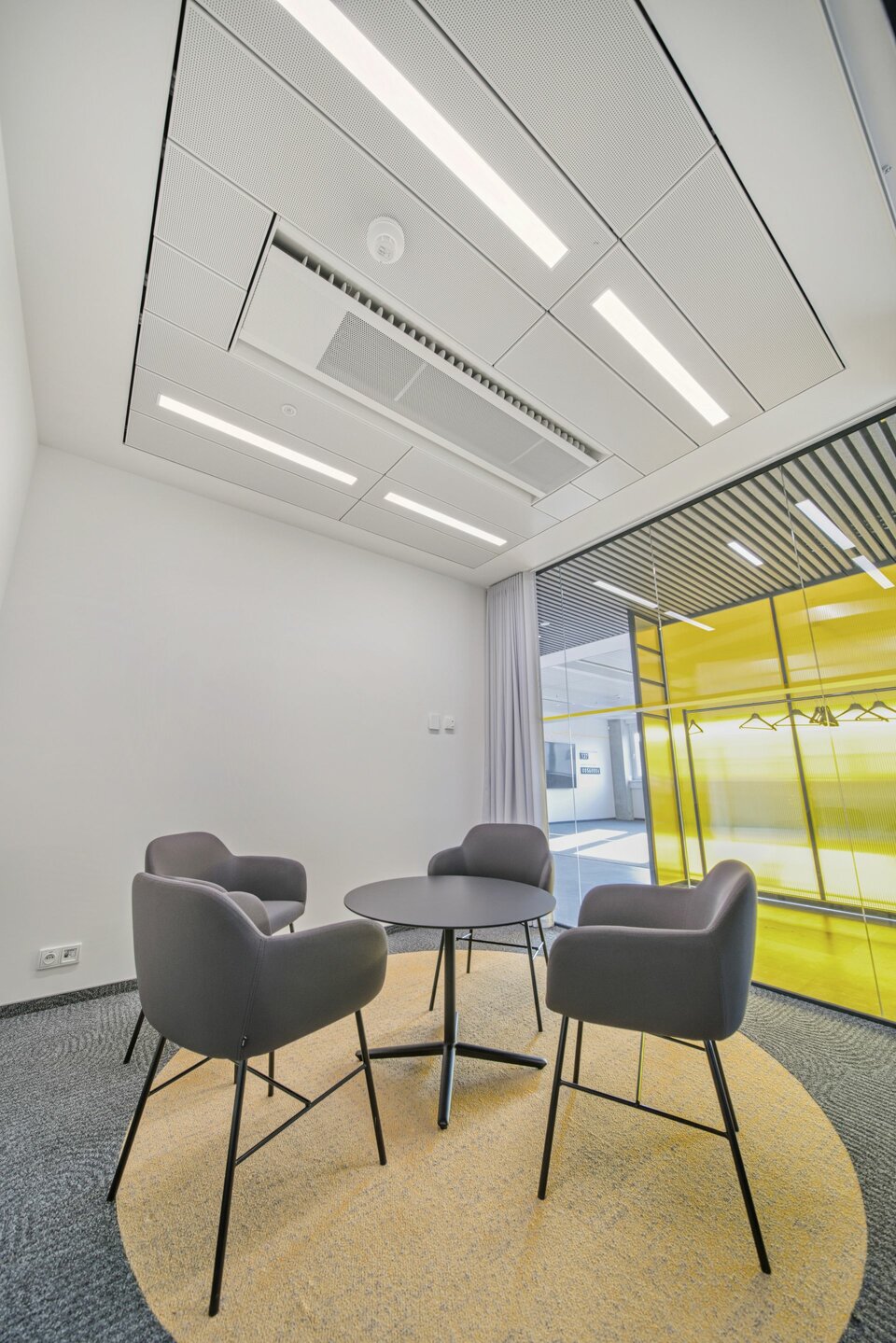 Wie auch an der Außenfassade leicht zu erkennen sind die Unternehmensfarben von FANUC gelb und grau. Gelb findet sich daher auch als markantes Gestaltungshighlight im Interieur und als Leitsystem in den neuen Büroflächen wieder. Begleitend wurden Wände und Decken eher dezent gestaltet und verstärkt auf technisch-funktionale Qualitäten gesetzt. So wählte man für die Decken in den Arbeitsbereichen Lindner Metall-Einhängedecken mit offenen Fugen, die als homogene Deckenfläche ausgeführt wurden. Diese ermöglichen nicht nur einfache Integration von Leuchten und technischen Einbauten, sondern auch eine einfache werkzeuglose Revision dank einzel abklappbaren Deckenelementen.