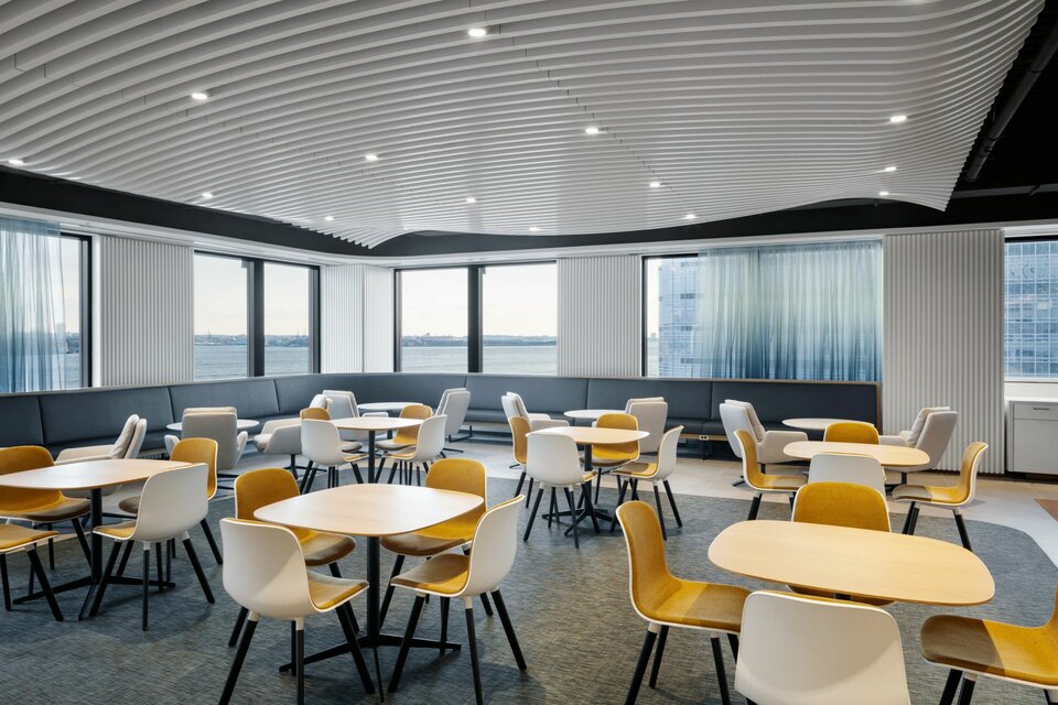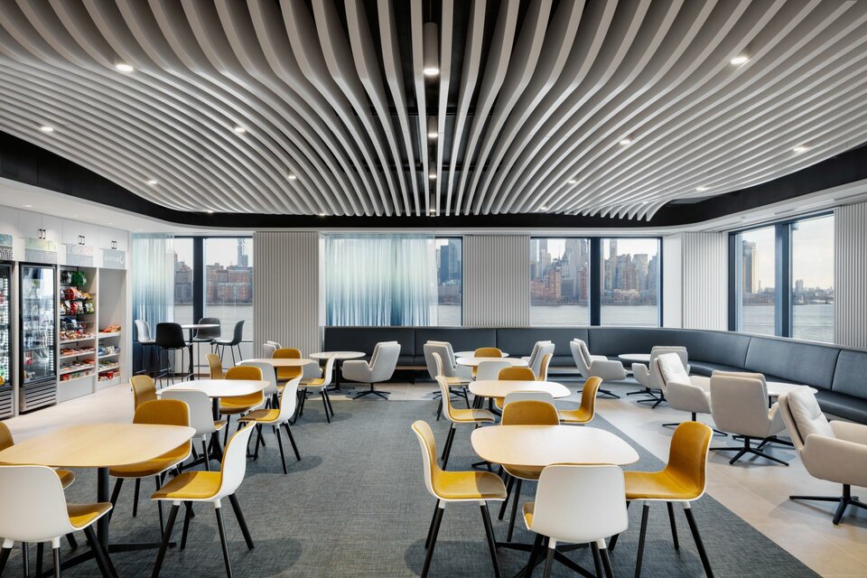 Die Lindner LAOLA Metalllamellendecke im wellenförmigen Design wurde im Büro eines New Yorker Finanzinstituts eingesetzt, um dem Raum eine dreidimensionale Ästhetik zu verleihen.