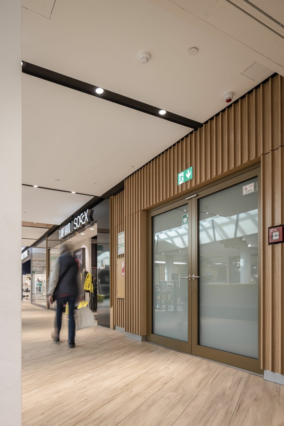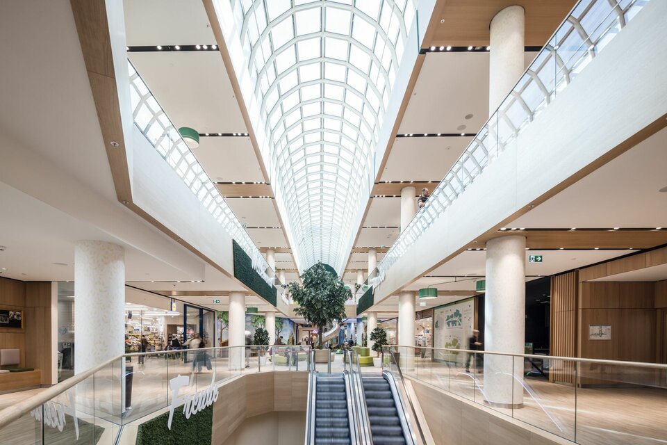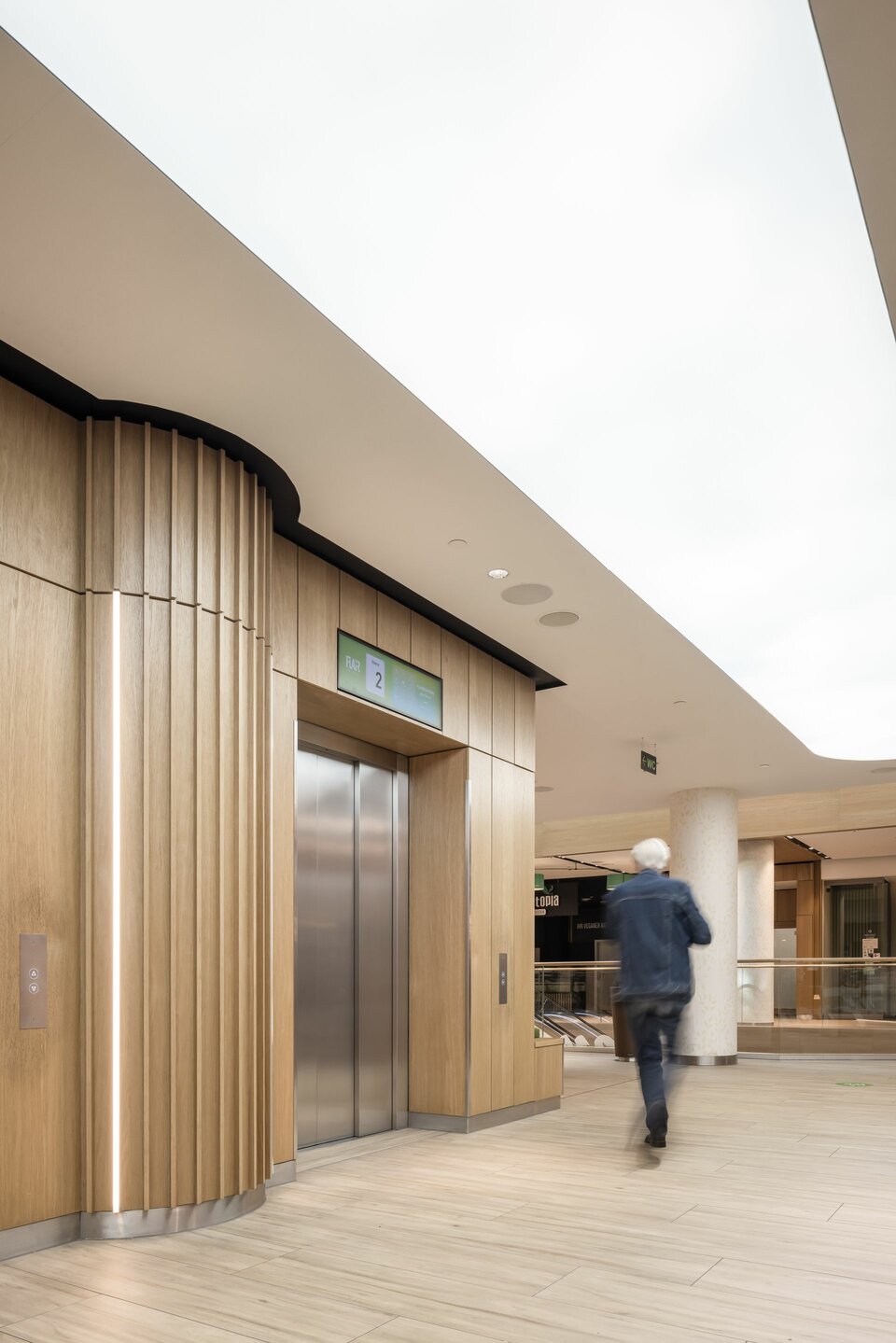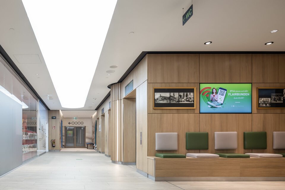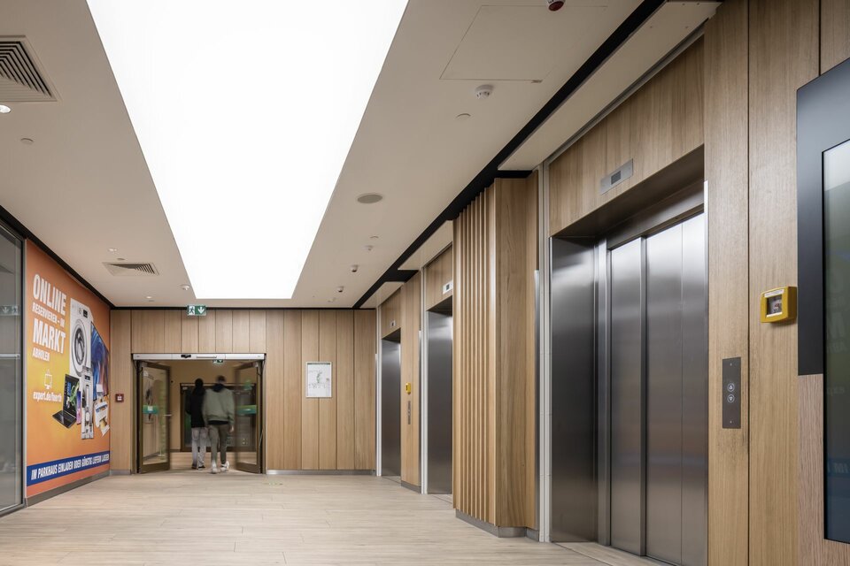Passend zur natürlichen Optik des Einkaufszentrums produzierte, konfektionierte und montierte Lindner die Wand- und Deckenbekleidung FIREwood in sämtlichen öffentlichen Bereichen des Untergeschosses sowie des ersten und zweiten Erdgeschosses. Dabei treten die FIREwood Paneele sowohl in kleinen und großen Ausführungen als auch als Lamellen auf. Als Oberfläche wurde ein Echtholzfurnier der europäischen Eiche gewählt. Die Lindner FIREwood überzeugt jedoch nicht nur optisch, sondern auch in funktionaler Hinsicht: Die Verbundwandbekleidung ist schallabsorbierend und nichtbrennbar und schafft so eine angenehme und sichere Umgebung.