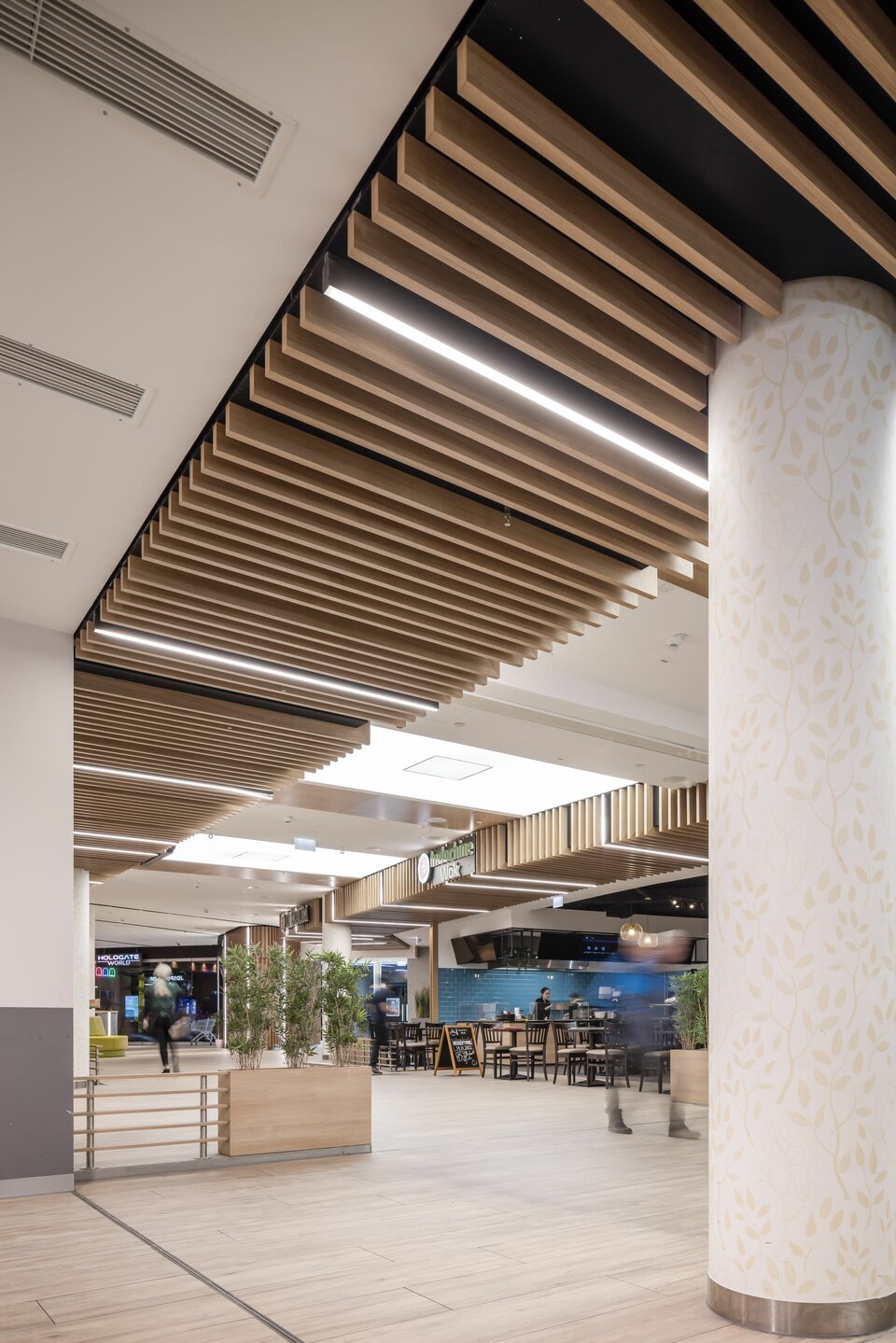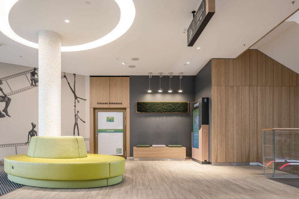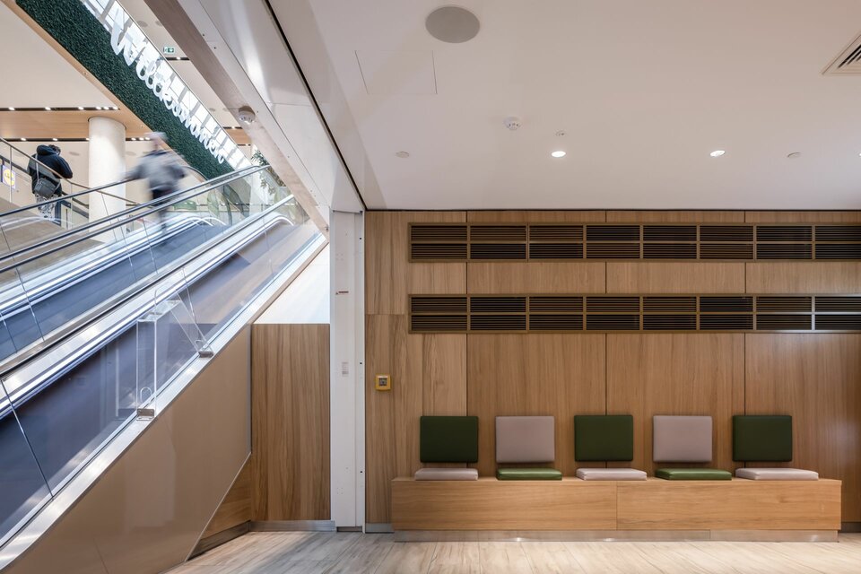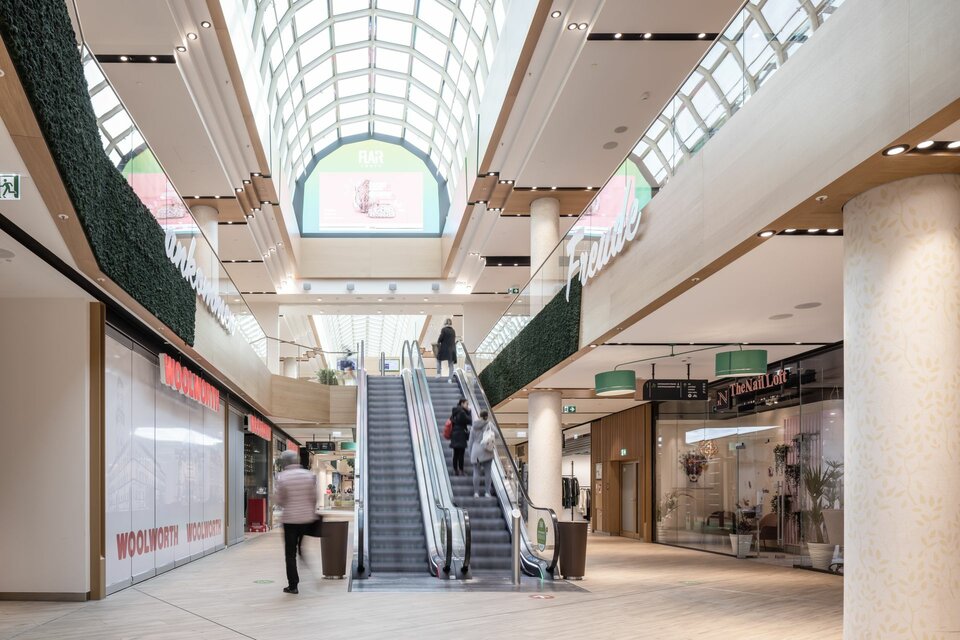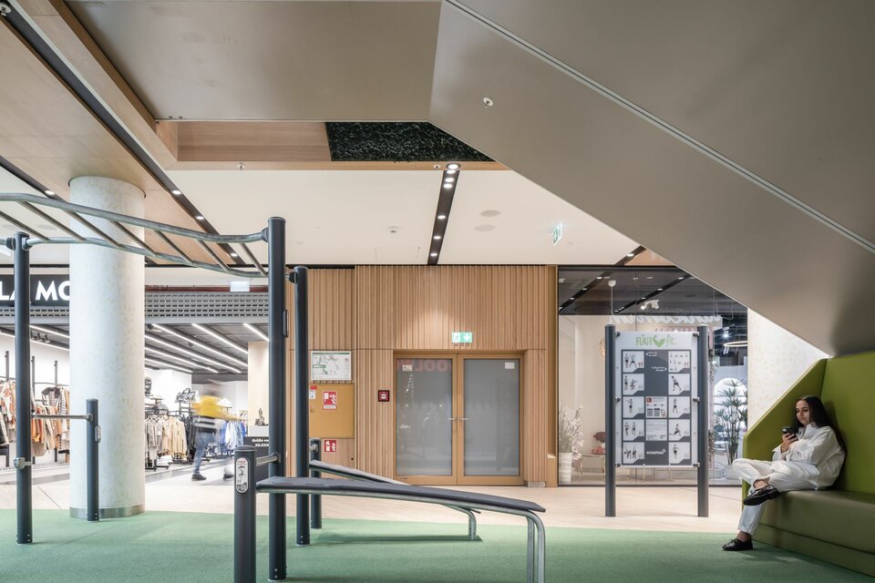 Passend zur natürlichen Optik des Einkaufszentrums produzierte, konfektionierte und montierte Lindner die Wand- und Deckenbekleidung FIREwood in sämtlichen öffentlichen Bereichen des Untergeschosses sowie des ersten und zweiten Erdgeschosses. Dabei treten die FIREwood Paneele sowohl in kleinen und großen Ausführungen als auch als Lamellen auf. Als Oberfläche wurde ein Echtholzfurnier der europäischen Eiche gewählt. Die Lindner FIREwood überzeugt jedoch nicht nur optisch, sondern auch in funktionaler Hinsicht: Die Verbundwandbekleidung ist schallabsorbierend und nichtbrennbar und schafft so eine angenehme und sichere Umgebung.