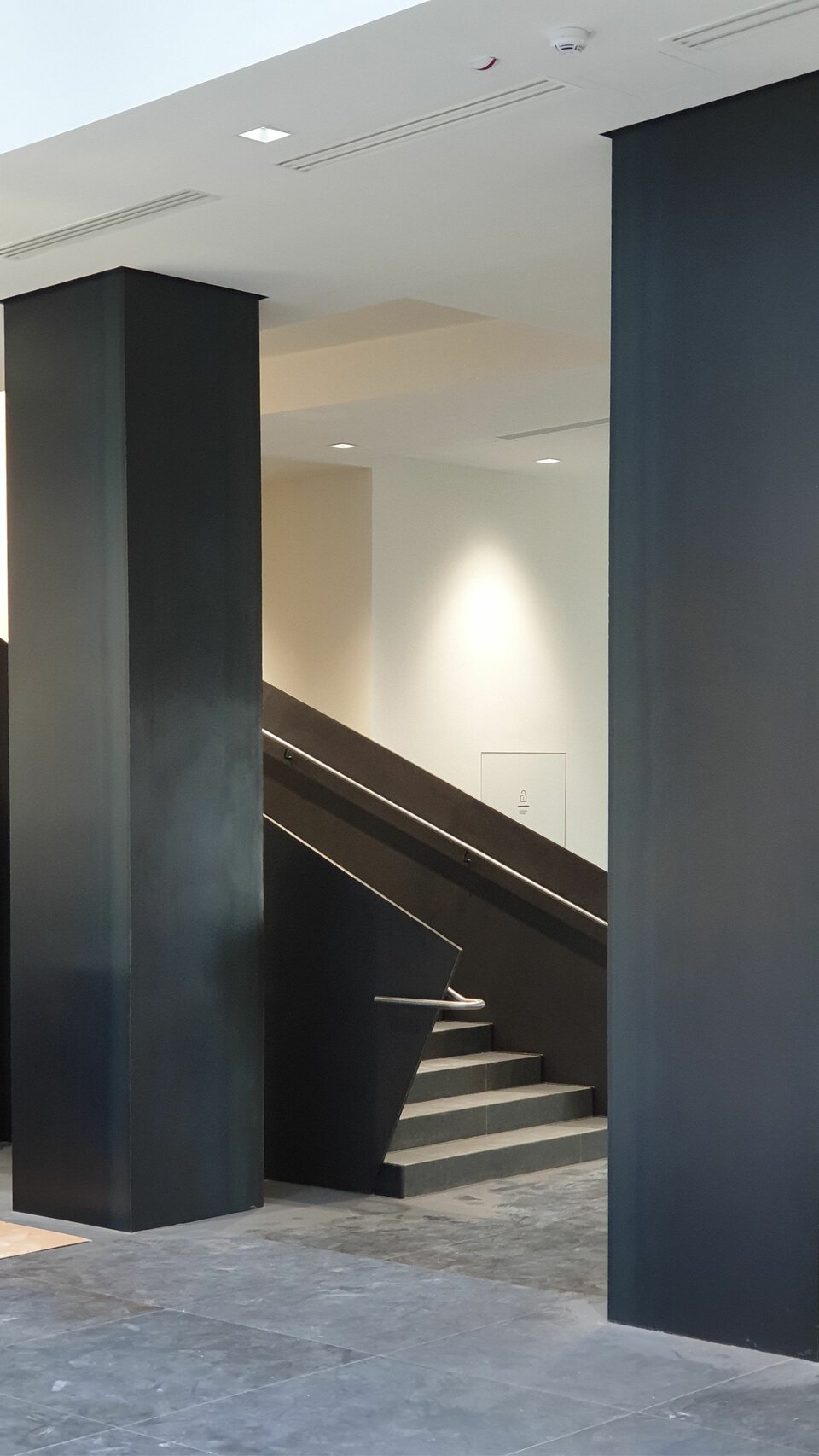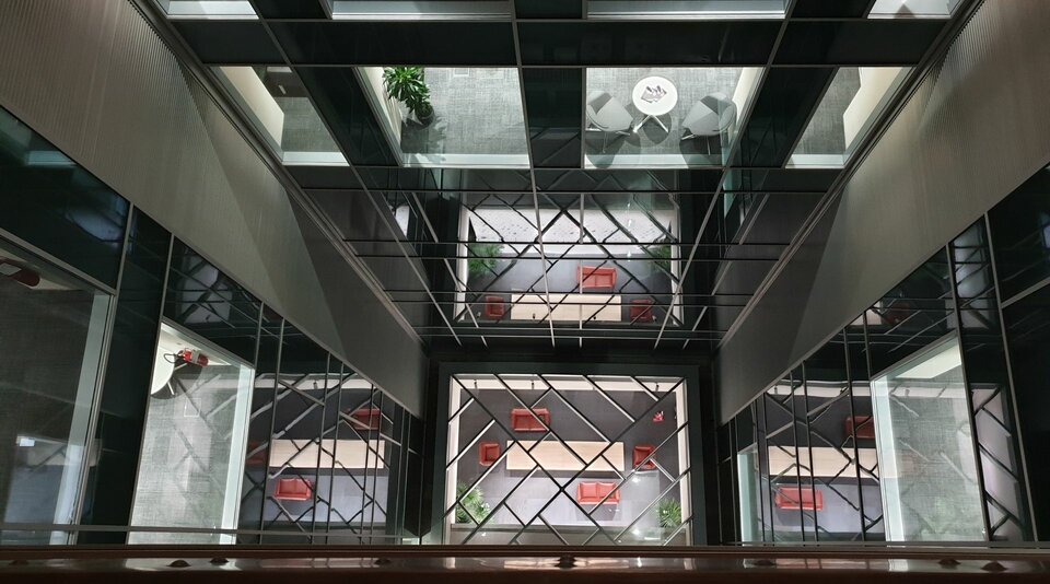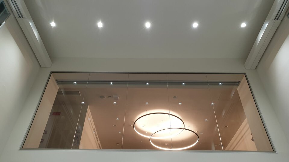 Lindner realisierte im historischen Gebäude Gipskarton-Heiz- und Kühldecken vom Typ Plafotherm® GK HEKDA. Das wirtschaftliche Deckensystem sorgt dank des Heizung bzw. Kühlung über Strahlung für ein angenehmes Raumklima ohne Zugluft während der Schulungen. Die fugenlose Oberfläche der Decke wurde in glatter Ausführung und mit integrierten Leuchten realisiert. Auch flexible Formen und Höhensprünge können mithilfe des Systems einfach gestaltet werden.