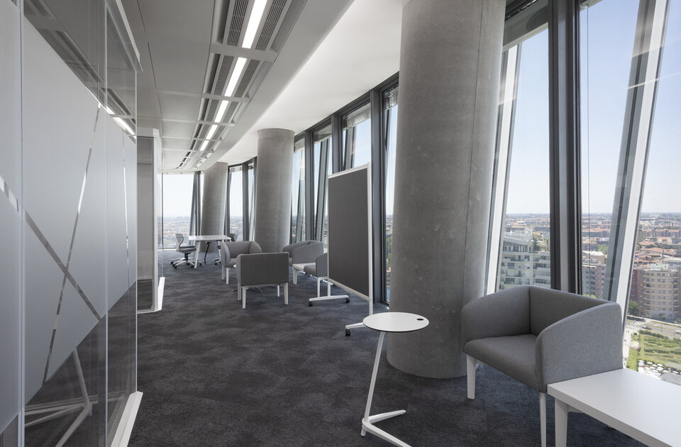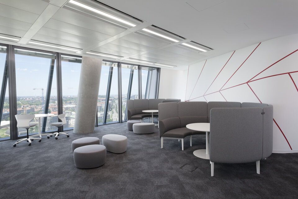 Der Turm wurde großflächig mit Lindner Doppelböden des Typs NORTEC ausgestattet. Durch diese Lösung konnten technische Installationen und Kabeltrassen geschickt im Bodenhohlraum verborgen werden um größere architektonische Freiheit zu gewinnen. An den erforderlichen Stellen wurden passende Auslässe geschaffen. Darüber hinaus kann der Boden an jeder beliebigen Stelle geöffnet werden, was Wartungsarbeiten begünstigt. Ein attraktives Finish wird über bauseitig aufgebrachte Bodenbeläge erreicht.