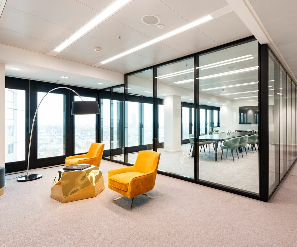Im Rahmen der Kernsanierung des Frankfurter Büroturms wurde die Lindner Group mit dem kompletten Grundausbau sowie einem der Mieterausbauten betraut. Neben der Durchführung von diversen Trockenbauarbeiten wurden zudem langlebige Doppelböden und energieeffiziente Heiz-/Kühldecken kombiniert mit Leuchtensystemen von Lindner eingebaut. Qualitativ hochwertige Holztüren aus eigener Fertigung, dazugehörige Tischlerarbeiten sowie flexible Systemglastrennwände runden das Ausbaupaket ab. Auch die Putz- und Malerarbeiten sowie Fliesen-, Beschichtungs- und Bodenbelagsarbeiten und weitere Monteurleistungen wurden von Lindner ausgeführt.