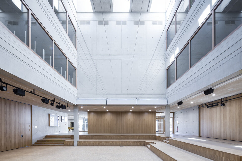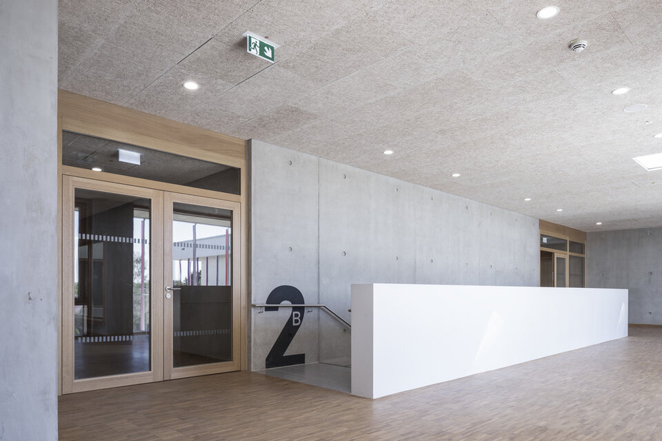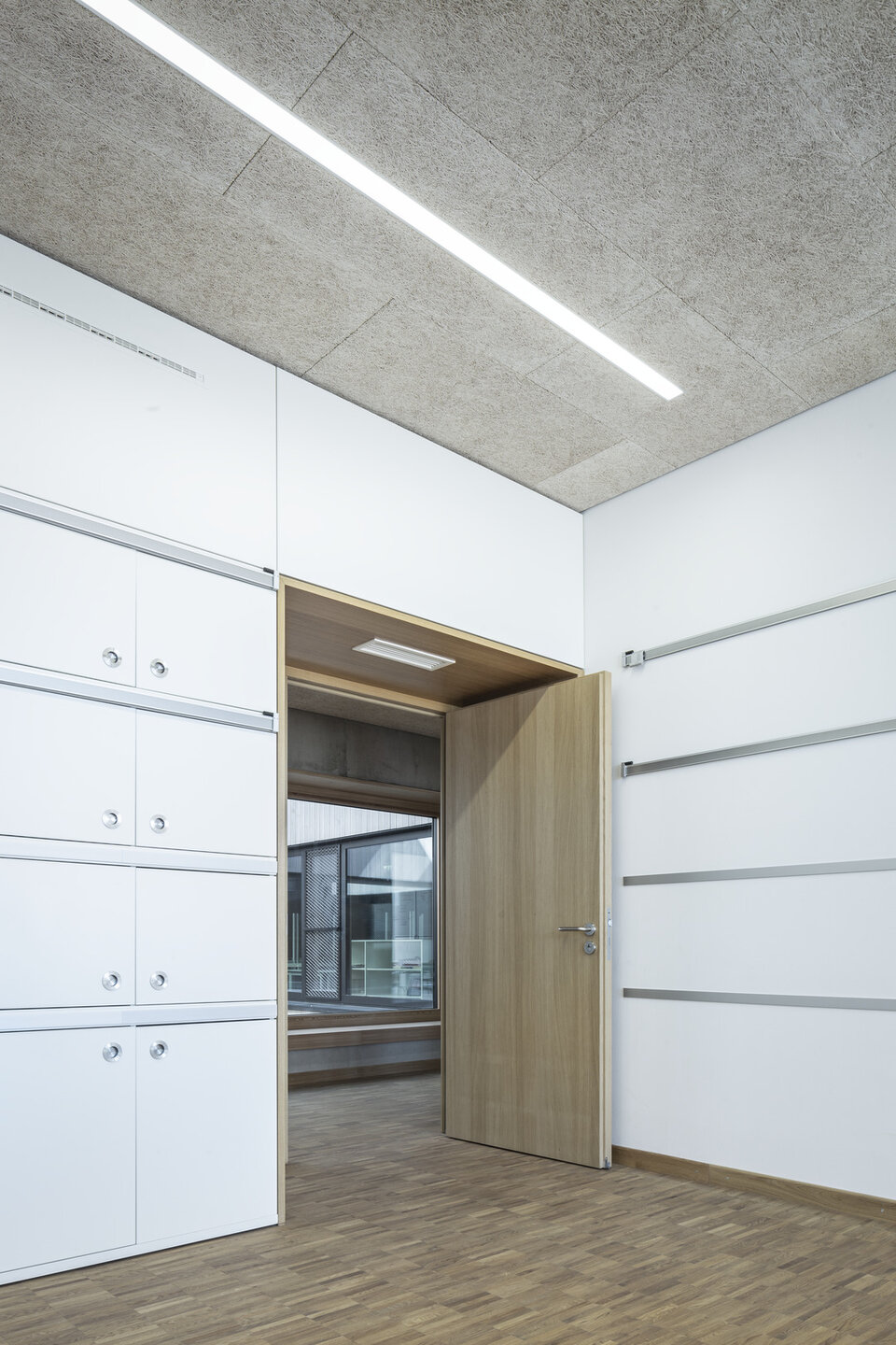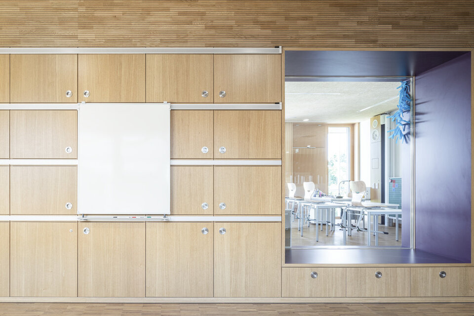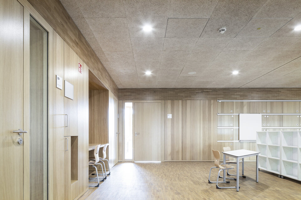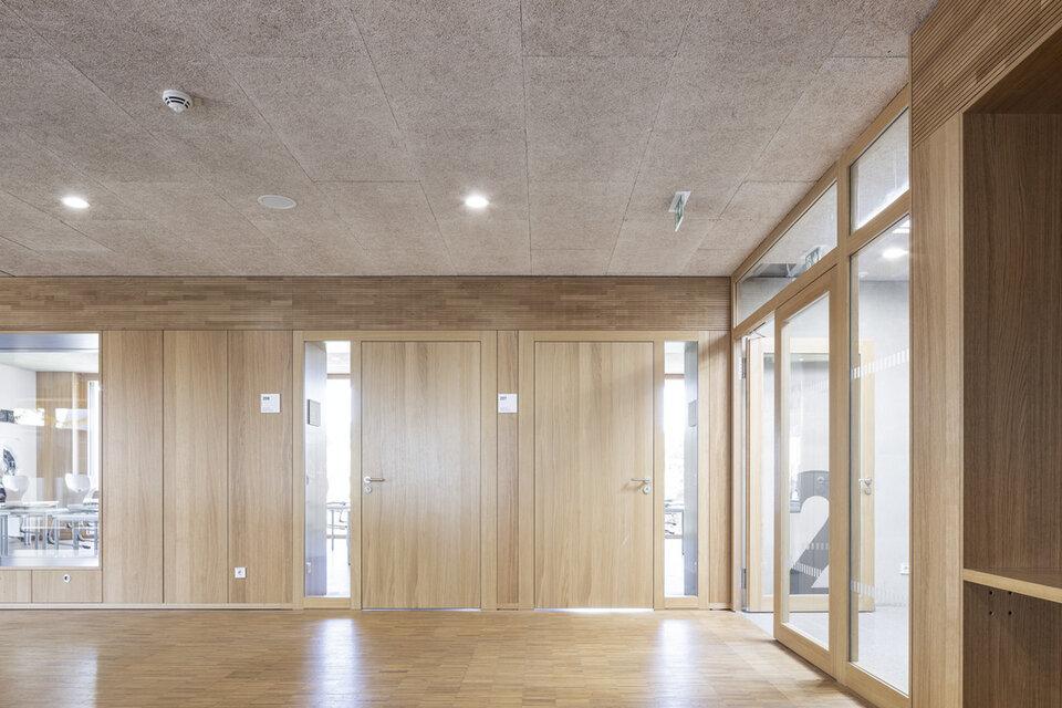 Lindner produzierte, lieferte und montierte knapp 250 Holzinnentüren sowie mehrere hundert Quadratmeter Wandbekleidung, Schranksysteme und Einbaumöbel in passendem Eichenfurnier bzw. weißem HPL-Dekor. Die Türen in den Fluren und Klassenzimmern erfüllen sämtliche Anforderungen an Brand- und Schallschutz. Als Experten für Sonderanfertigungen beauftrage man Lindner für großflächige, mobile Trennwandlösungen, die die Musikräume zur Aula hin öffnen. Für die Wandbekleidung im Eingangsbereich und in der Aula wählte man die brandschutzgeprüften, echtholzfurnierten Wandpaneele Lindner FIREwood in Baustoffklasse A2. Passend zu den anderen Holzelementen in der Aula ebenfalls in Eiche ausgeführt.