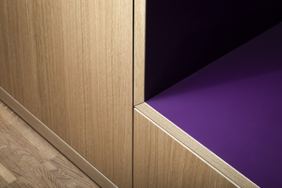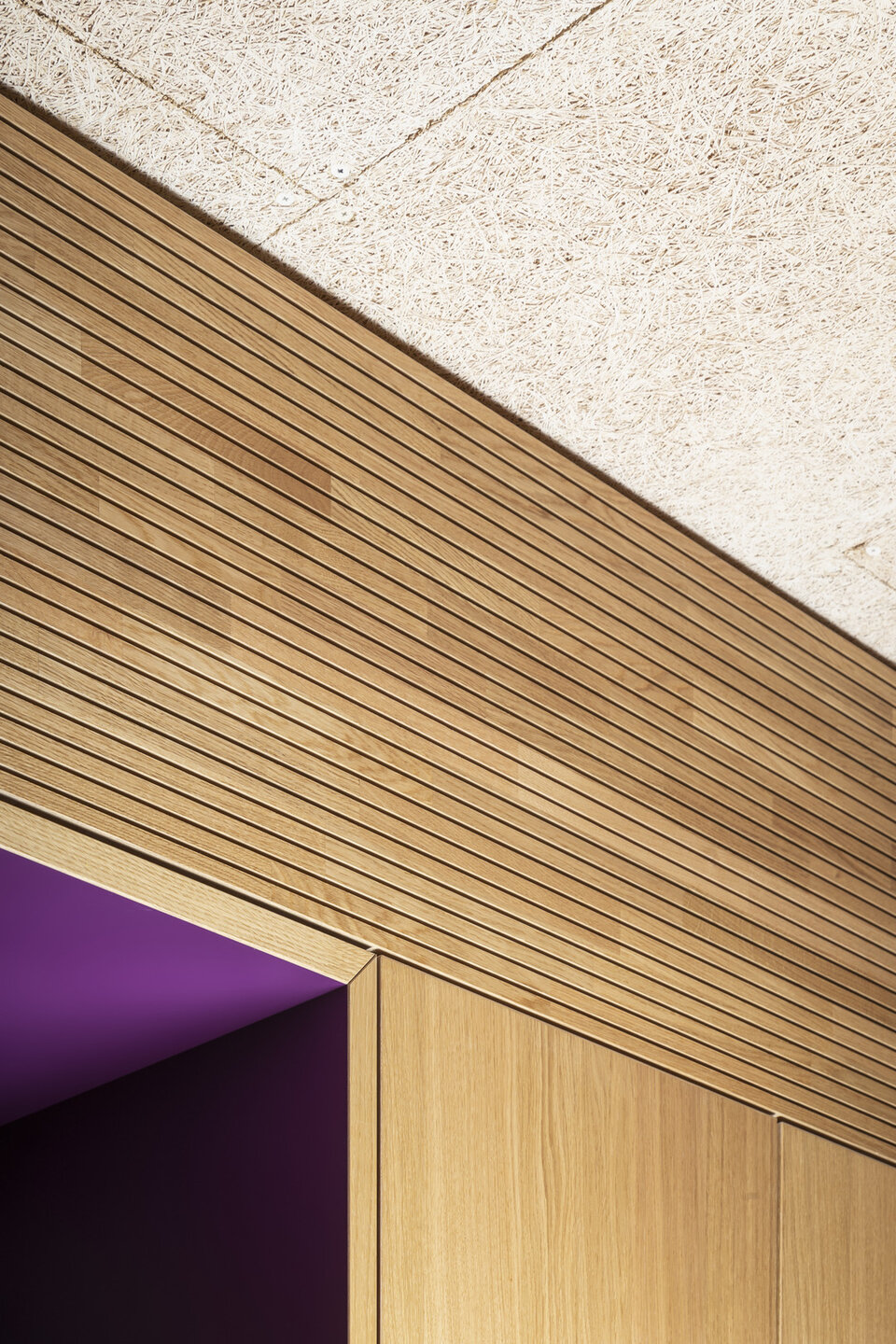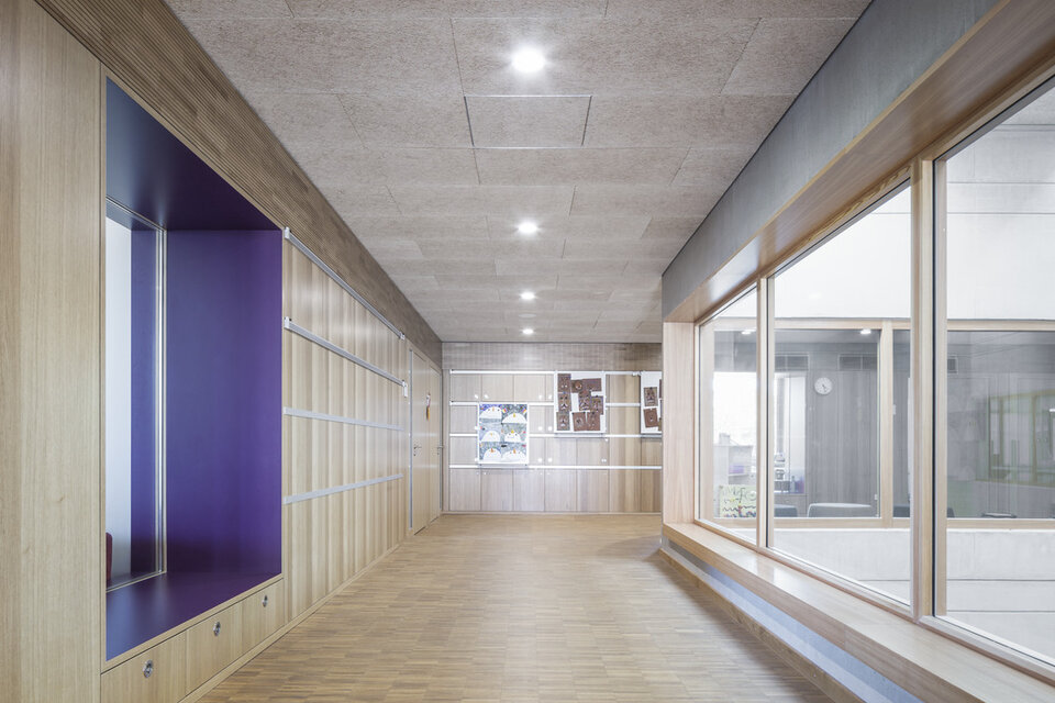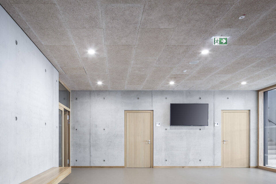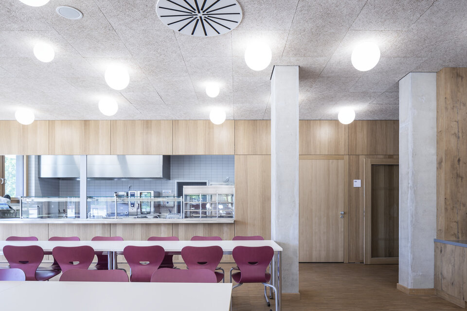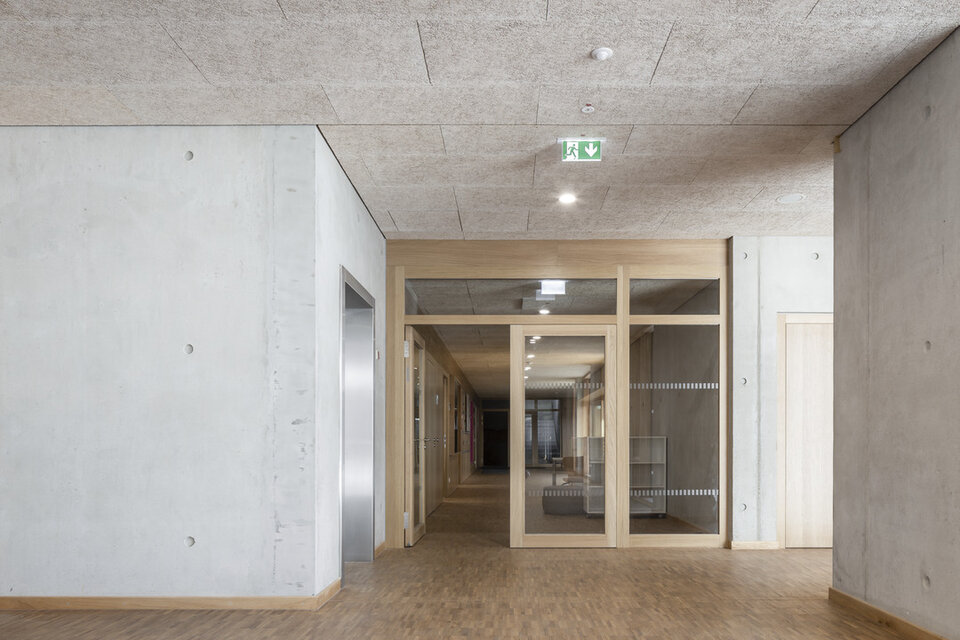 Lindner produzierte, lieferte und montierte knapp 250 Holzinnentüren sowie mehrere hundert Quadratmeter Wandbekleidung, Schranksysteme und Einbaumöbel in passendem Eichenfurnier bzw. weißem HPL-Dekor. Die Türen in den Fluren und Klassenzimmern erfüllen sämtliche Anforderungen an Brand- und Schallschutz. Als Experten für Sonderanfertigungen beauftrage man Lindner für großflächige, mobile Trennwandlösungen, die die Musikräume zur Aula hin öffnen. Für die Wandbekleidung im Eingangsbereich und in der Aula wählte man die brandschutzgeprüften, echtholzfurnierten Wandpaneele Lindner FIREwood in Baustoffklasse A2. Passend zu den anderen Holzelementen in der Aula ebenfalls in Eiche ausgeführt.