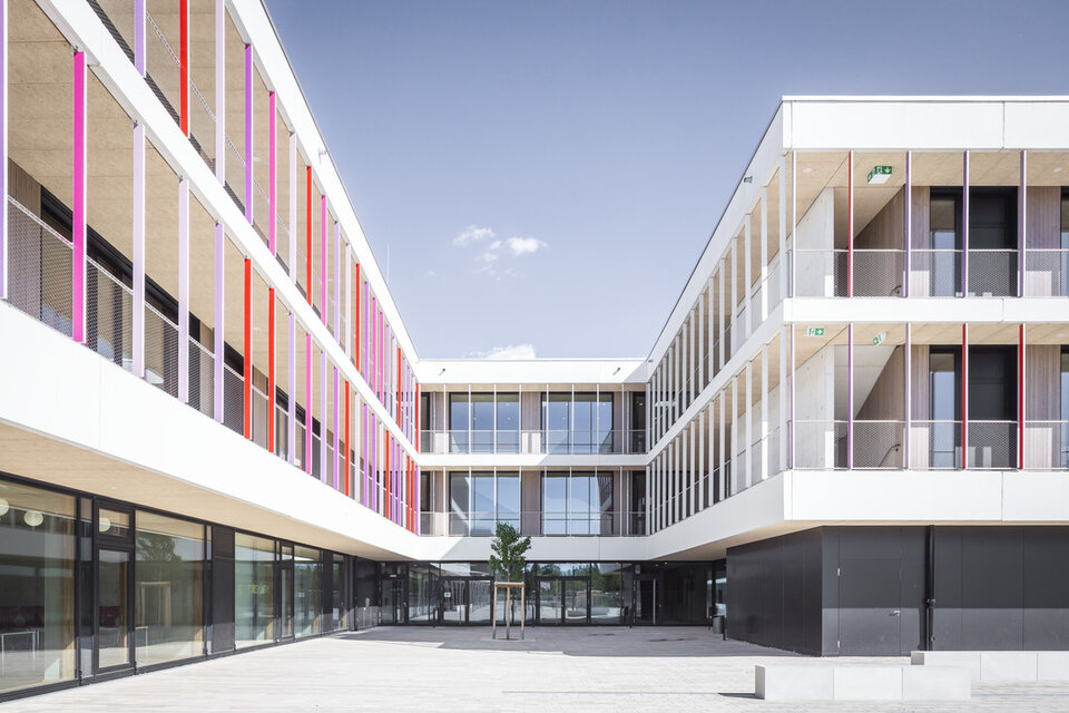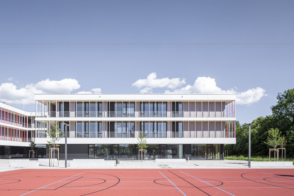 Die Karlheinz Böhm Schule in Vaterstetten bei München vereint eine Grundschule und Mittelschule unter einem Dach. Genauer gliedert sich der Gebäudekomplex in drei dreigeschossige Baukörper, die leicht versetzt in U-Form zueinander angeordnet sind. Eine durchgehende Magistrale verbindet nicht nur die Gebäudeteile miteinander, sondern führt zu einer Dreifachturnhalle mit angegliedertem Schwimmbad.