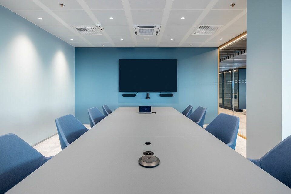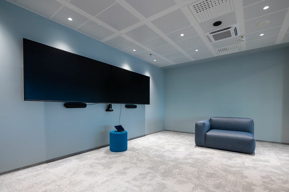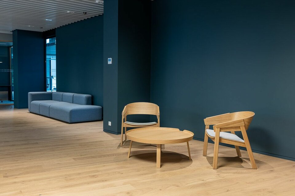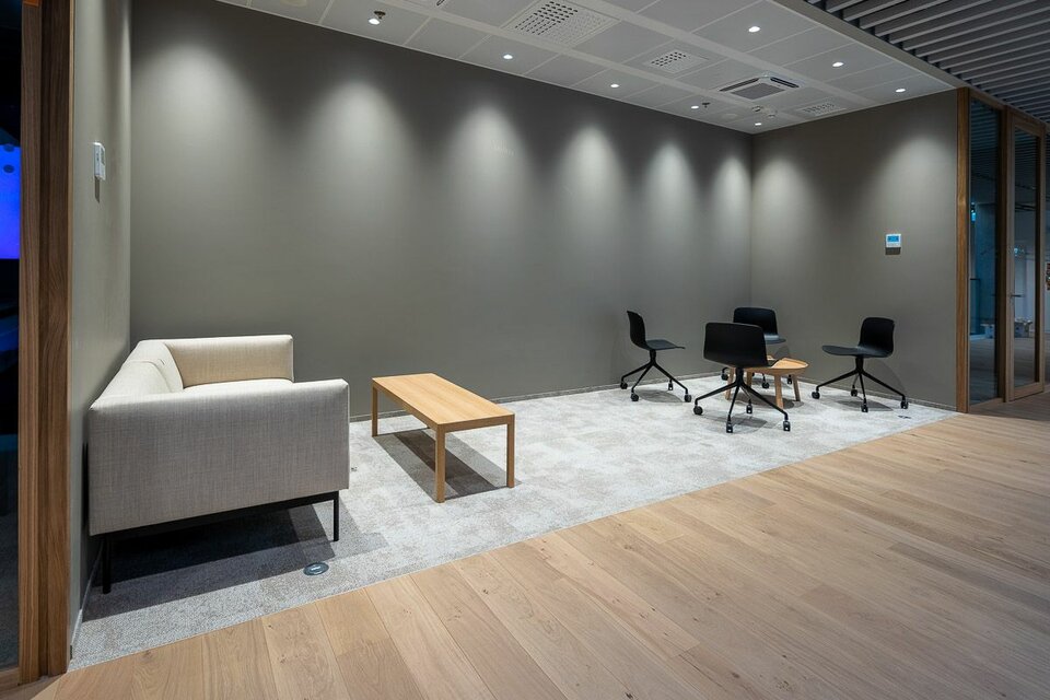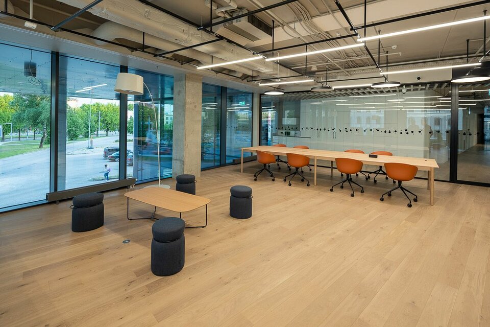 Lindner war maßgeblich an der Realisierung des nachhaltigen Konzepts beteiligt und lieferte insgesamt 11.000 m² Doppel- und Hohlböden für das Büroebäude. In den Flurbereichen und im Eingangsbereich entschied sich der Kunde für das Hohlbodensystem FLOOR and more®, um die Möglichkeit für einen Stein- oder Parkettbelag zu haben. In allen Bürobereichen verlegte unser lokaler Partner EcoGridas das Doppelbodensystem NORTEC. Zusätzlich zu unseren Bodensystemen wurden 3.500 m2 an Deckensystemen von Lindner geliefert. Für die Decken in den Arbeitsbereichen wurden 1.700 m2 Lindner-Metalldecken nach Maß gefertigt, die als homogene Deckenfläche dienen. In den Besprechungsbereichen wünschte sich der Kunde eine Bandrasterdecke, um die Möglichkeit zu haben, Trennwände zu befestigen und somit flexibel zu bleiben. Im Eingangsbereich wurden über 200 m2 unseres RIBline timber slat Deckensystems installiert, was den Nachhaltigkeitsfaktor des Business Centers widerspiegelt, da das Material aus unserem 100% recycelten Calciumsulfat besteht und mit einem natürlichen Eichenfurnier veredelt ist.