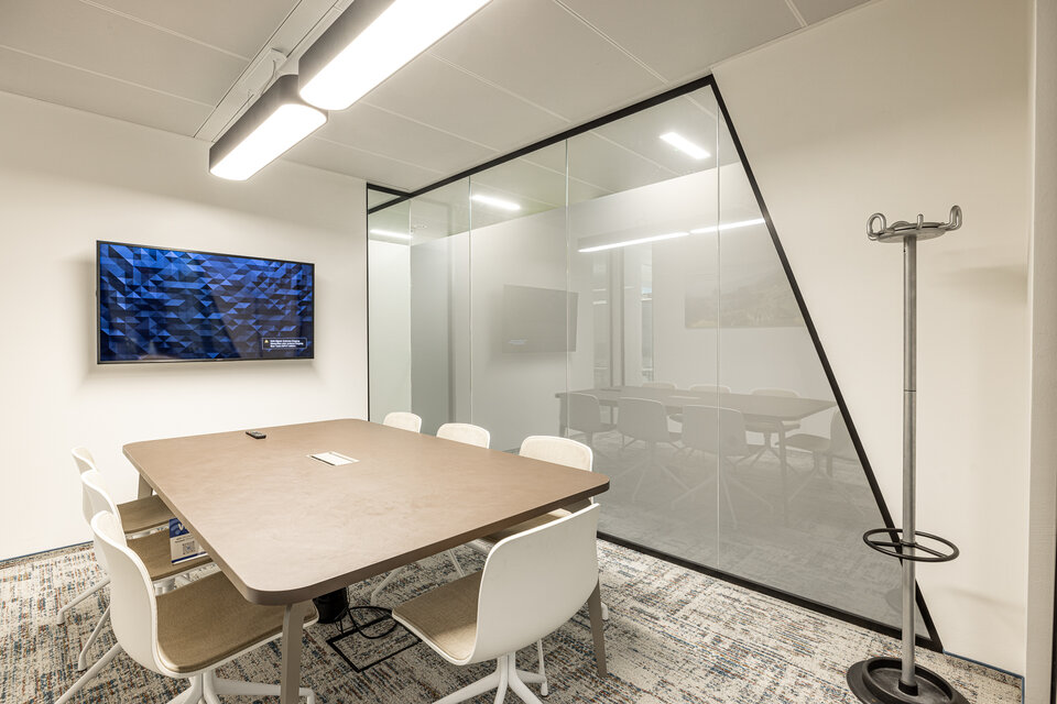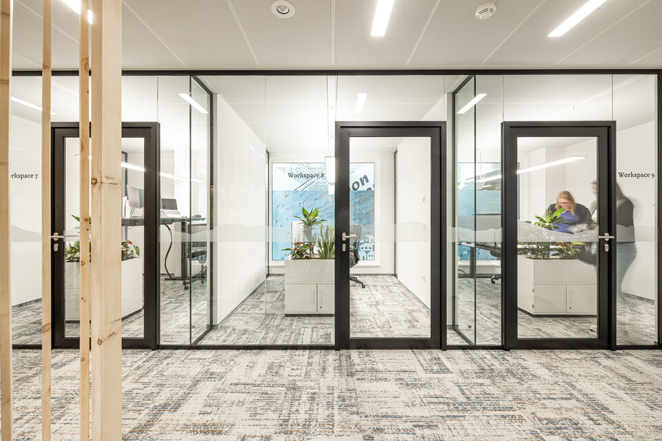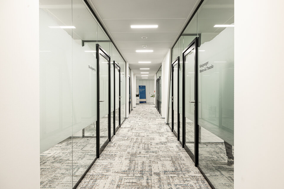 Zur Raumtrennung kam das Glastrennwandsystem Lindner Life Pure 620 zum Einsatz. Besonderheit: Das System wurde mit einer Milchglasfolie ausgeführt, die dank einer elektronischen Steuerung zwischen transparent und transluzent wechseln kann.
