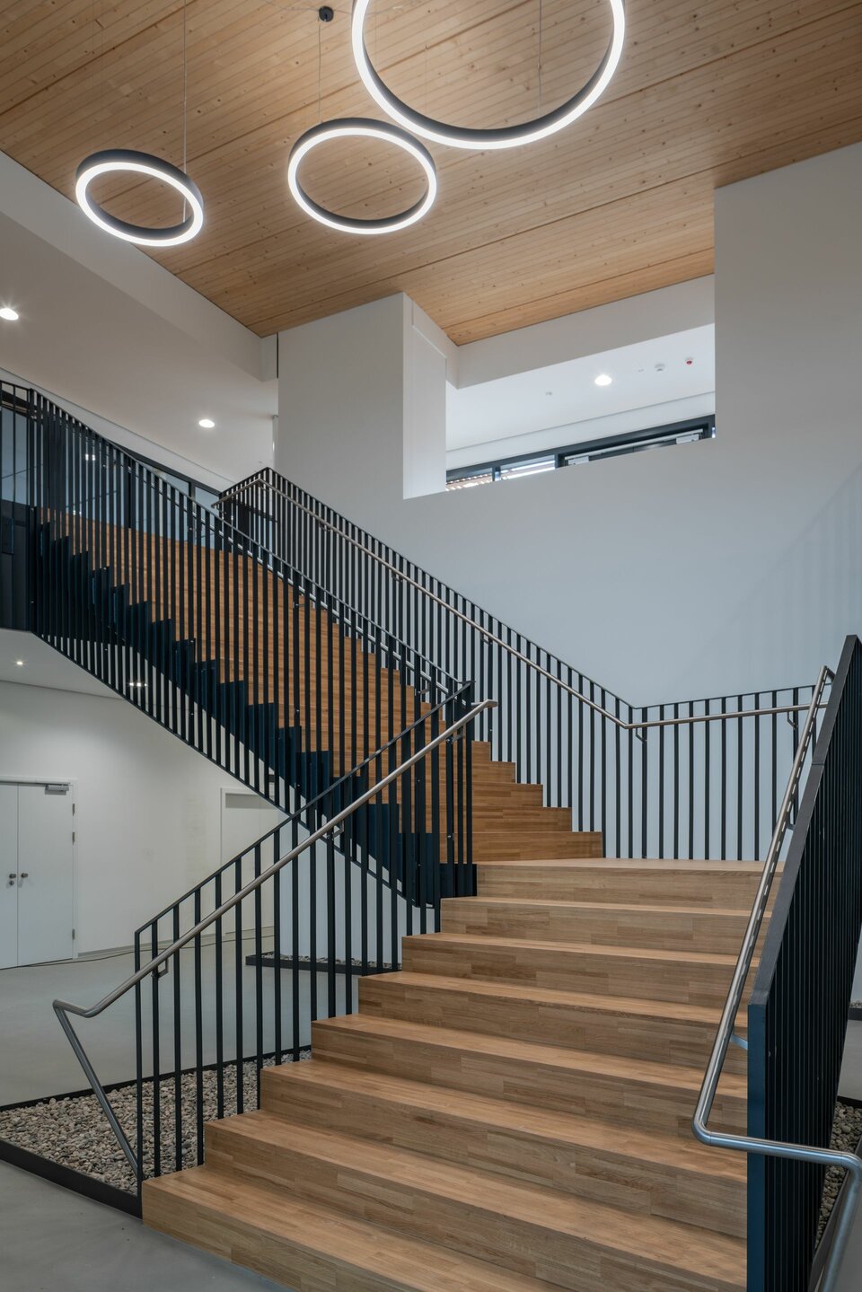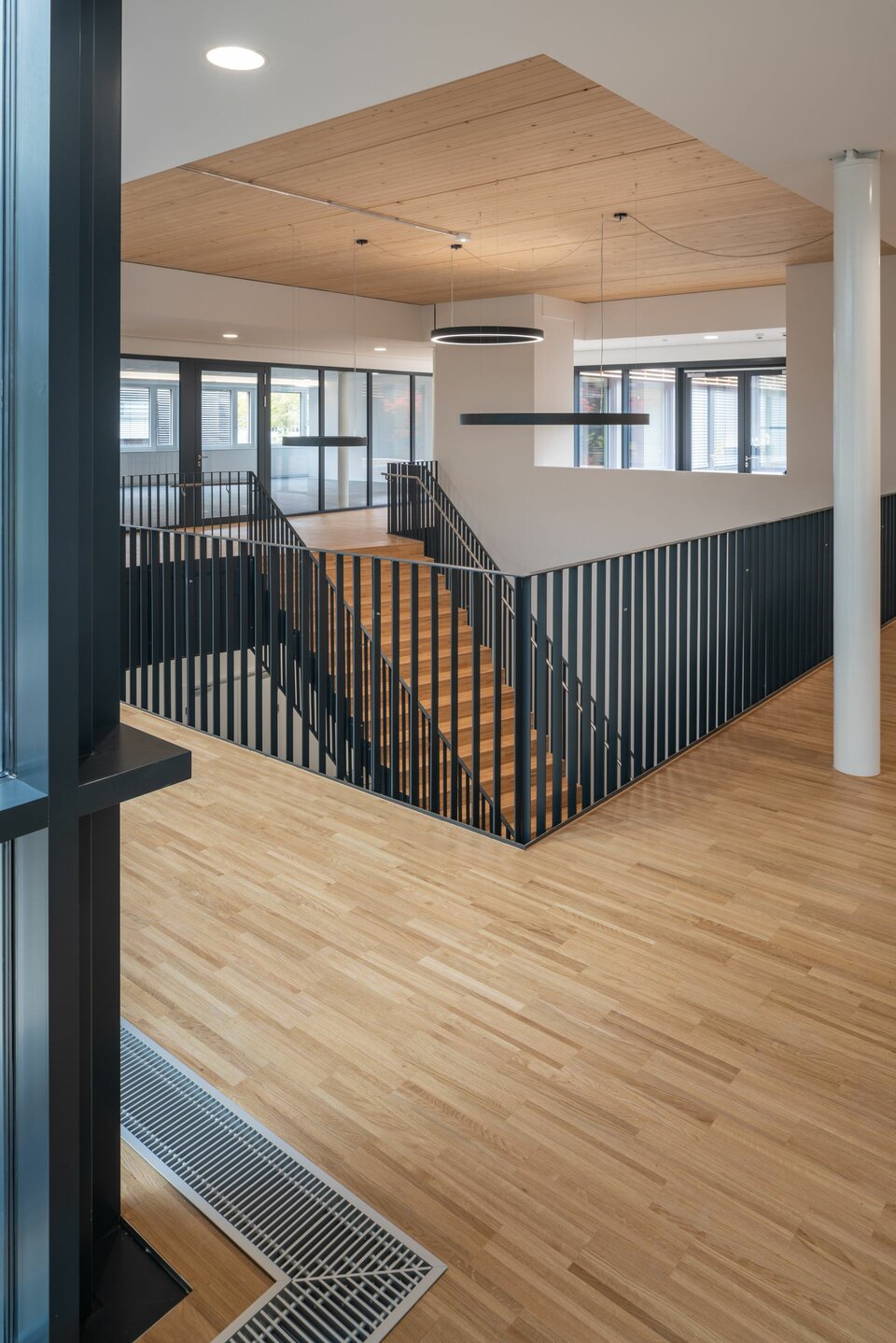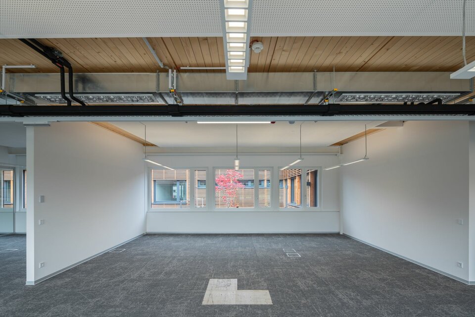 Für die flexiblen Mietflächen wählte man möglichst modulare, rückbaubare Ausbausysteme, die auch den hohen Nachhaltigkeitsansprüchen des HTC entsprechen. So finden sich neben Heiz-/Kühlregister vor allem verschiedene Bodensysteme von Lindner. Um das Thema Klimaschutz und Kreislaufwirtschaft auch direkt im Gebäude umzusetzen, kam die Idee, für den Doppelboden gebrauchte Platten einzusetzen. Diese wurden aus einem Bestandsgebäude ausgebaut, im Lindner Werk in Arnstorf überarbeitet und schließlich im HTC Villach wieder eingebaut. Der aufbereitete Doppelboden LOOP prime überzeugt mit identischen technischen und bauphysikalischen Eigenschaften wie sonst neue NORTEC Platten, einschließlich umlaufenden Kantenschutz. Darüber hinaus verfügt die LOOP prime über eine um 75 % bessere CO2 -Bilanz und wurde mit Cradle to Cradle Certified® Gold ausgezeichnet.