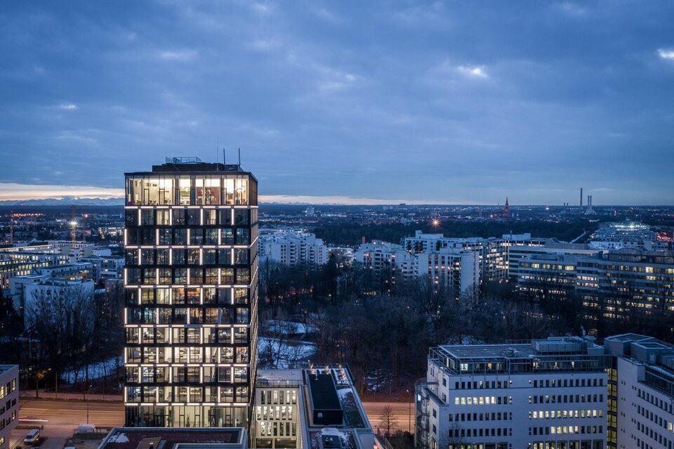 Direkt hinter dem Ostbahnhof in der Rosenheimer Straße 141 e-h entstand das HIGHRISE one, ein 17-stöckiger Büroneubau mit einer speziellen baulichen Leichtigkeit, die durch eine offene, transparente Fassade zusätzlich betont wird. Vision des HIGHRISE one ist es, eine effiziente und harmonische Arbeitswelt zu schaffen. Deshalb wurde besonders großer Wert auf die Details gelegt. Alle gängigen Bürokonzepte lassen sich auf insgesamt rund 19.000 m² Bürofläche ganz nach Raumbedarf im Sockel und im Turm darstellen. Um ein effizientes Arbeitsklima zu schaffen wurden die Besprechungsräume und andere Treffpunkte zentral lokalisiert, die Arbeitsplätze haben Blick nach draußen. Eine Etage im Sockelbereich misst etwa 2.200 m², im Turm ca. 740 m².