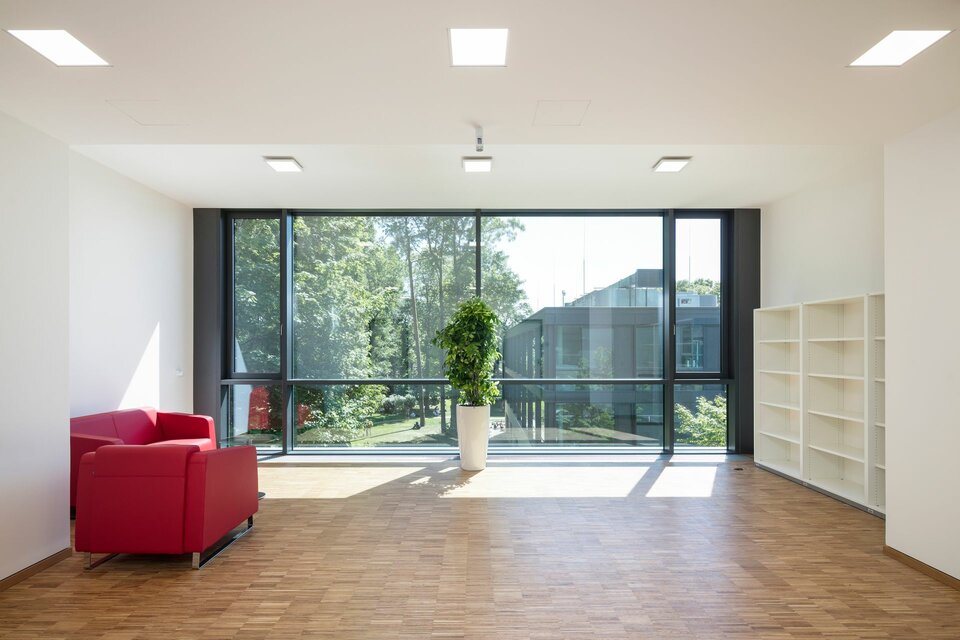 Lindner war im Zuge dieses Bauvorhabens als Generalunternehmer für den Innenausbau zuständig. Darin inbegriffen war die Koordination und Ausführung zahlreicher Ausbaugewerke wie Trockenbauarbeiten oder die Installation hochwertiger Corian-Waschtische sowie die Montage von Produkten aus dem Spektrum der Lindner Group. Hierzu gehörten Glastrennwände des Typs Lindner Life Freeze 137 mit integrierten Türen sowie Holztüren.