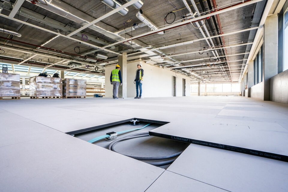 n dem neuen Gebäude verbaute Lindner 12.500 m² des eigens produzierten Doppelbodensystems NORTEC. Die nichtbrennbaren Bodenplatten zeichnen sich aus durch exzellente Tragfähigkeit, optimalen Schallschutz und einen hohen Begehkomfort. Dadurch dass sich die NORTEC-Platten jederzeit herausnehmen lassen, bieten sie maximale Flexibilität für Umgestaltungsmaßnahmen oder kurzfristige Änderungen.